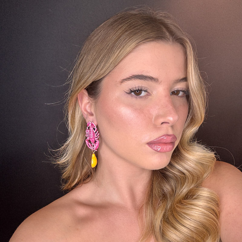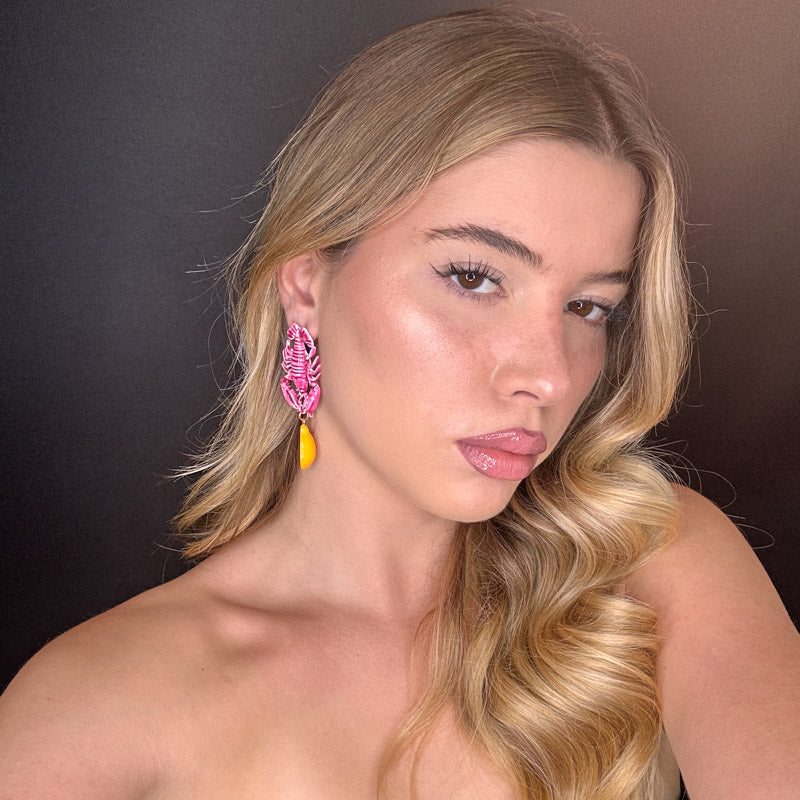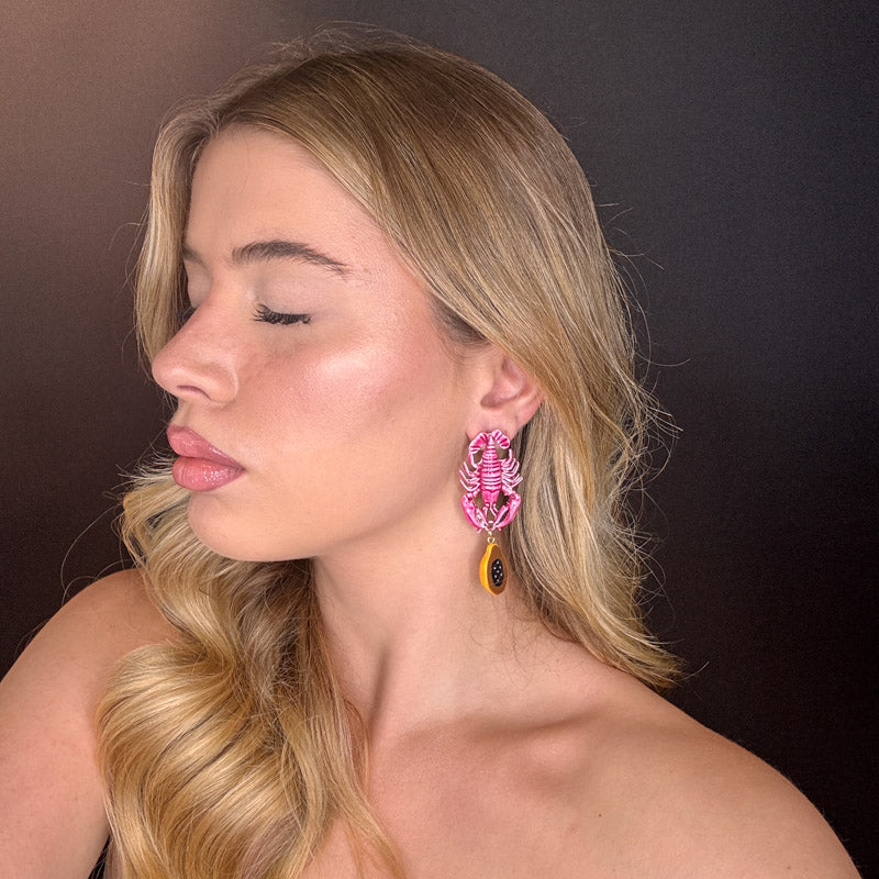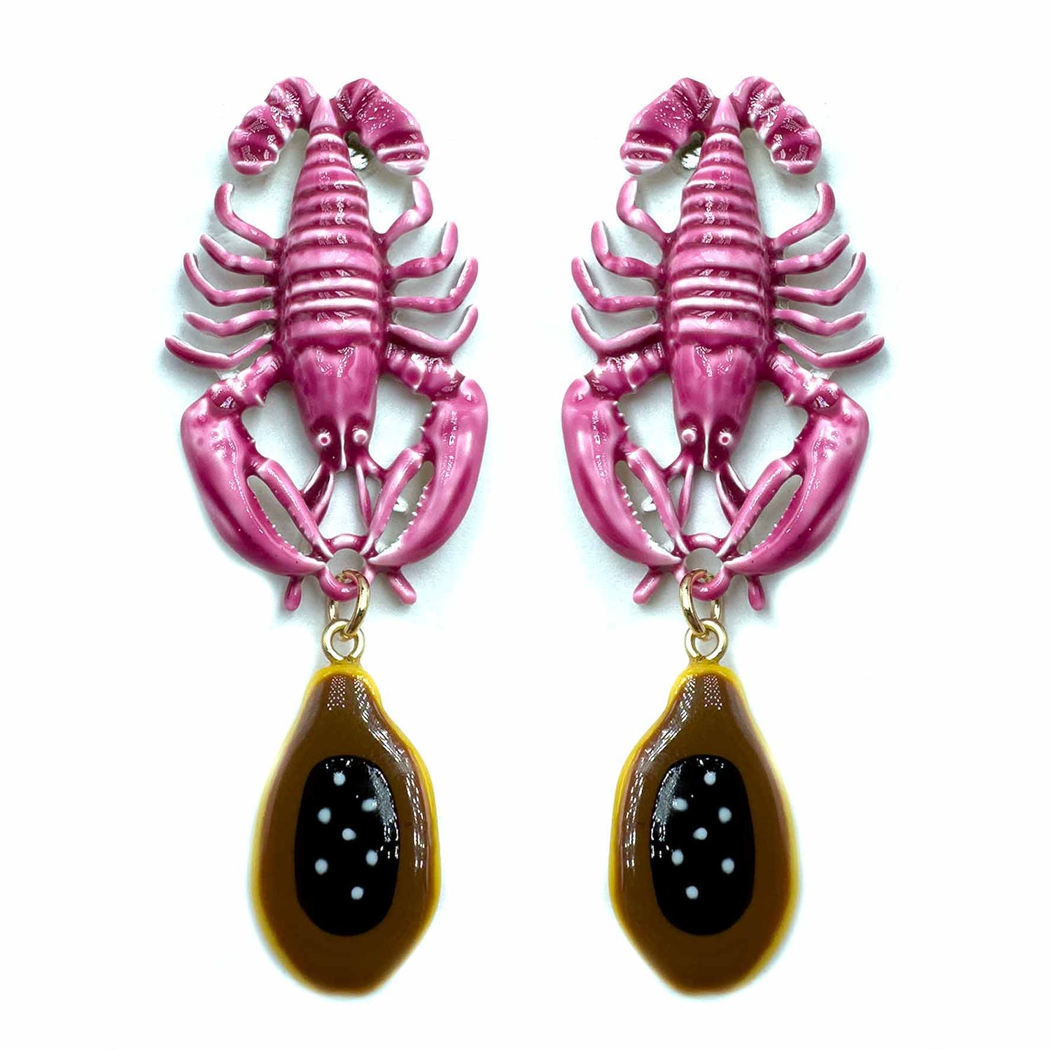 Orecchini a forma di aragosta con papaya, struttura gold plated.