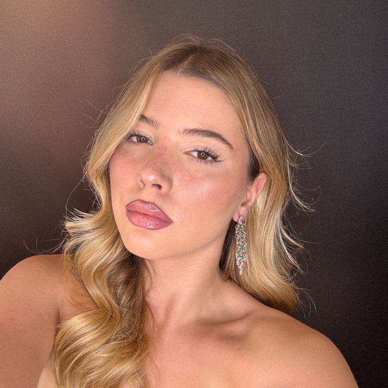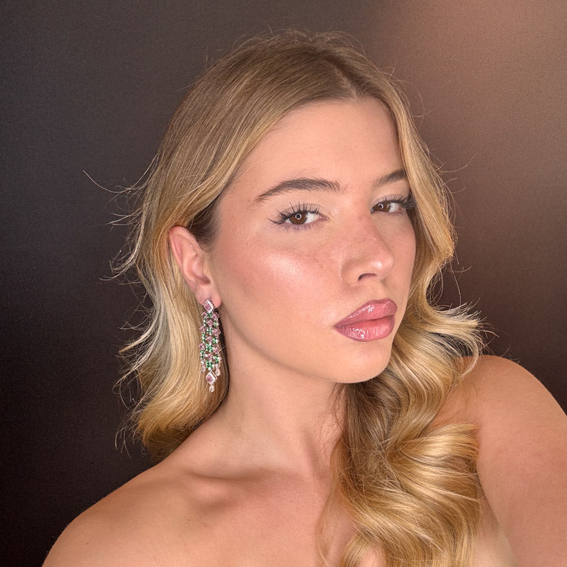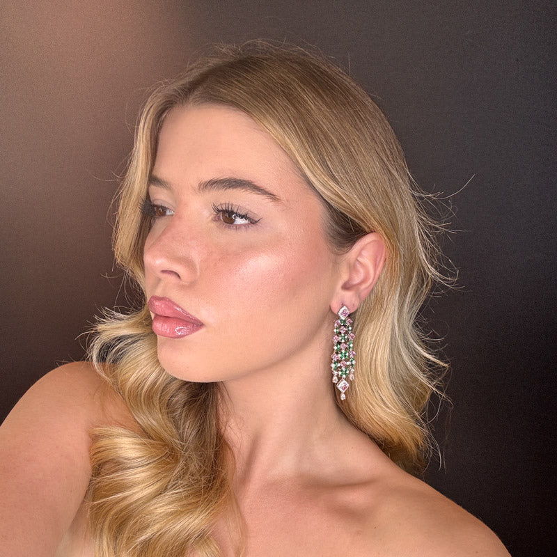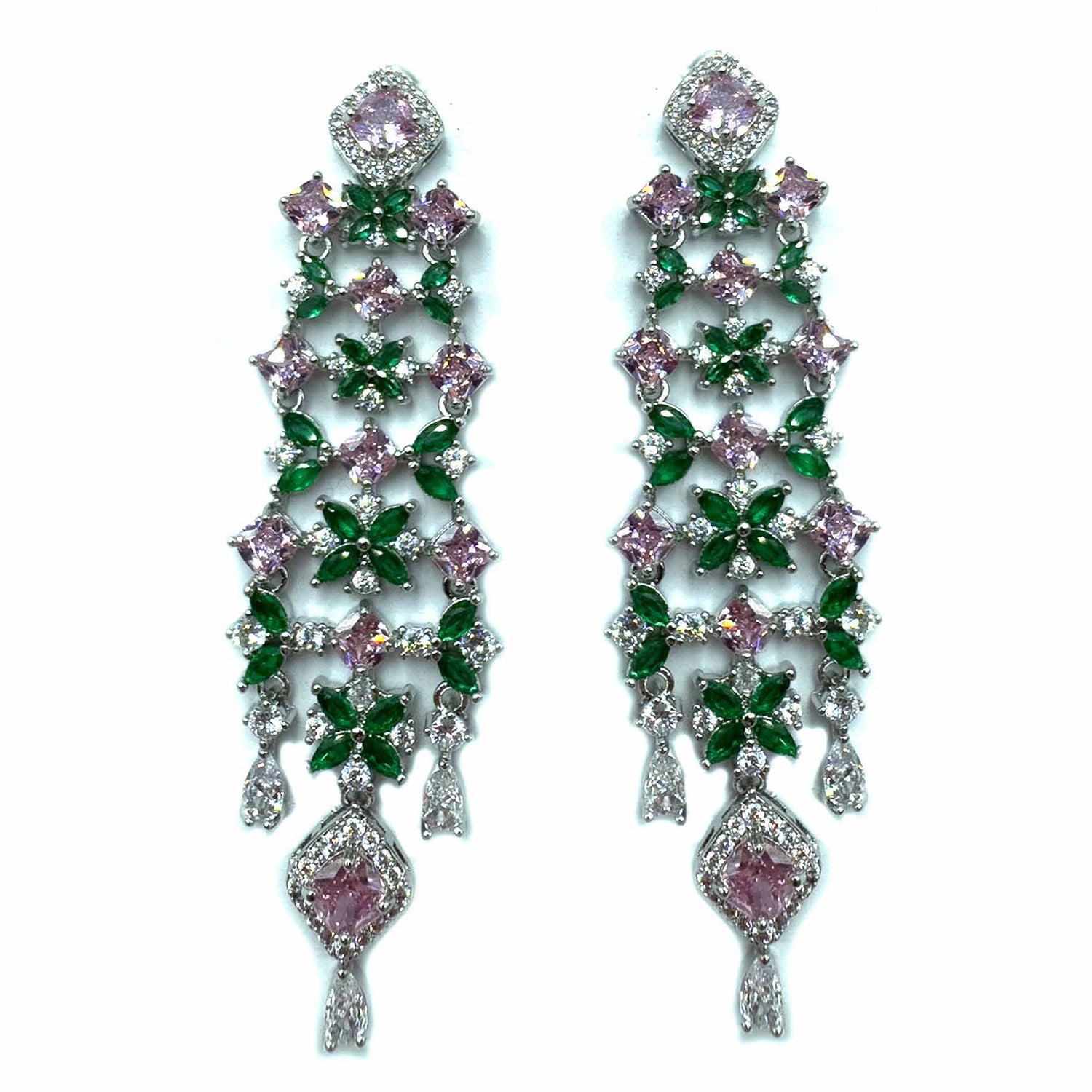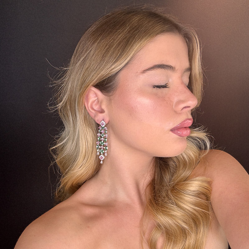 Orecchini a forma di cascata di pietre e foglioline preziose, con base silver plated.