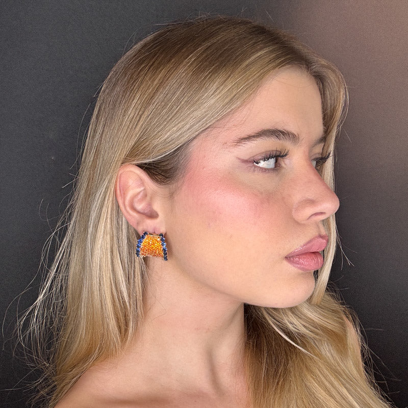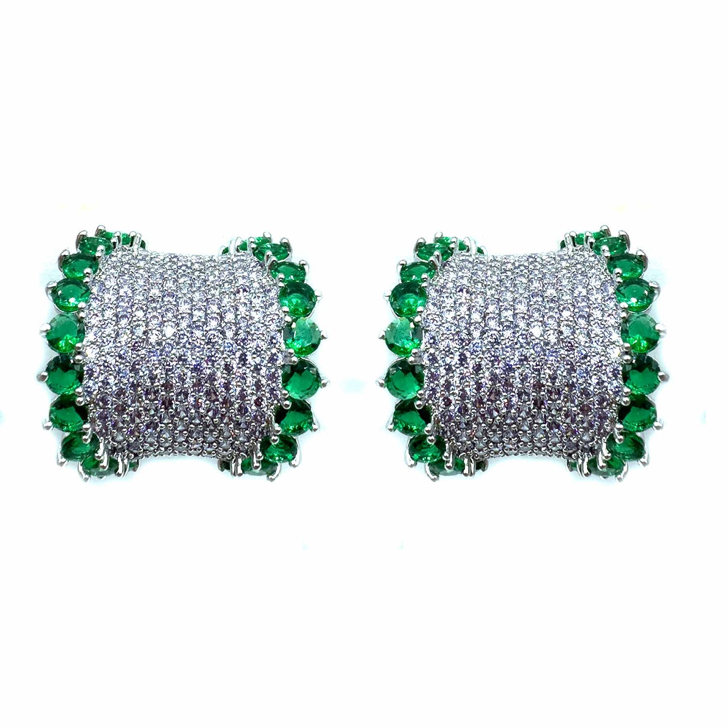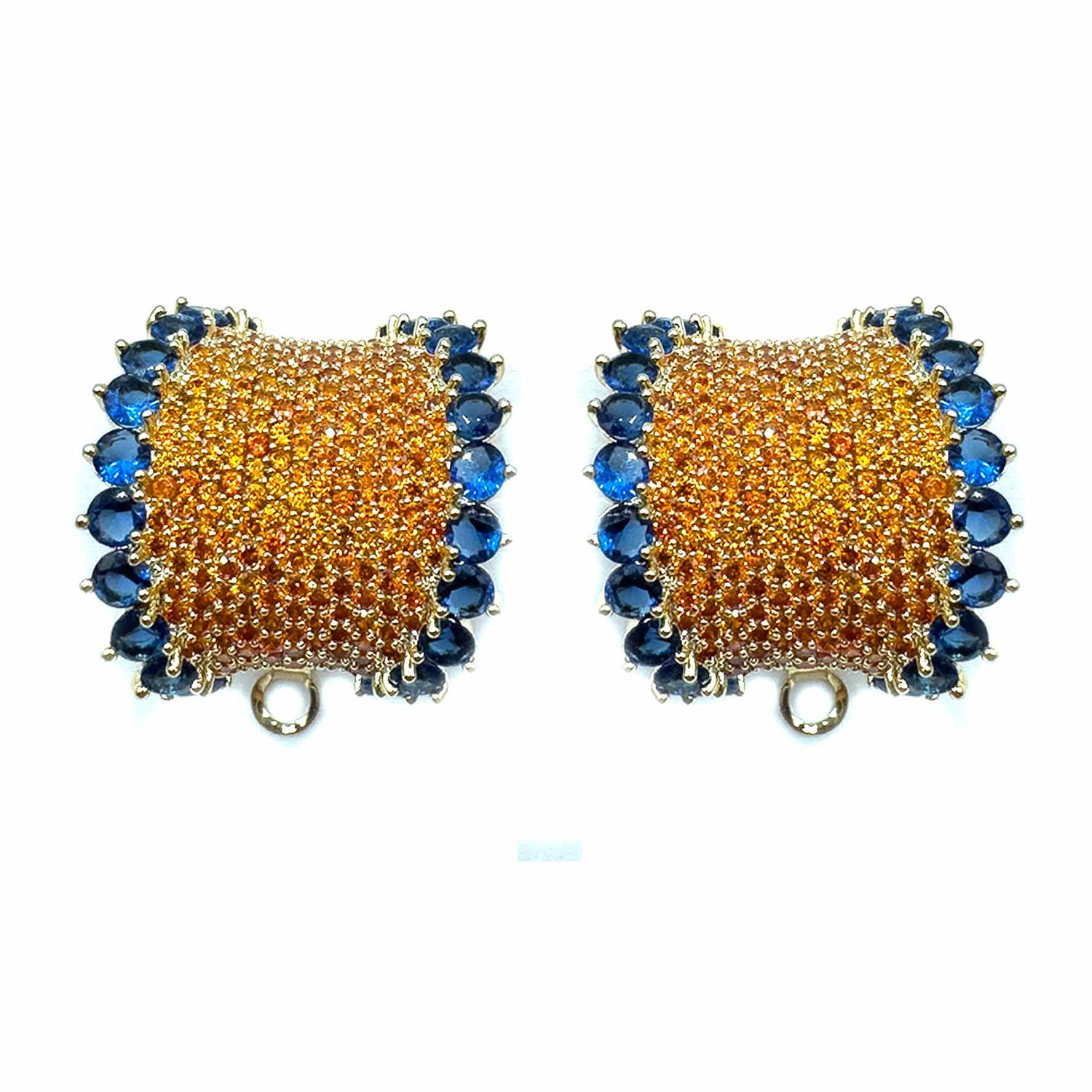 Orecchini pendenti a forma di cerchi, decorati da un pavè colorato ed incorniciati da una sequenza di pietrine preziose, placcati gold/silver