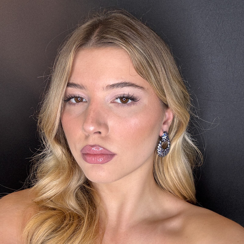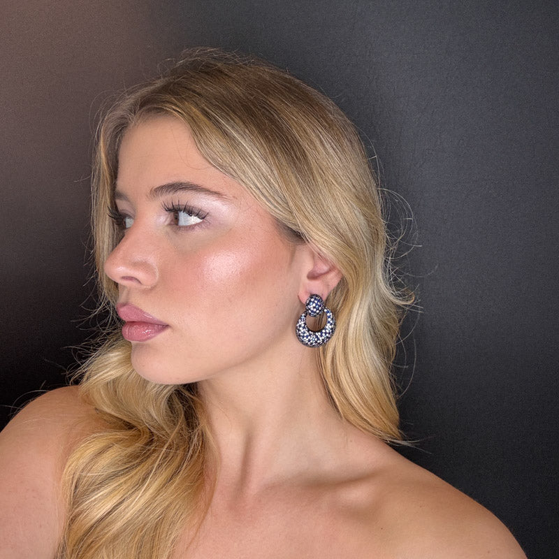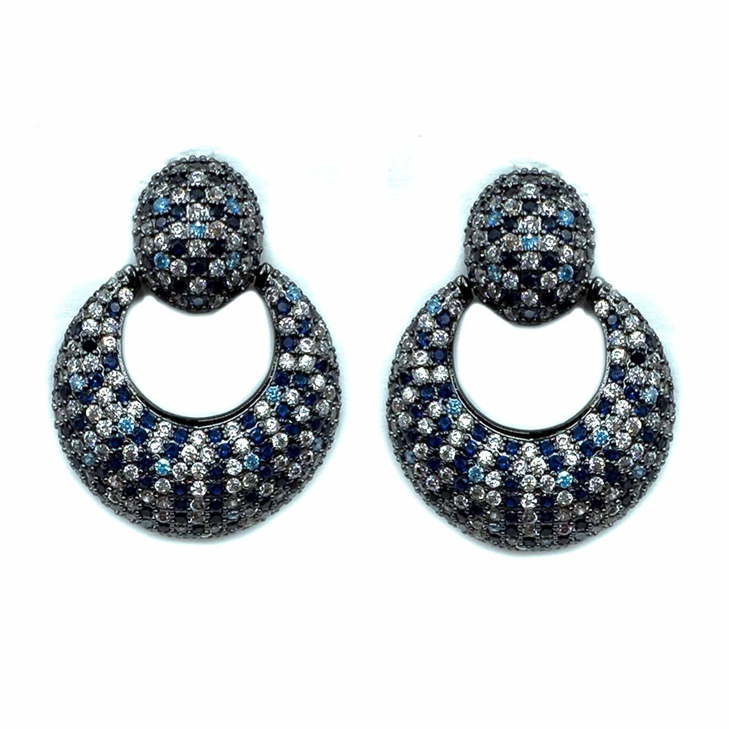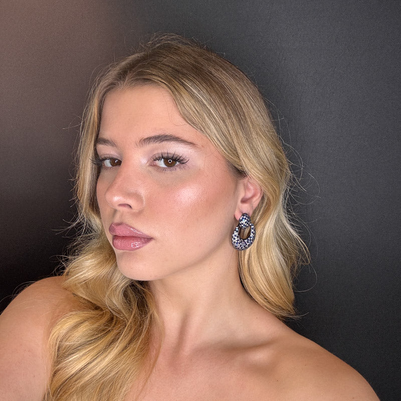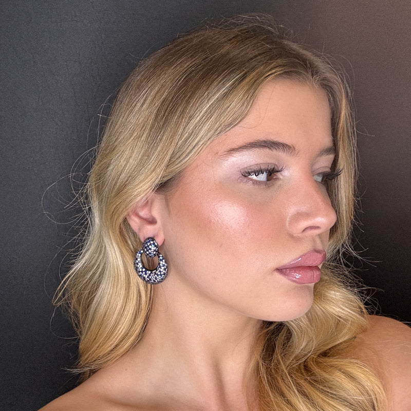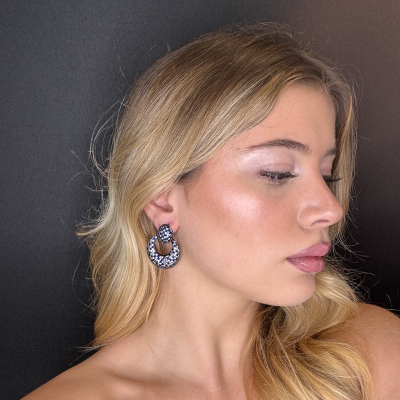 Orecchini pendenti a forma di cerchi, imprezziositi di pavè in un motivo che ricorda i mosaici, placcati dark