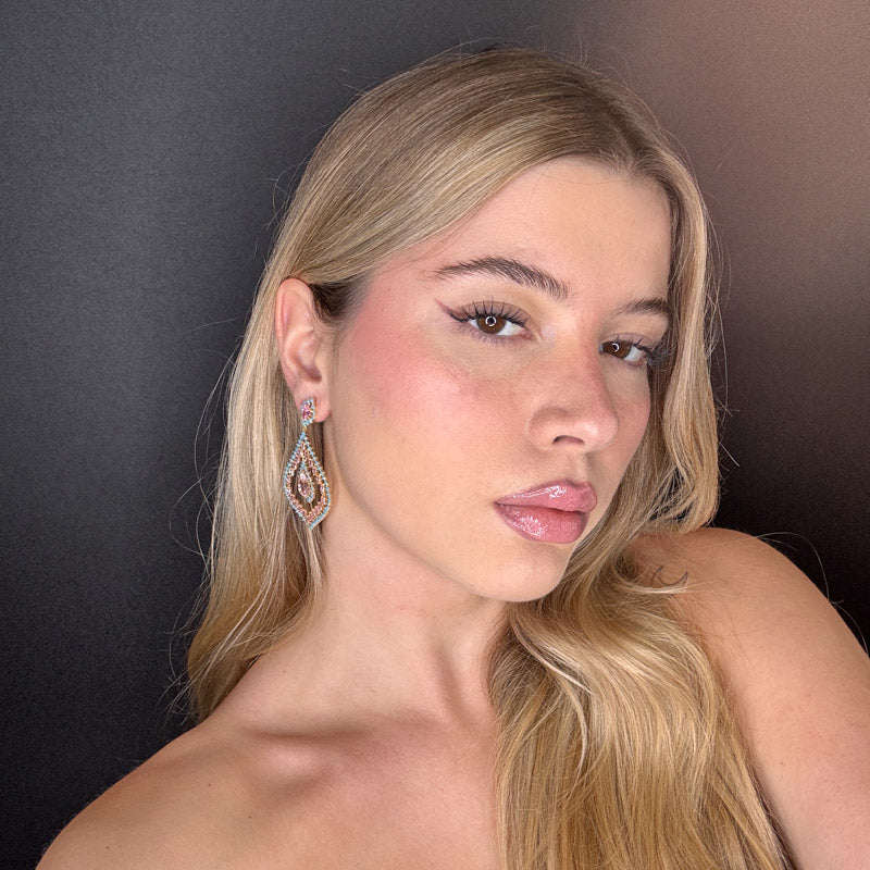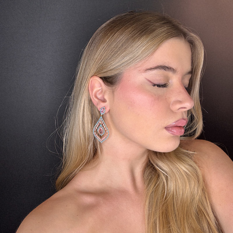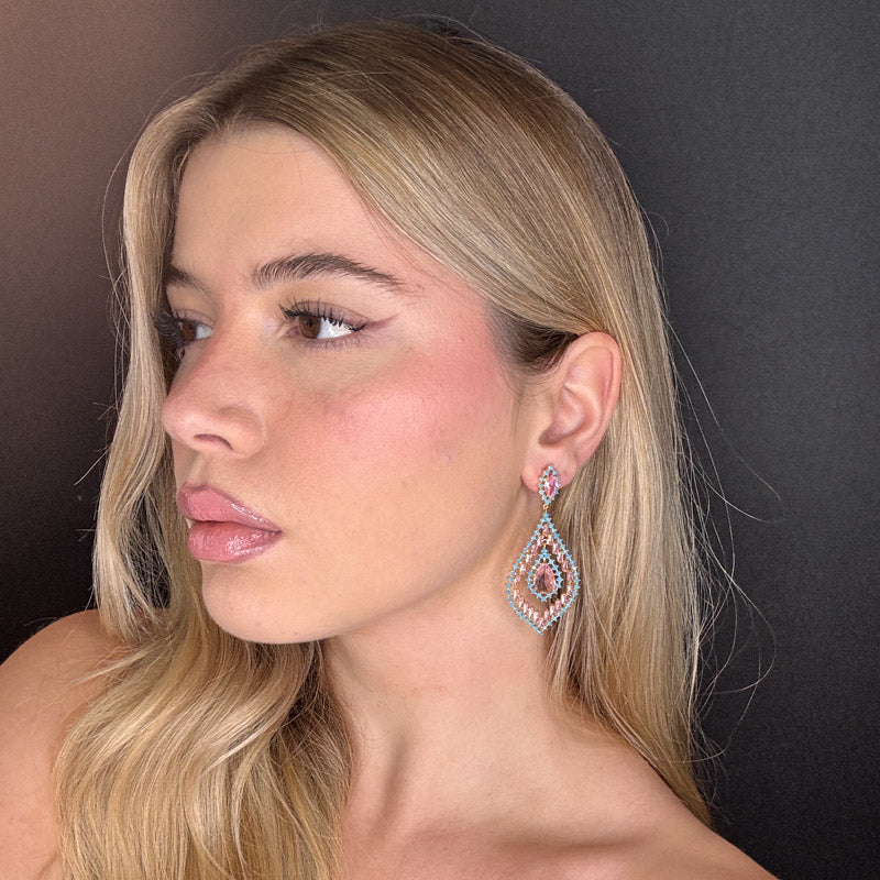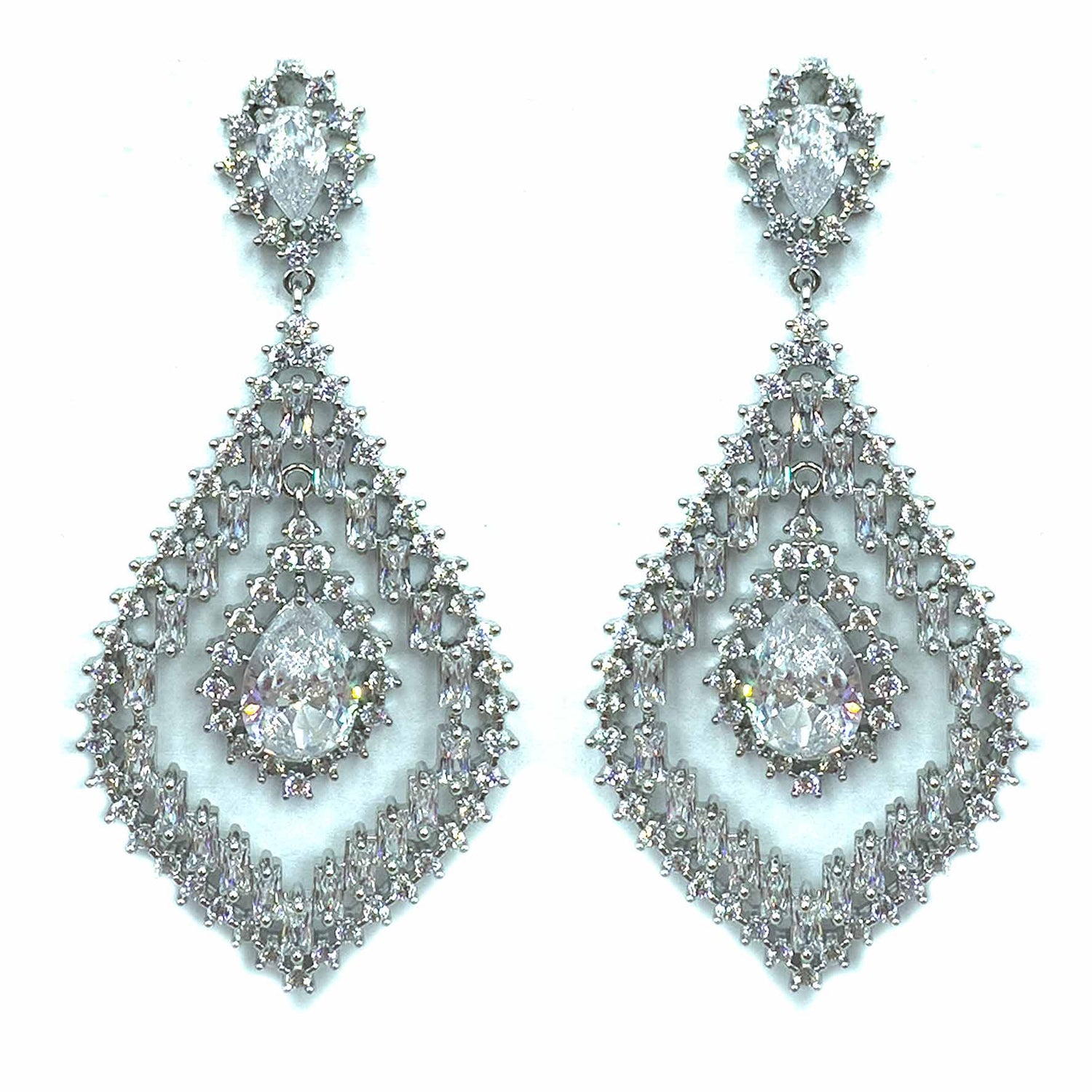 Orecchini pendenti a forma di doppia goccia con ciondolo, decorati da pietre cristallo e zirconi incastonati, placcati gold/silver