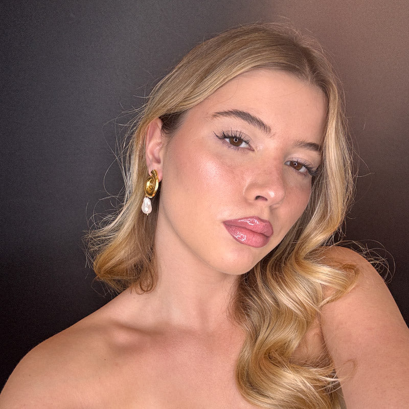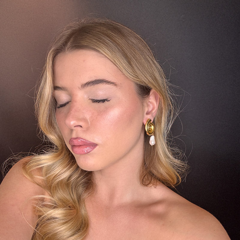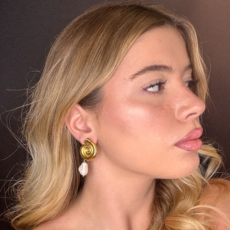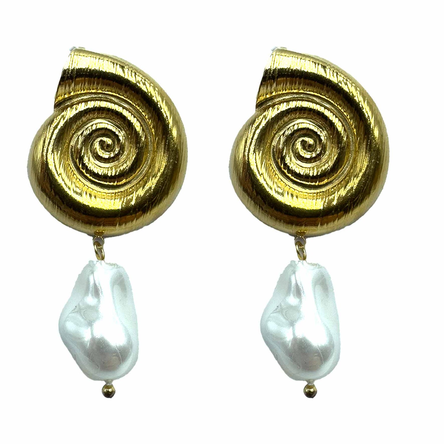 Orecchini a forma di conchiglia con perlina pendente irregolare, struttura gold plated.