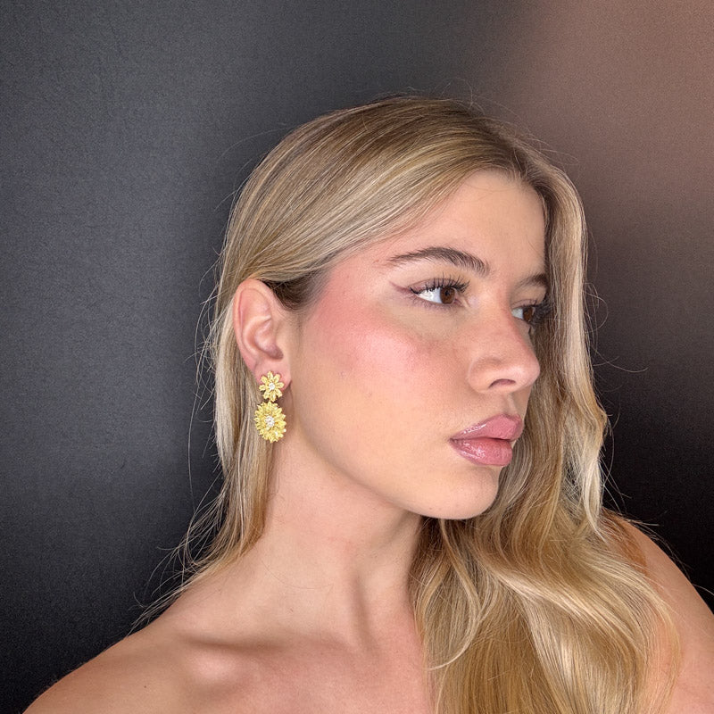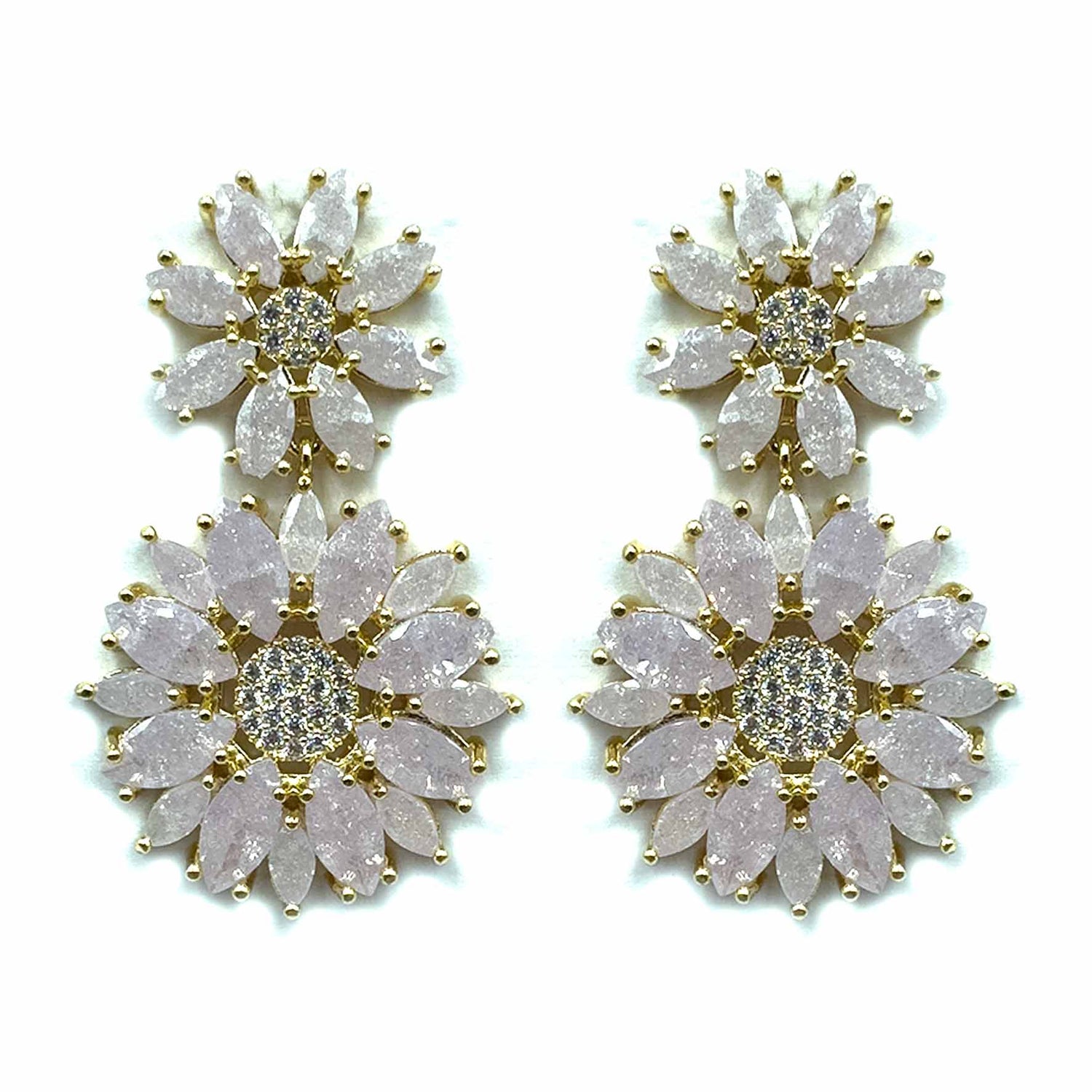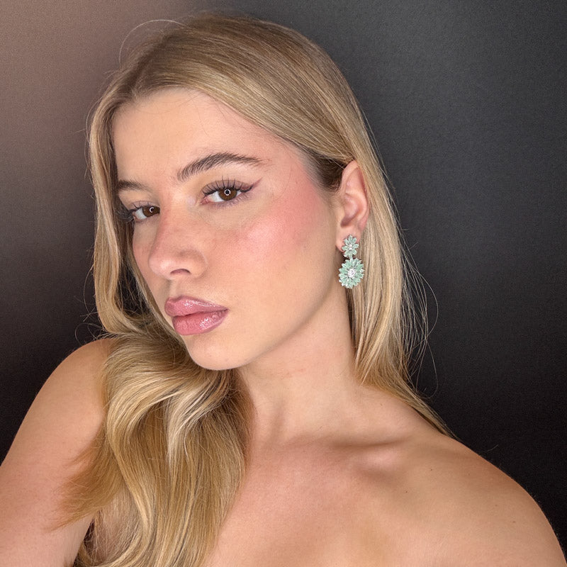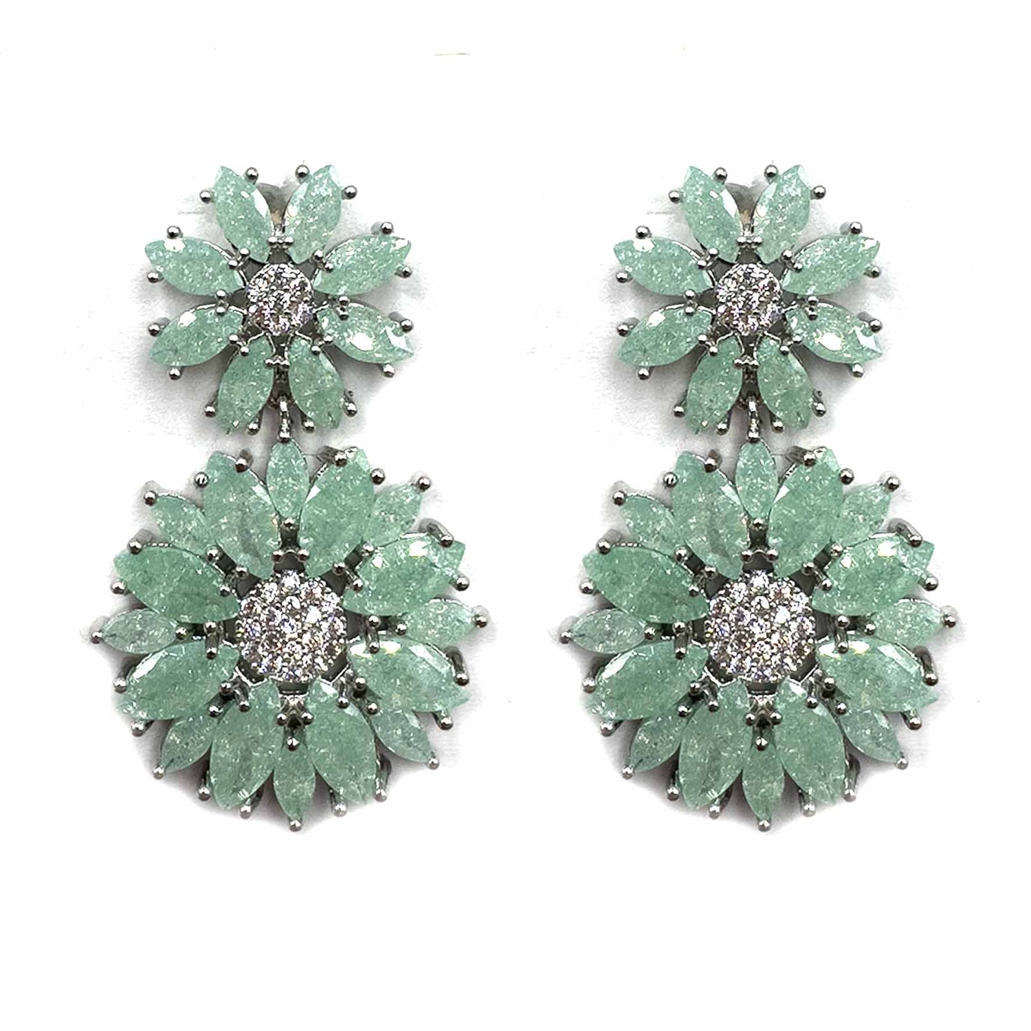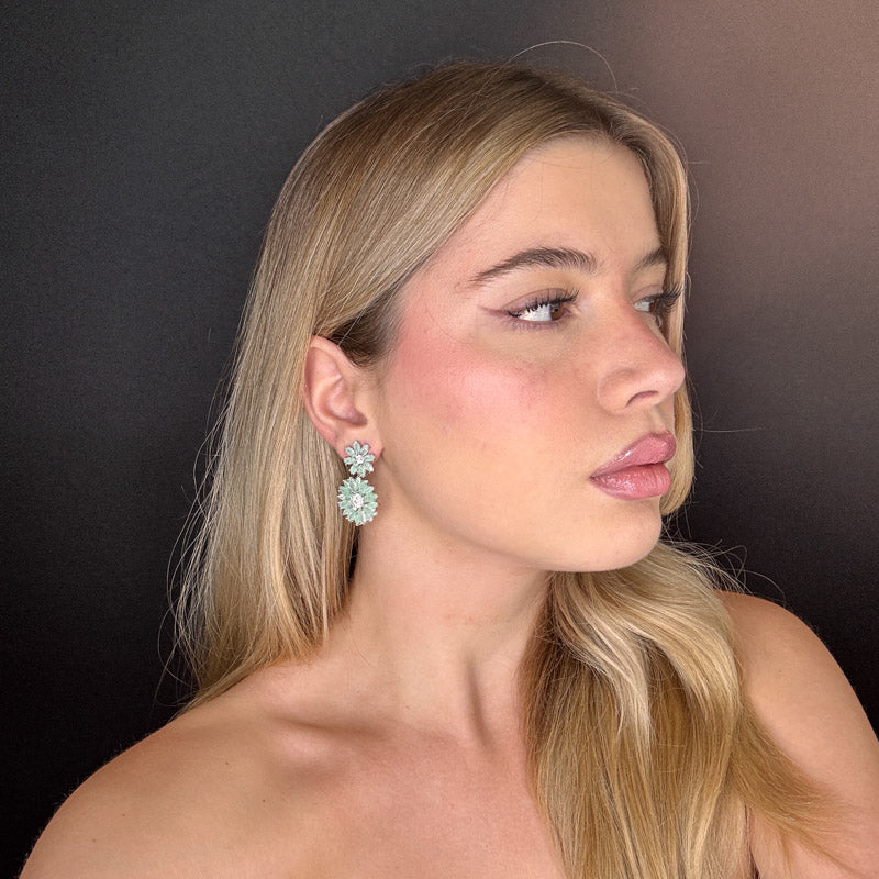 Orecchini pendenti a forma di margherite, con pietre color cristallo e verde chiaro incastonate, e pavè come pistillo del fiore che fa da bottone, placcati gold