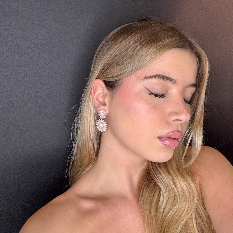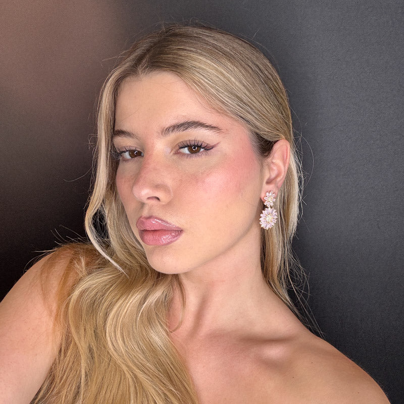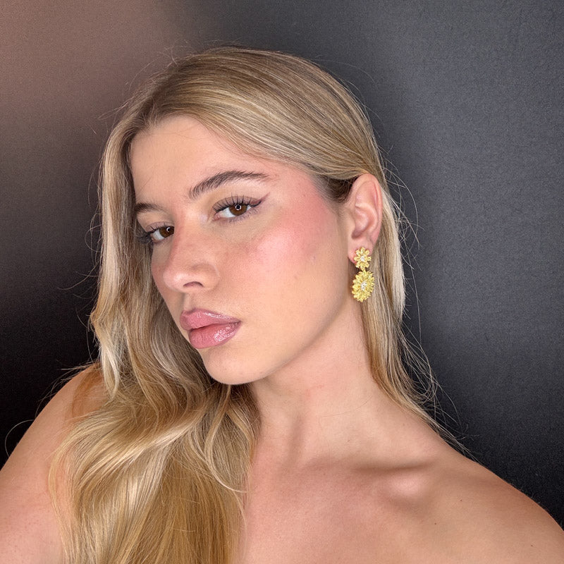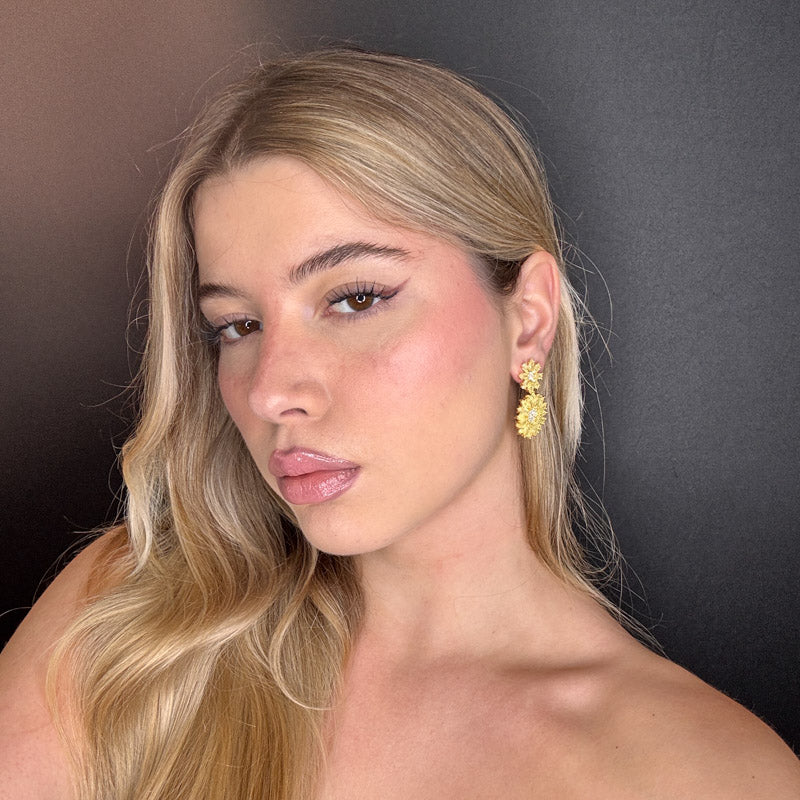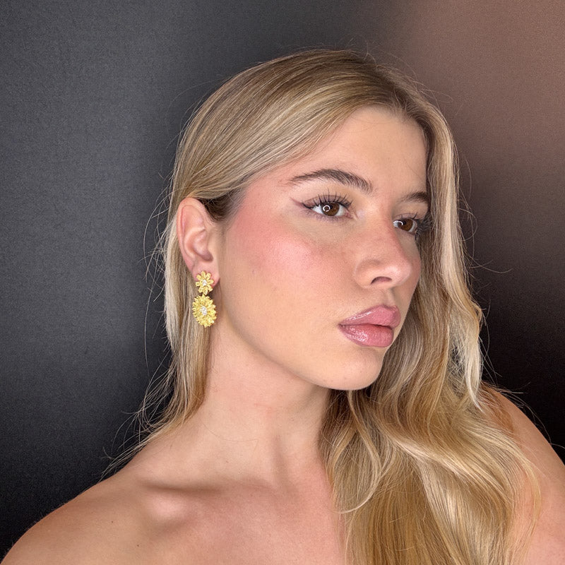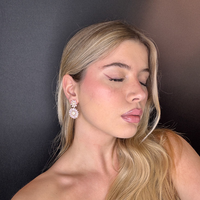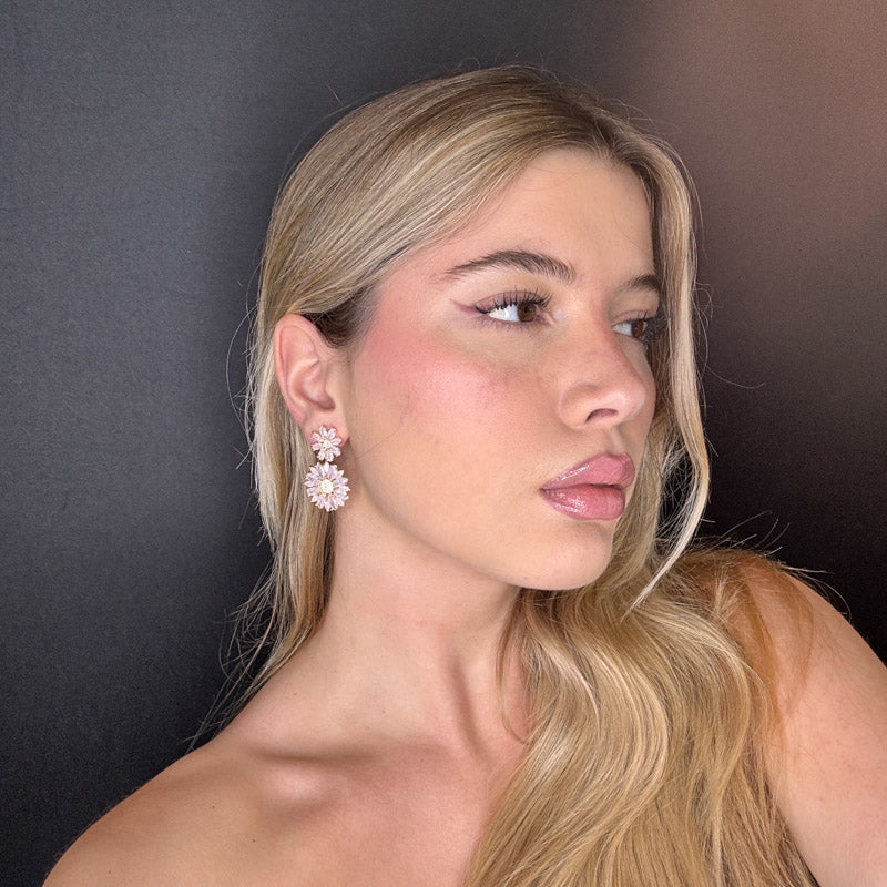 Orecchini pendenti a forma di margherite, con pietre color cristallo e verde chiaro incastonate, e pavè come pistillo del fiore che fa da bottone, placcati gold