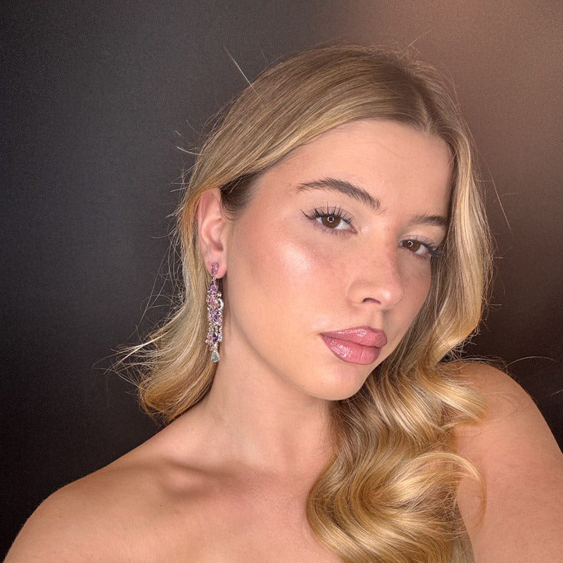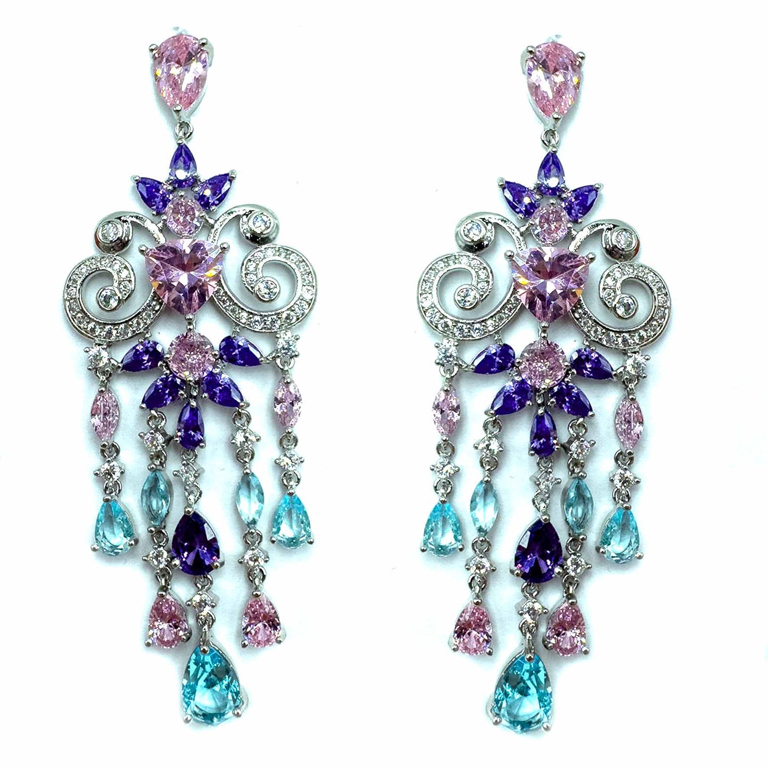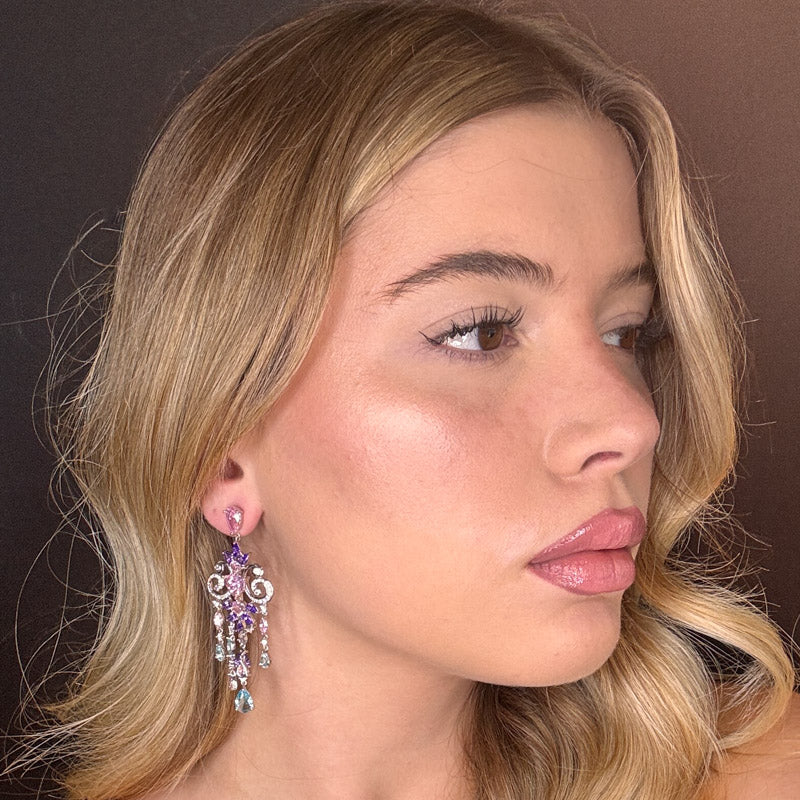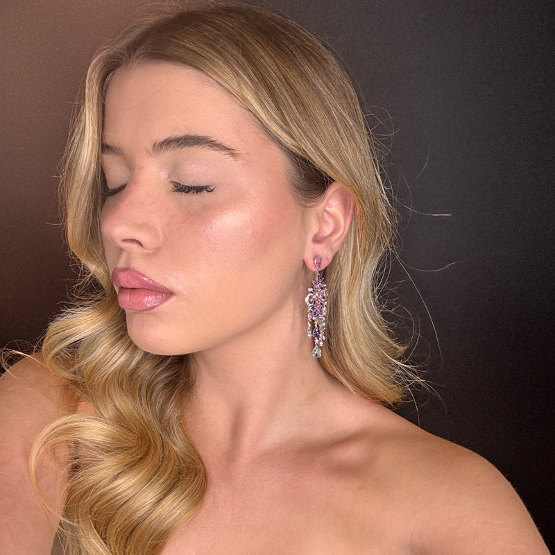 Orecchini pendenti a forma di composizione di cristalli e zirconi sui toni del rosa lillac e azzurro, placcati silver