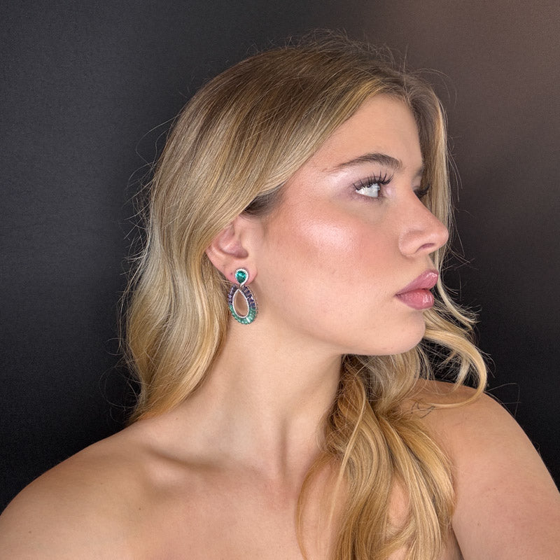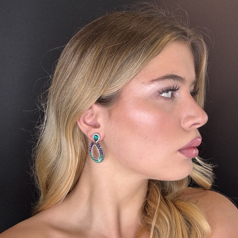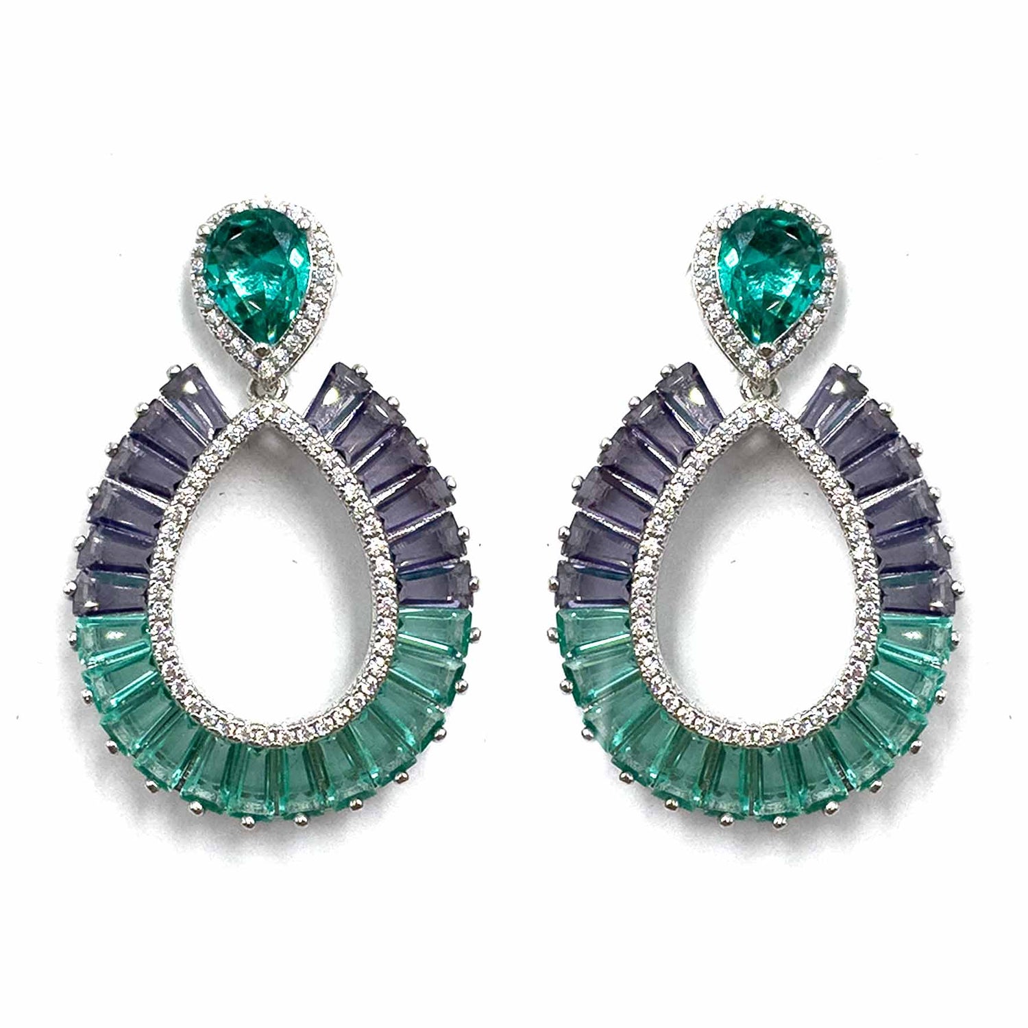 Orecchini pendenti a goccia formata da cristalli di colore verde acqua e viola, con definizioni di zirconi cristallo placcati silver