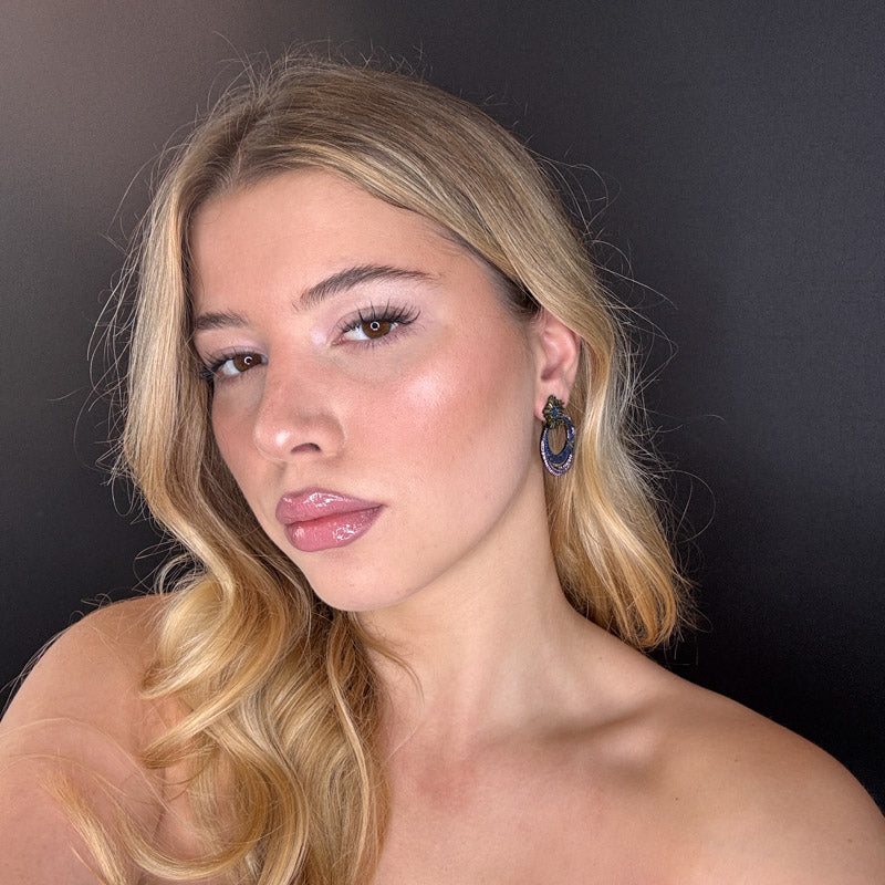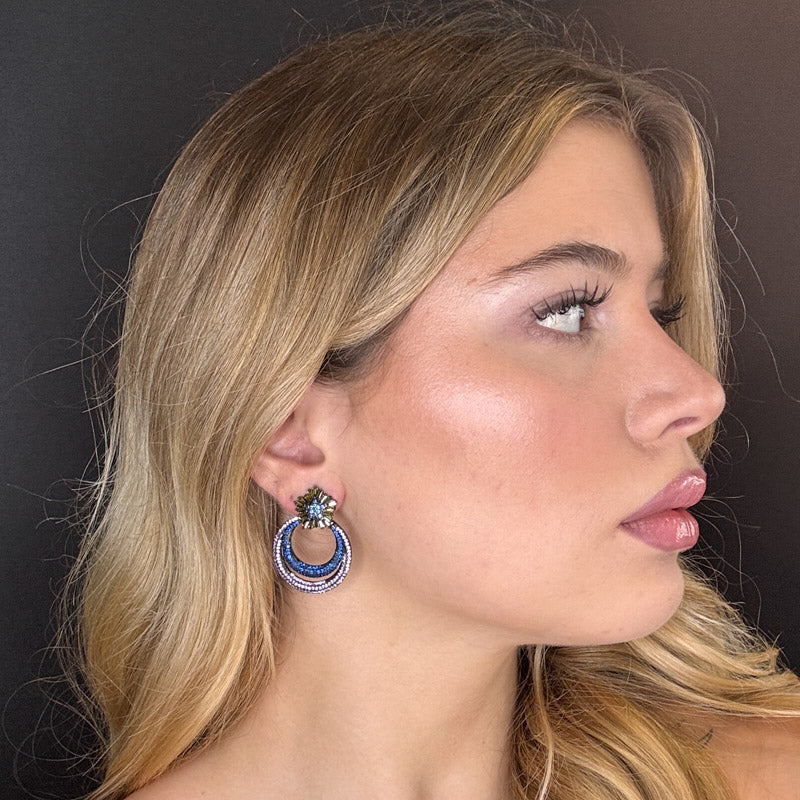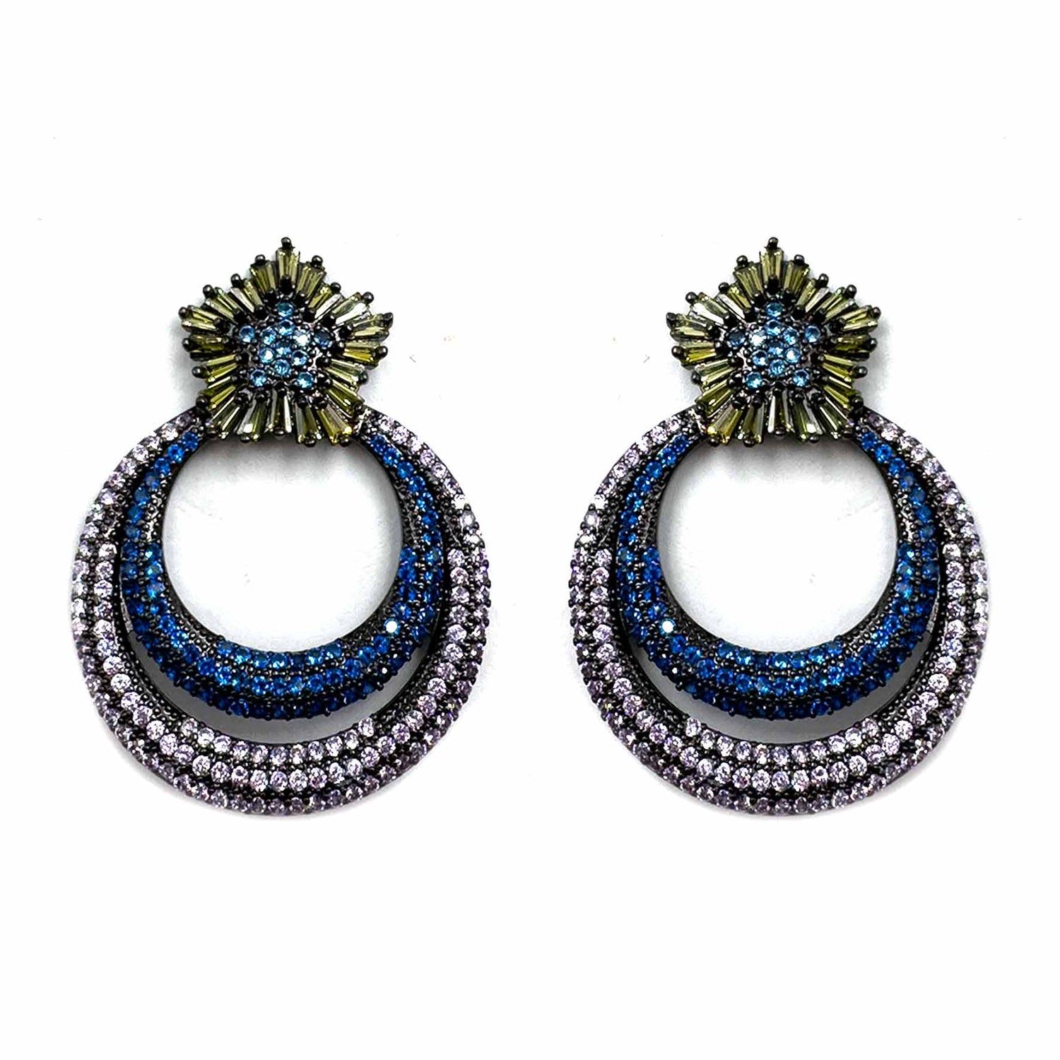 Orecchini pendenti con tripudio di zirconi blu e lillac, e cristalli giallo caldo e blu