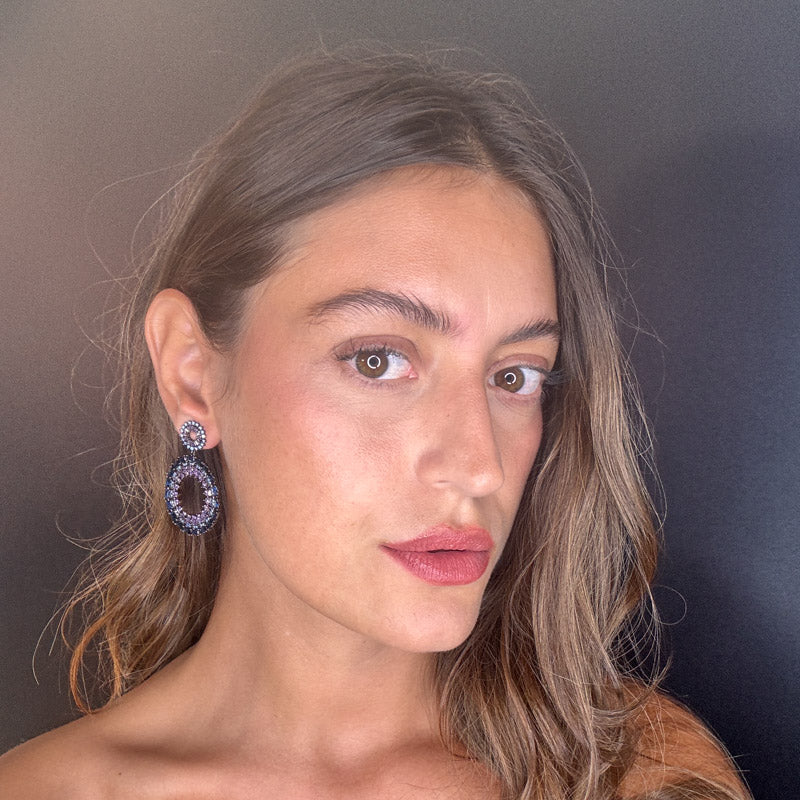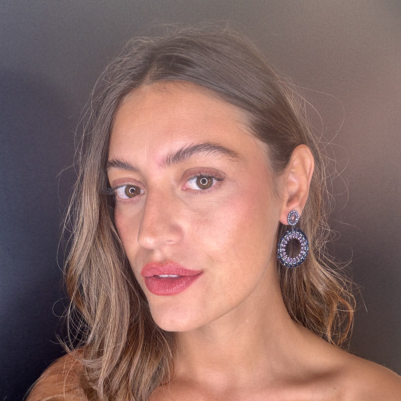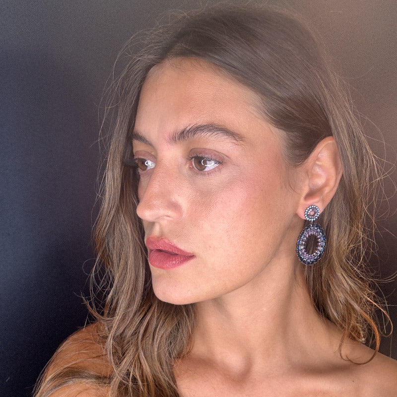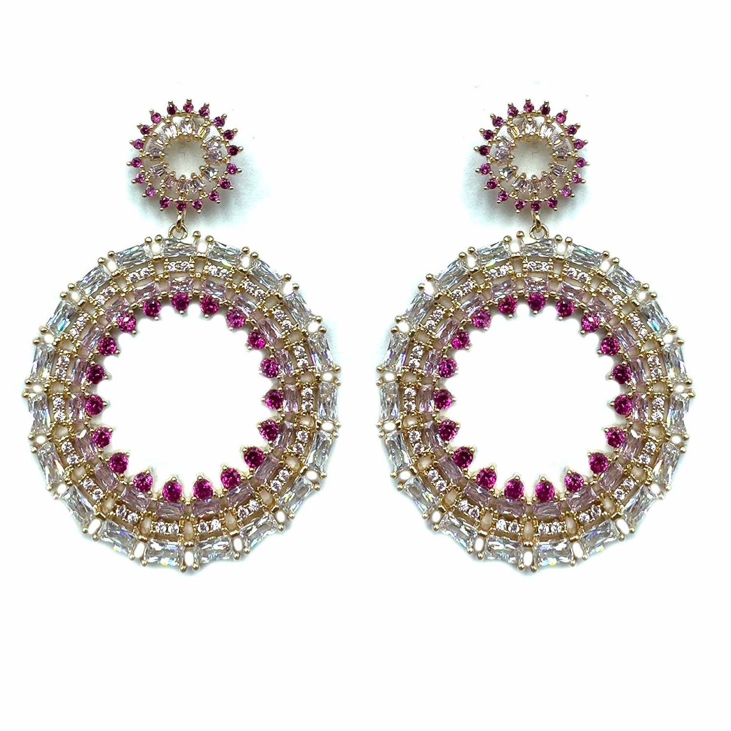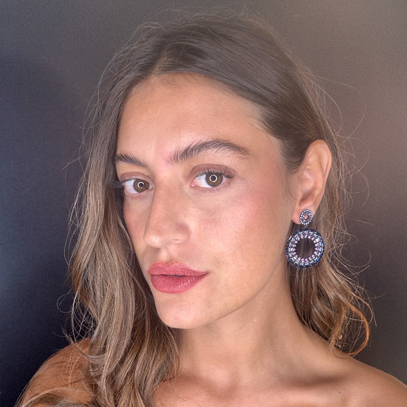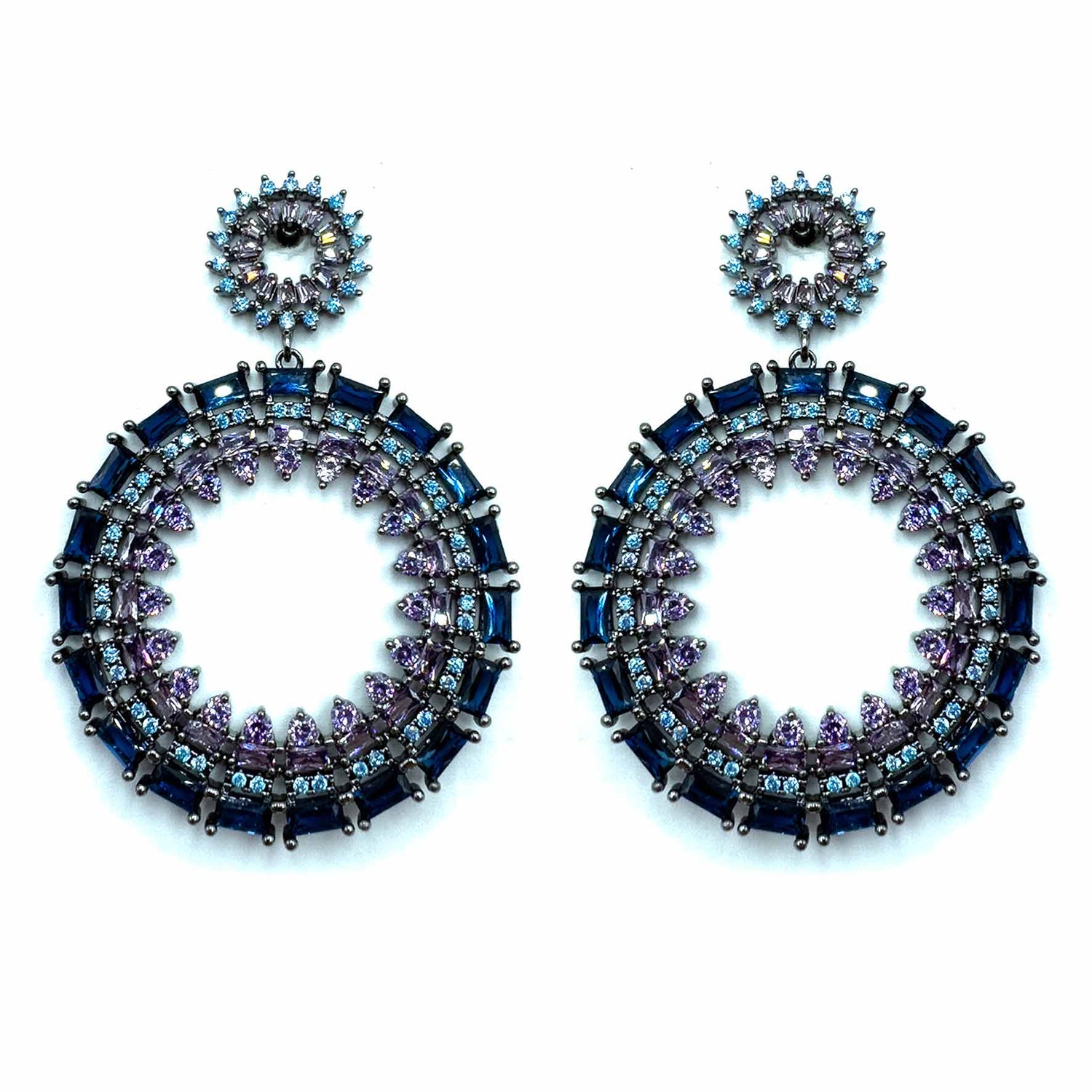 Orecchini pendenti a forma di cerchi di cristalli colorati, disponibili in due versioni, gold/dark plated.
