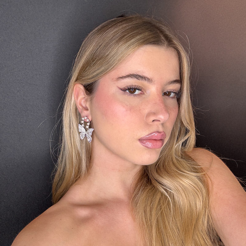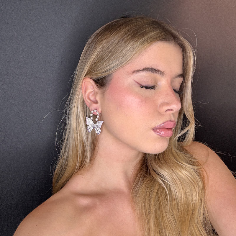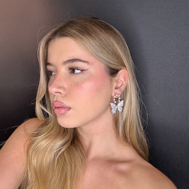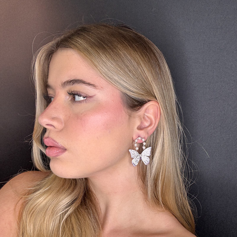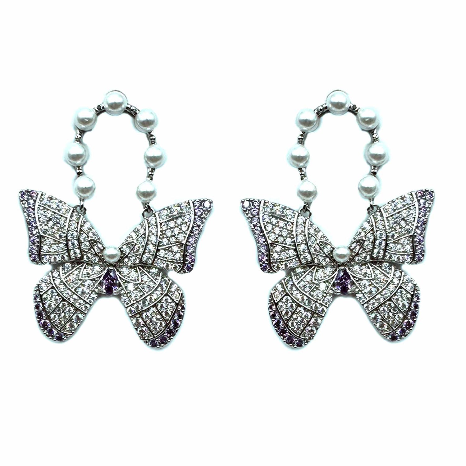 Orecchini pendenti a forma di farfalla, decorati di pavè silver e lillac, con una catena di perle ed una pietrina cristallo lillac, placcati silver