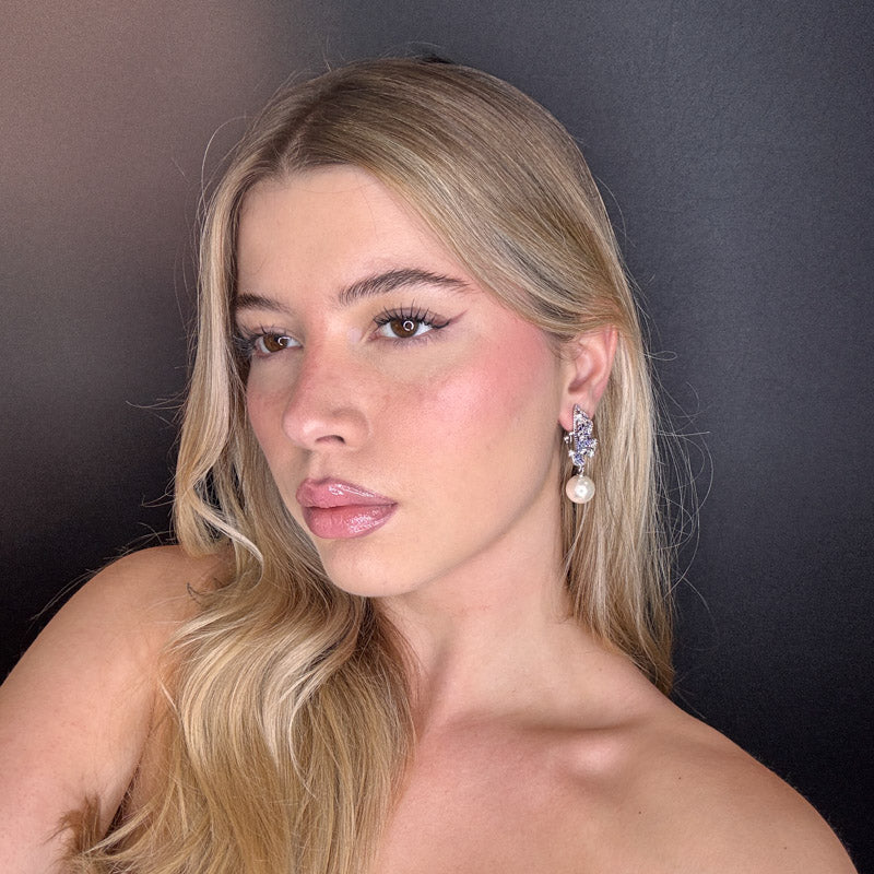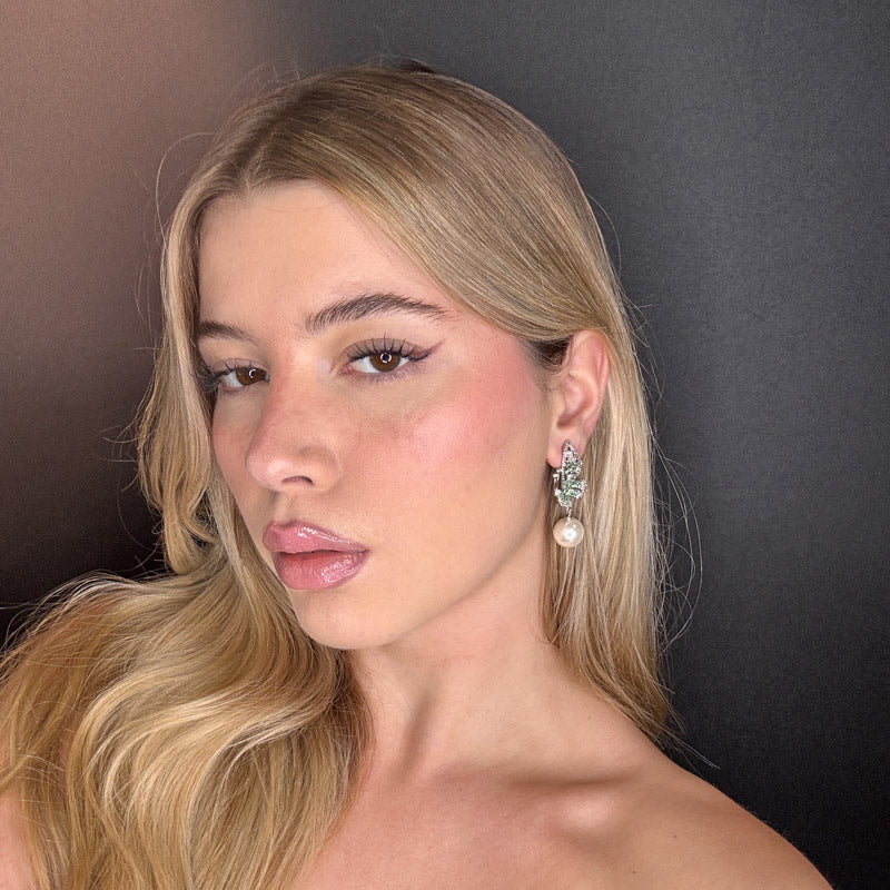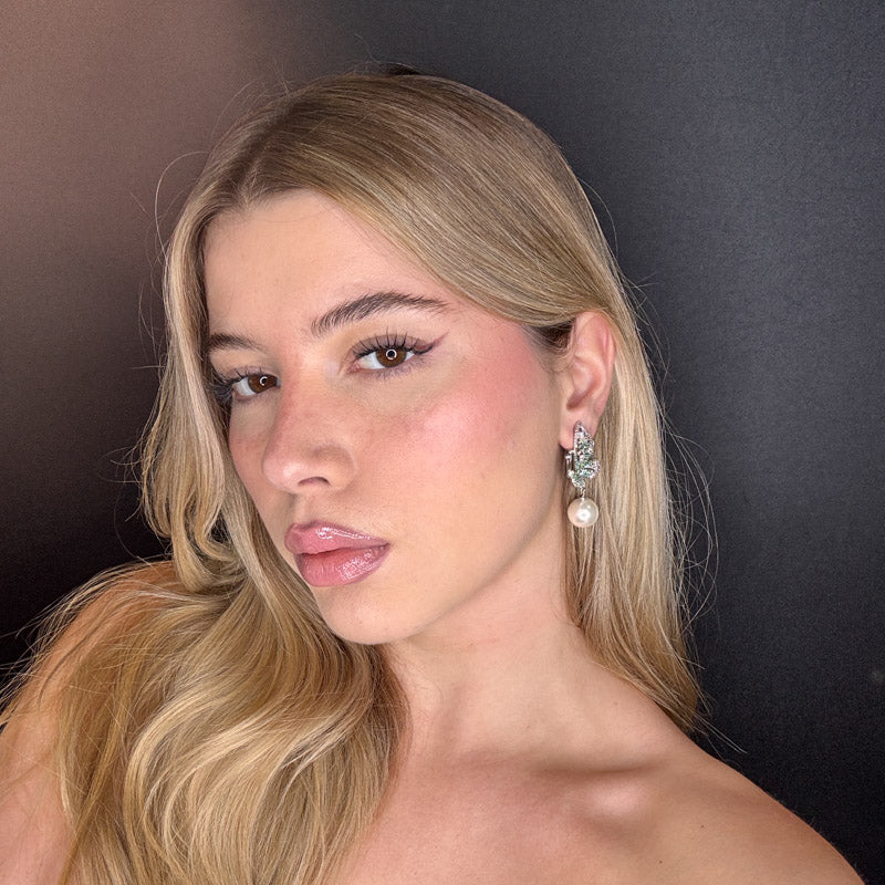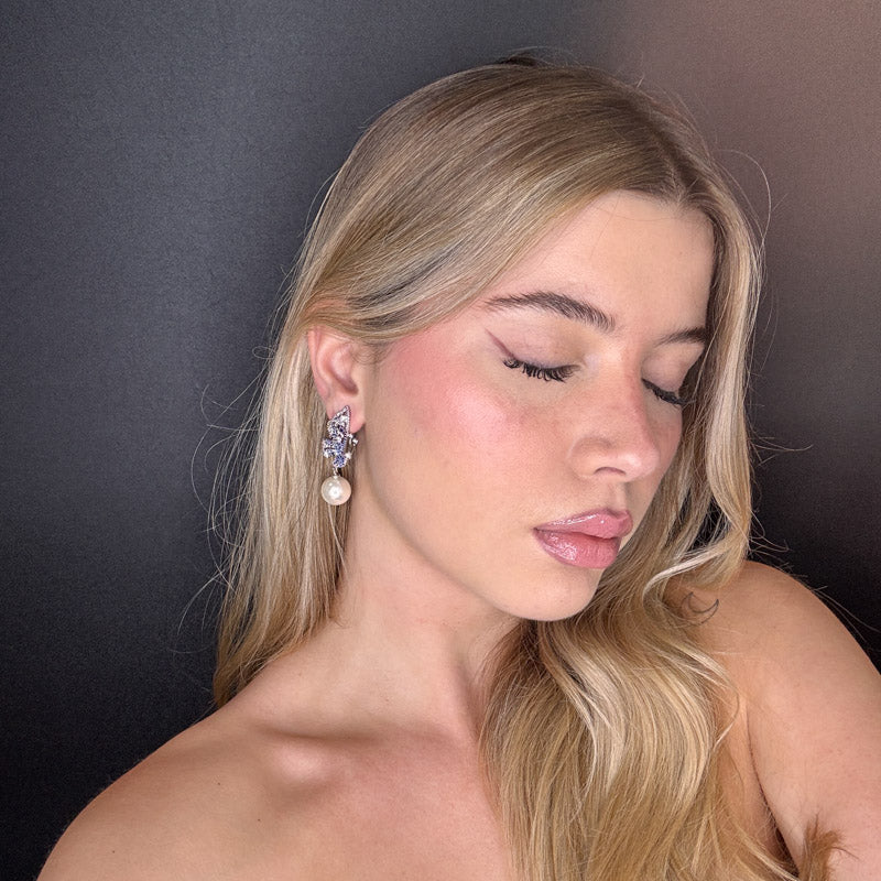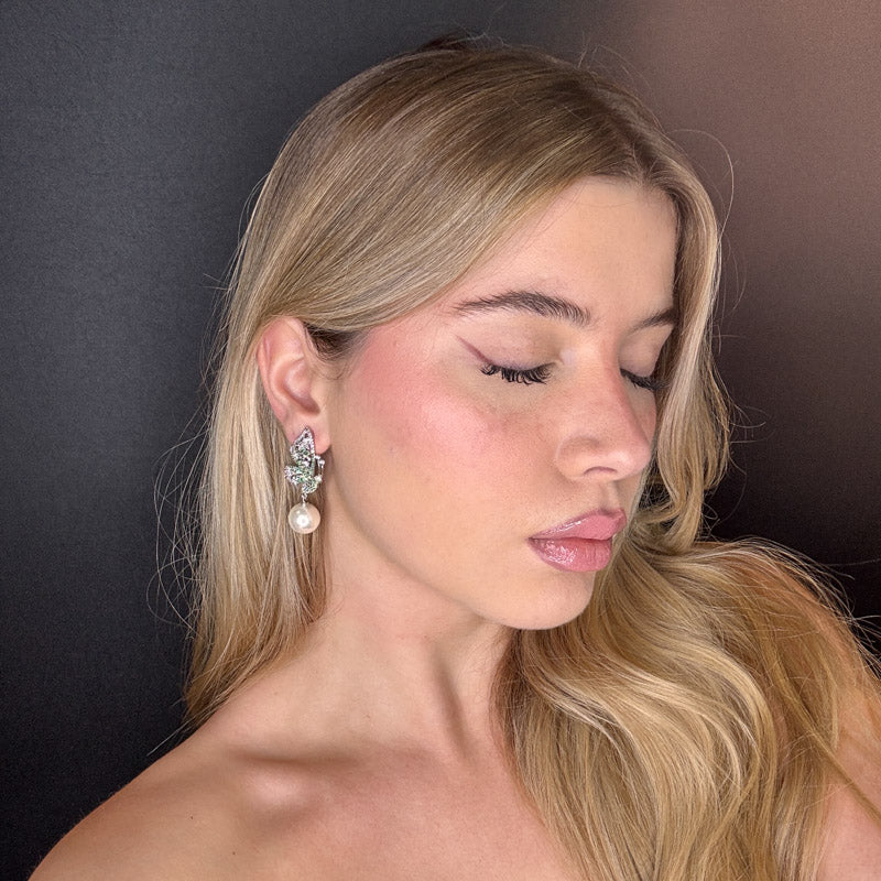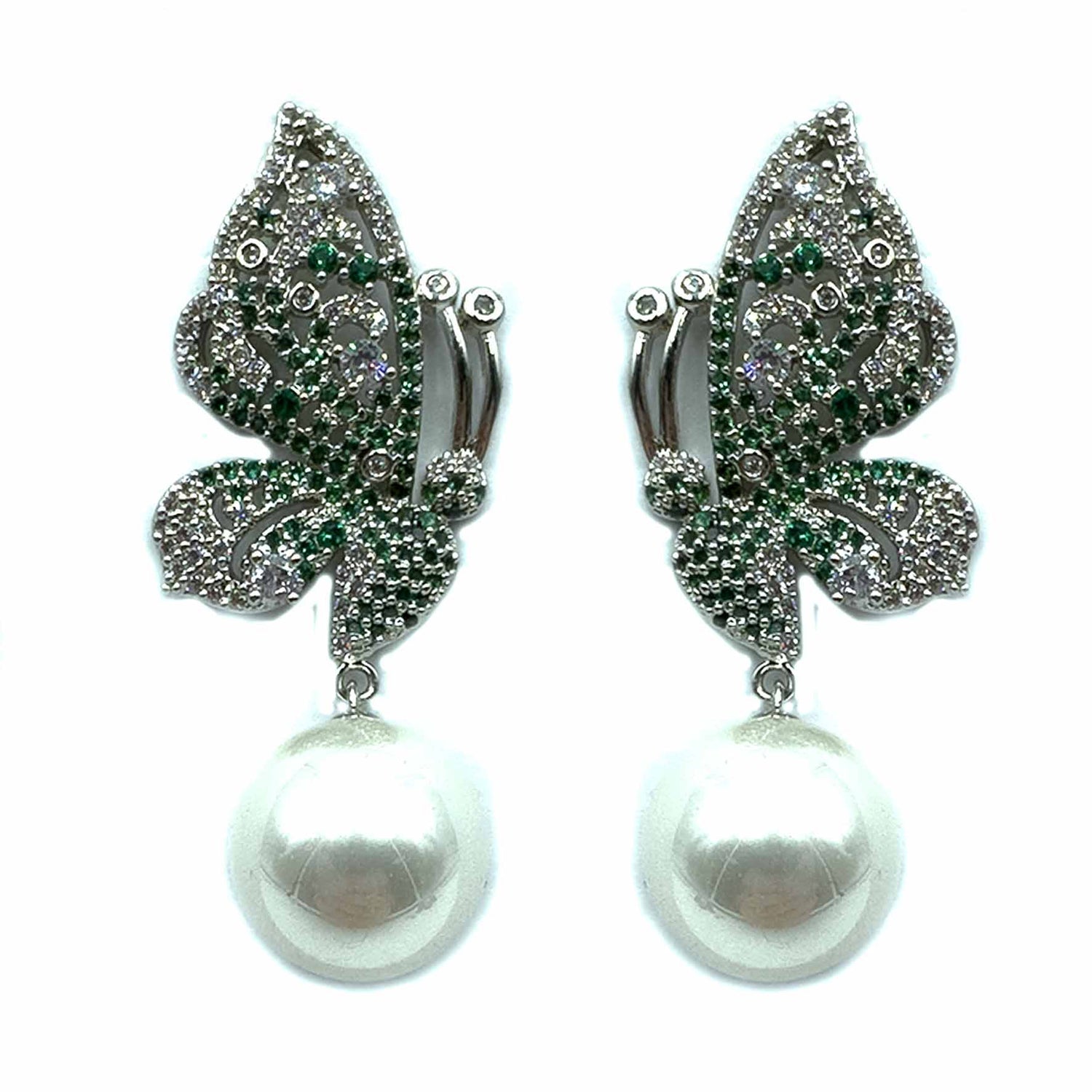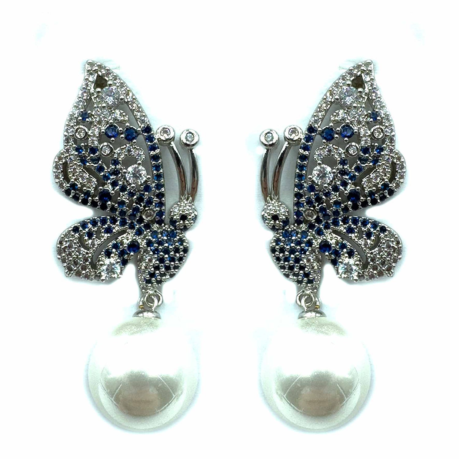 Orecchini pendenti a forma di farfalle con perla big pendente, decorati da pavè incastonati, placcati silver