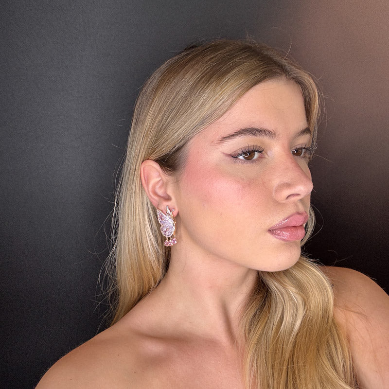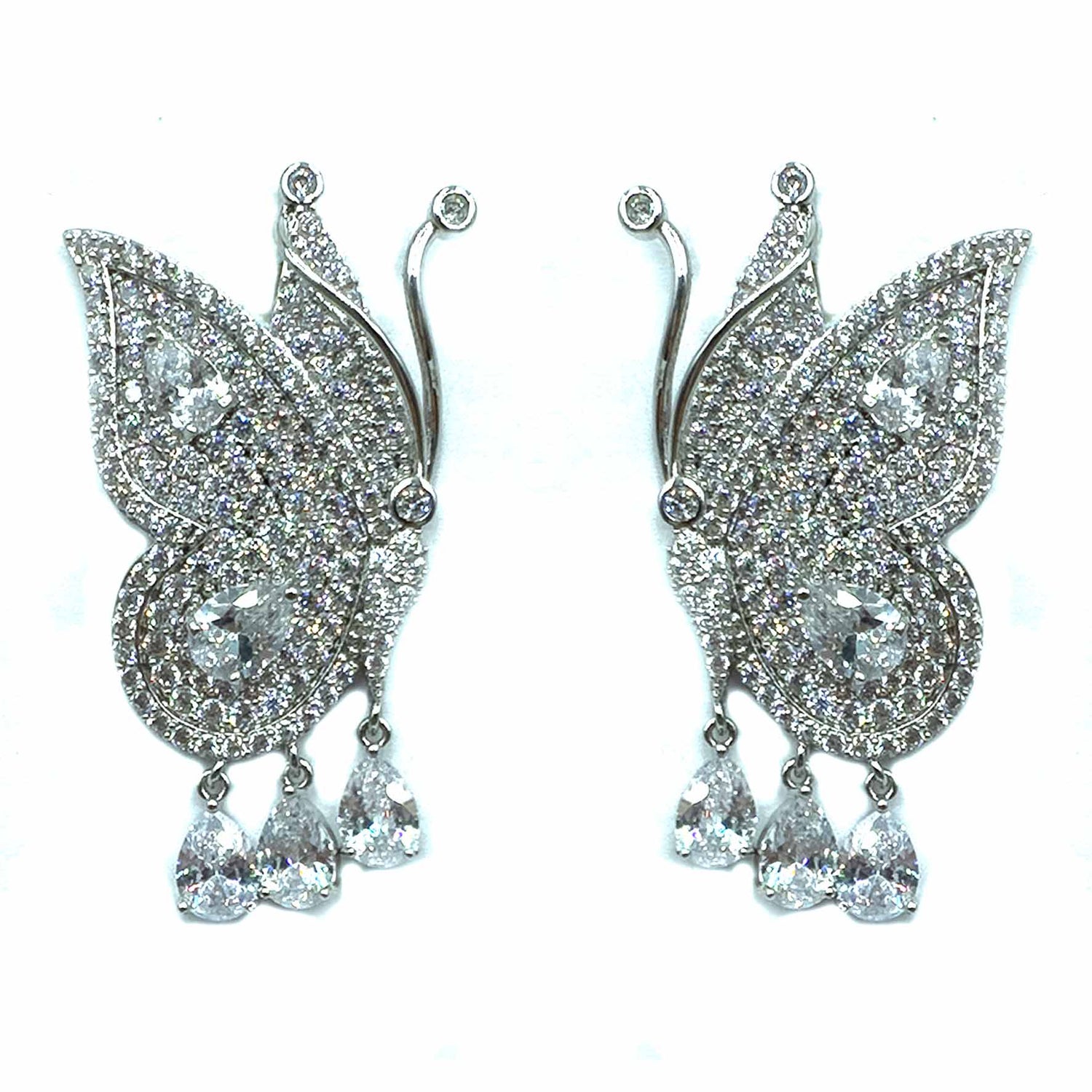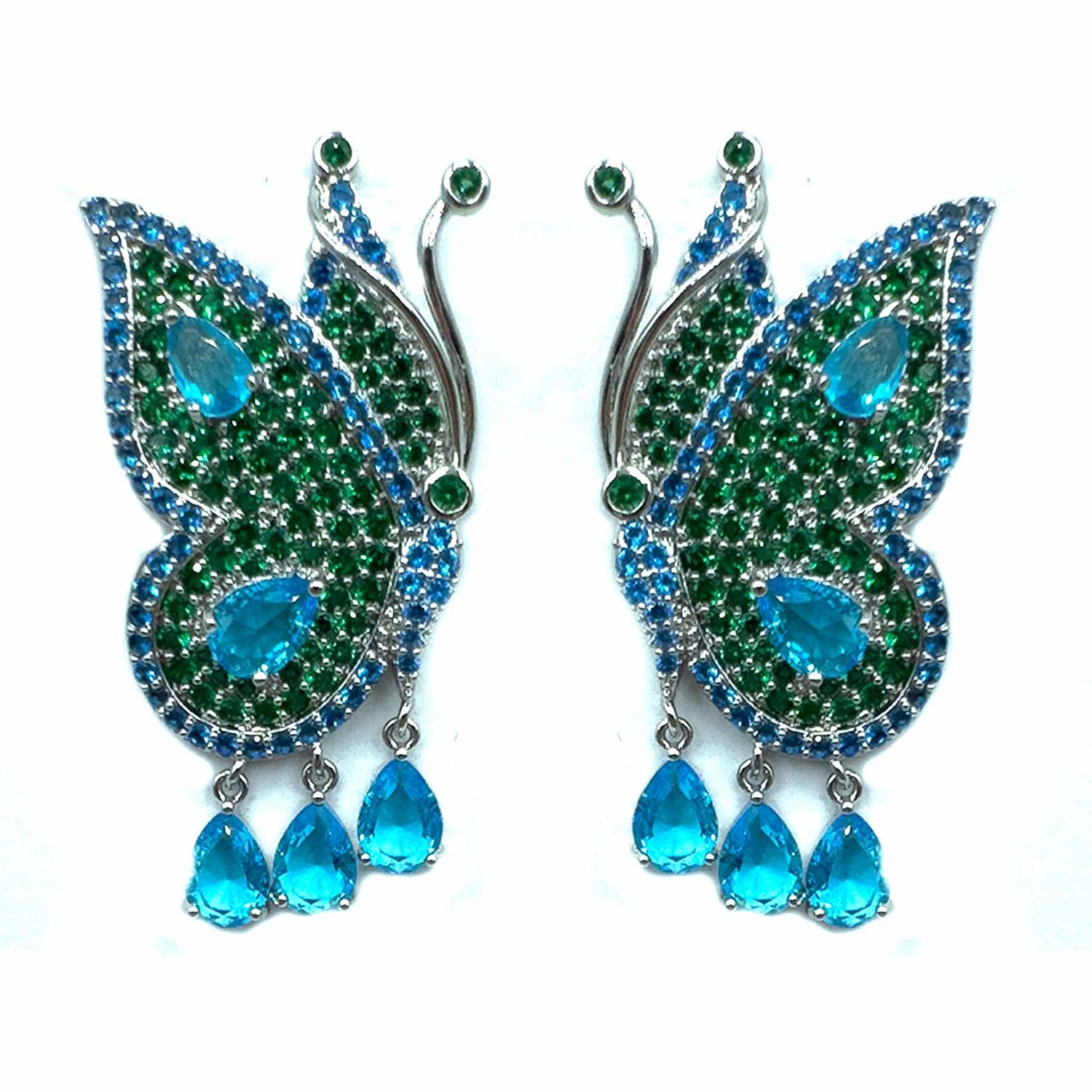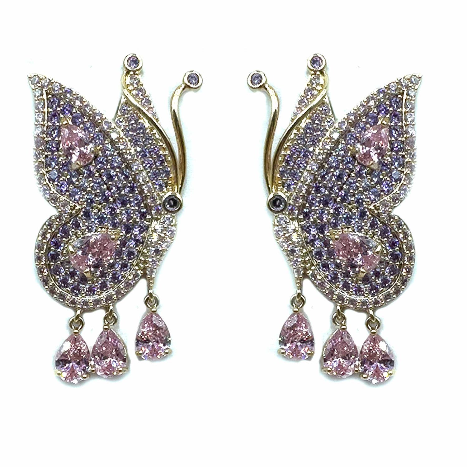 Orecchini pendenti a forma di farfalla, placcati silver/gold incastonati di zirconi colorati ed tre pietrine pendenti a goccia