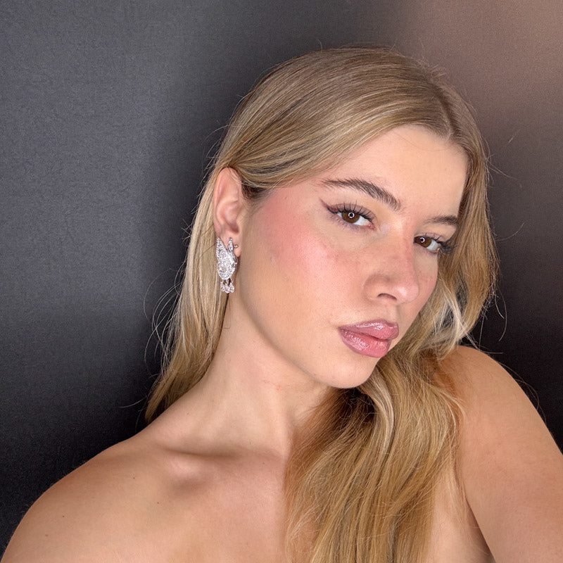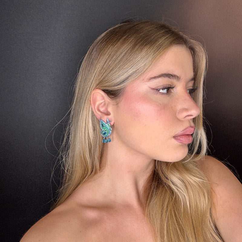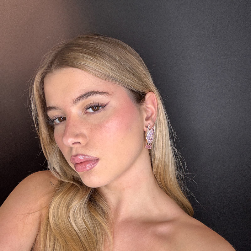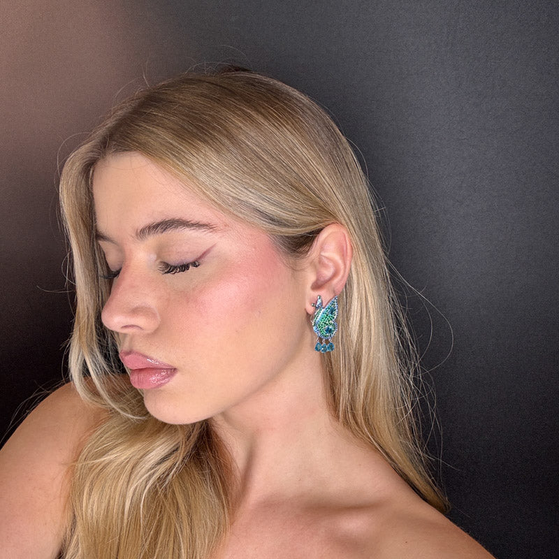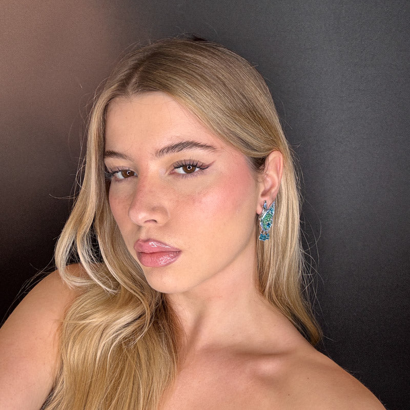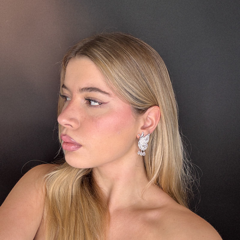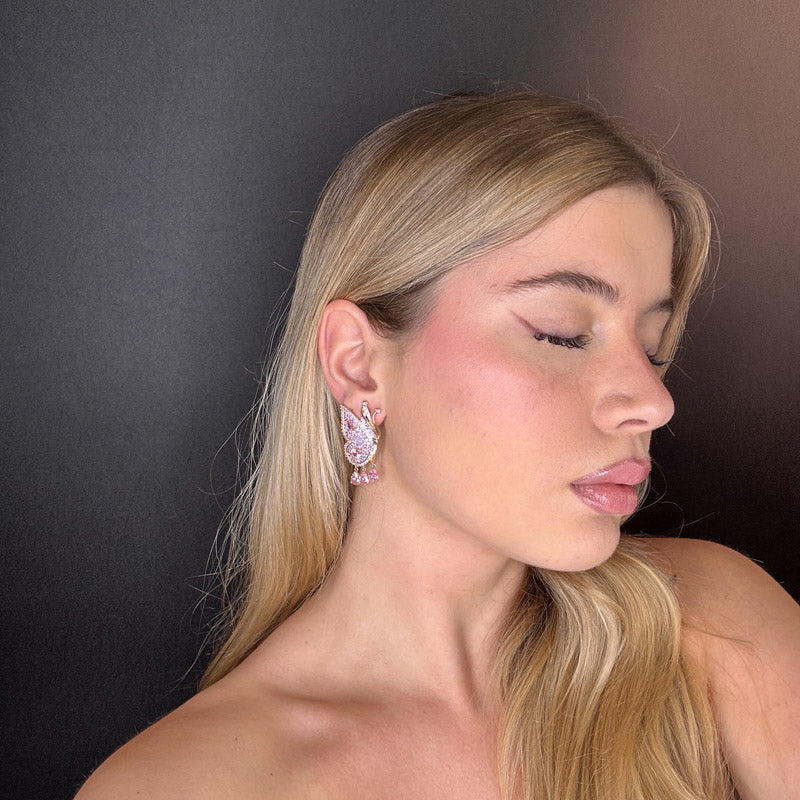 Orecchini pendenti a forma di farfalla, placcati silver/gold incastonati di zirconi colorati ed tre pietrine pendenti a goccia