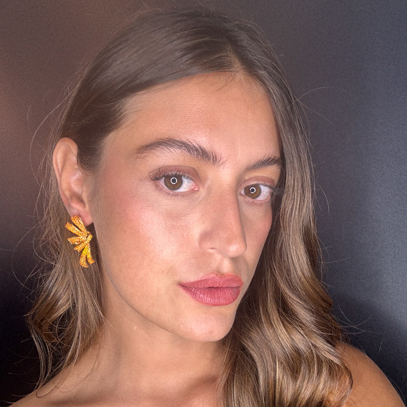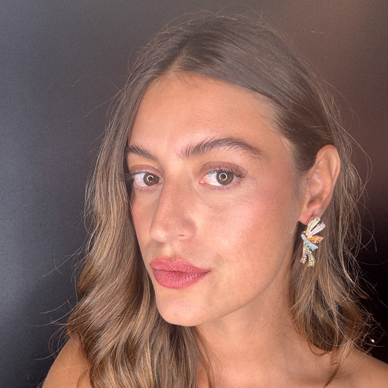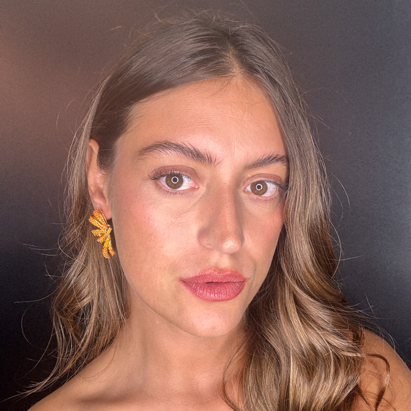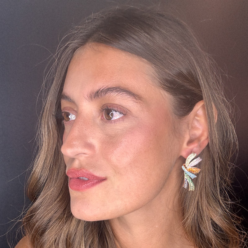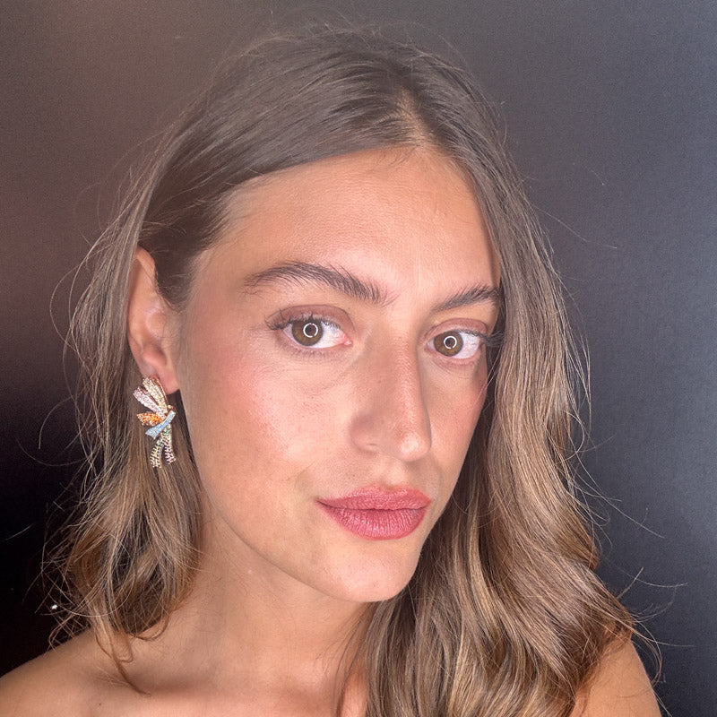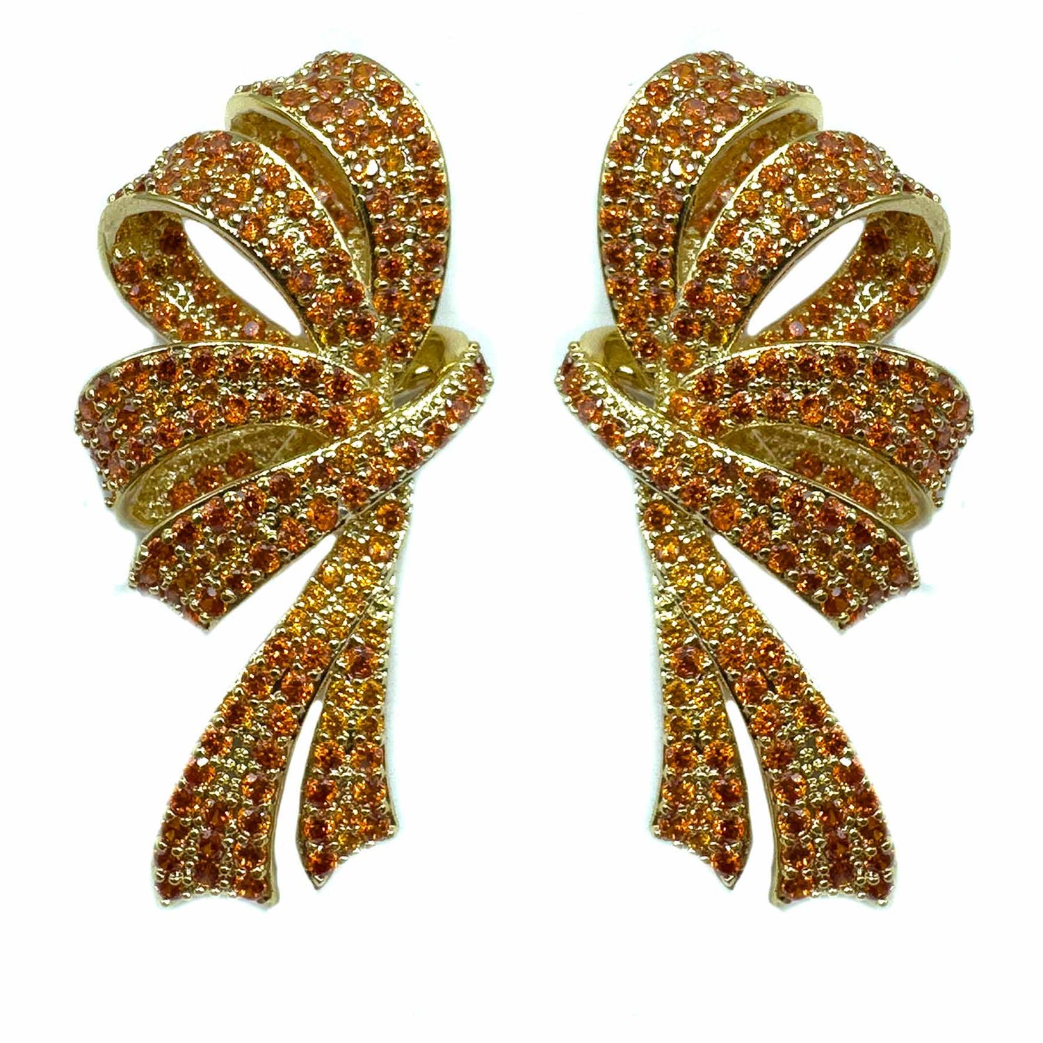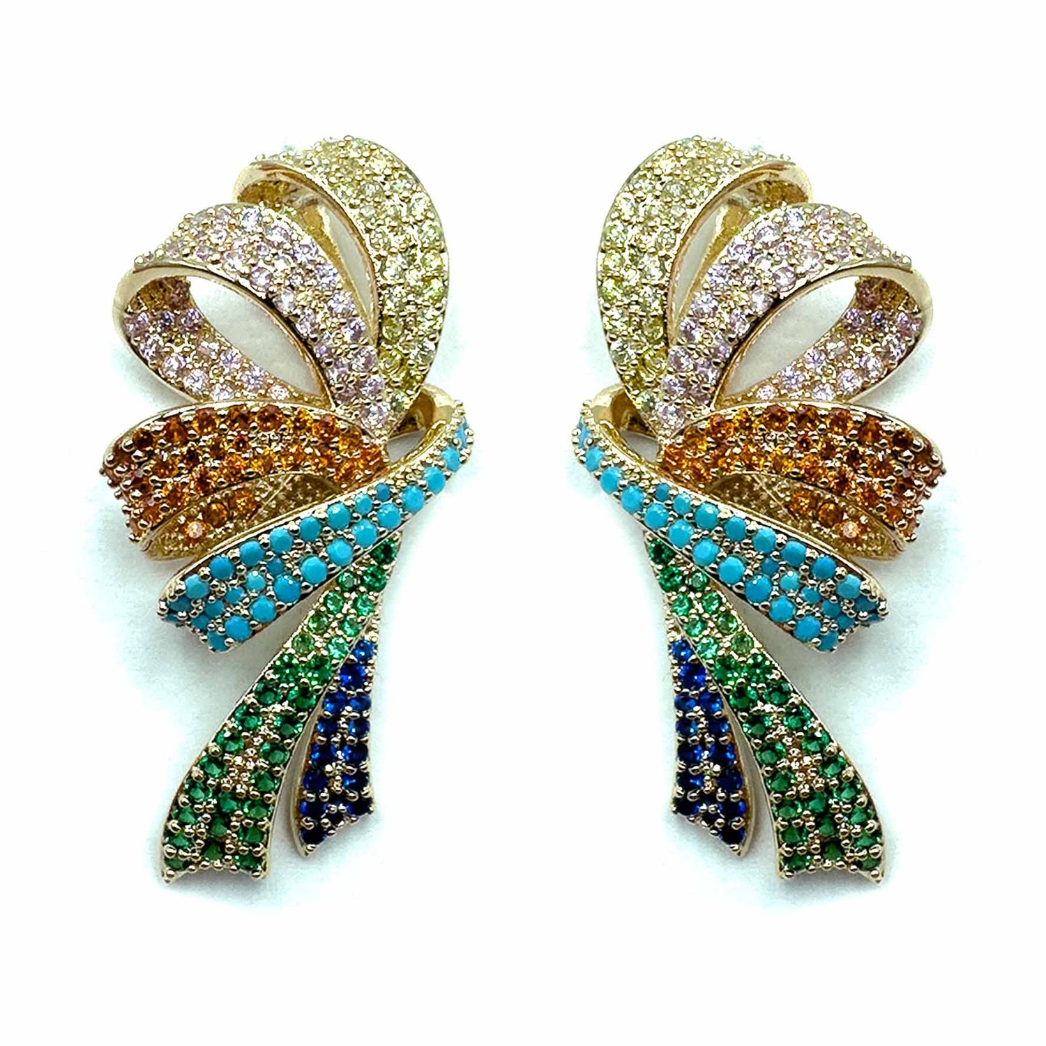 Orecchini pendenti a forma di fiocco con doppio nastro, decorati da splendidi zirconi brillanti che donano un pavé scintillante, perfetto per aggiungere un tocco speciale ad ogni outfit. Realizzati con una struttura placcata in oro.
