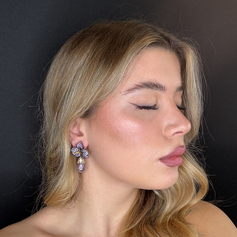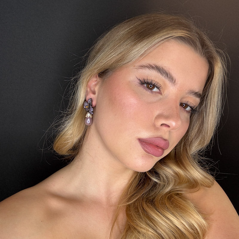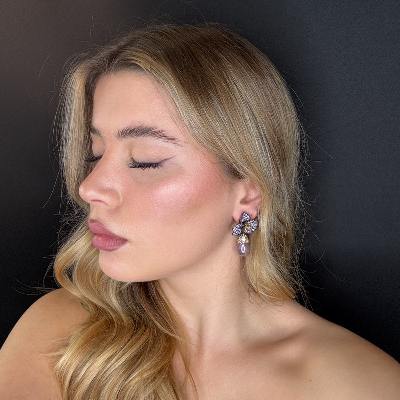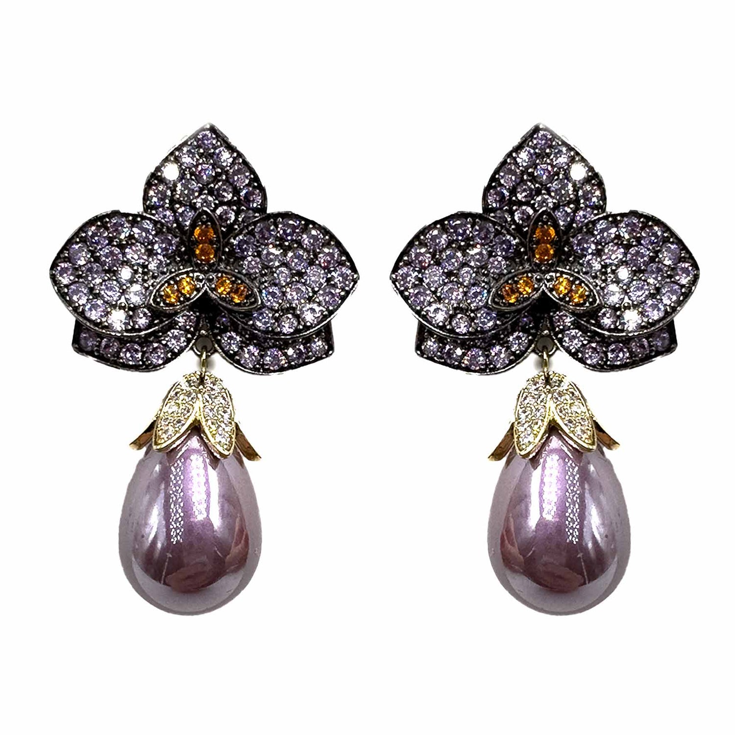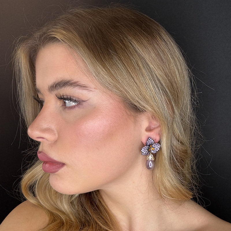 Orecchini pendenti a forma di petali di pavè viola e arancio, con perla a goccia color melanzana, placcati dark