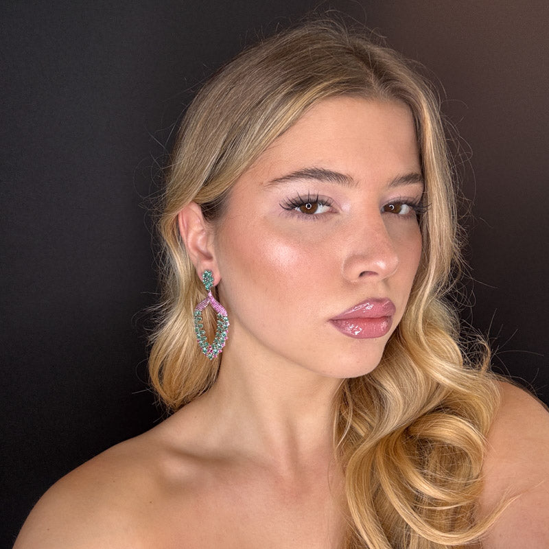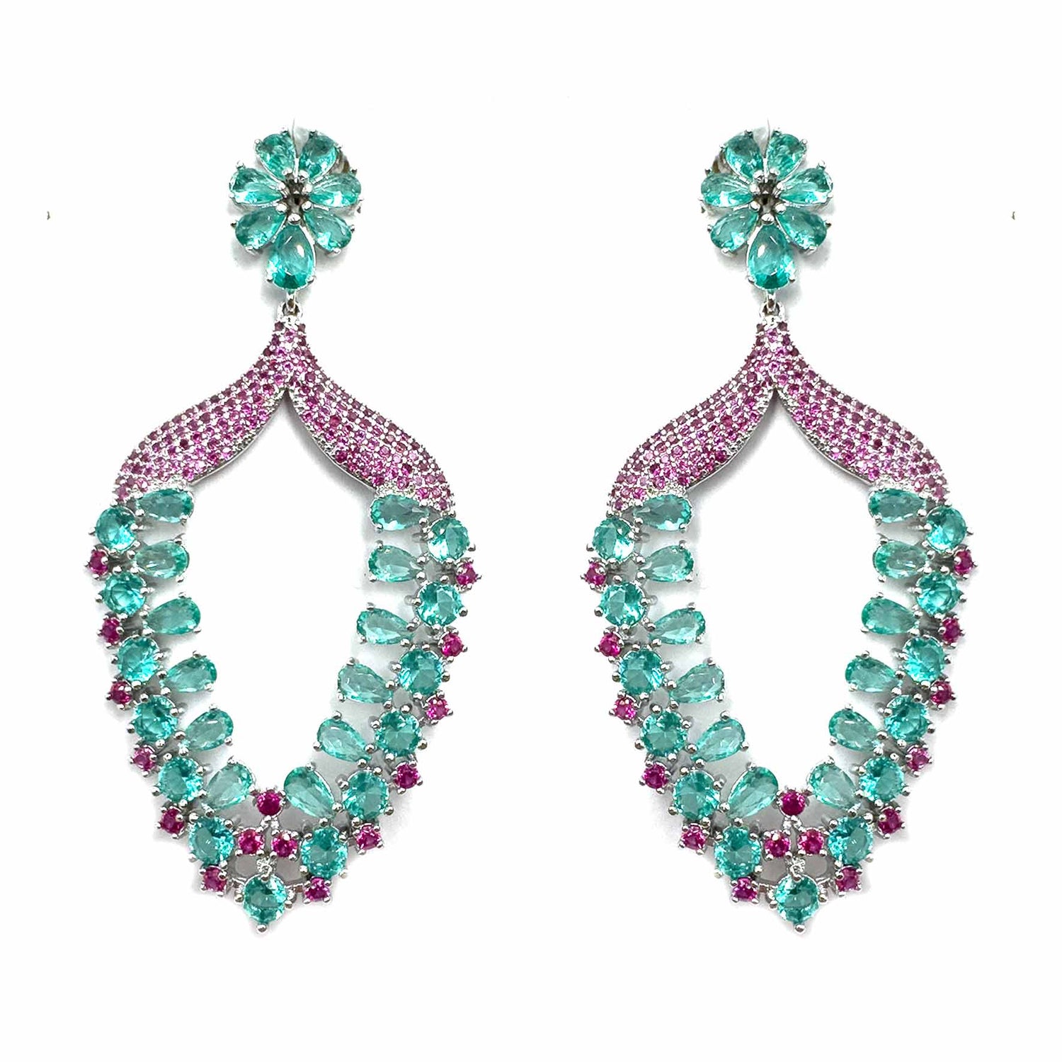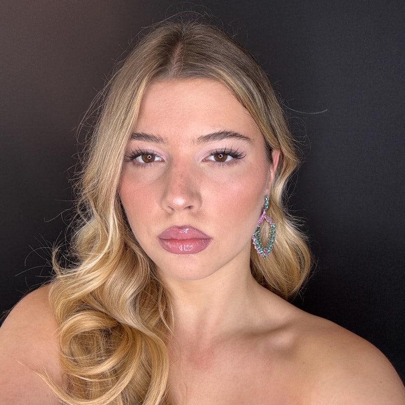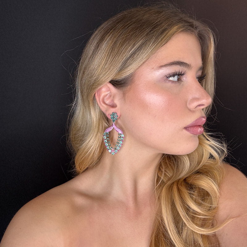 Orecchini pendenti con tripudio di zirconi e pietre color verde acqua su pavè fucsia