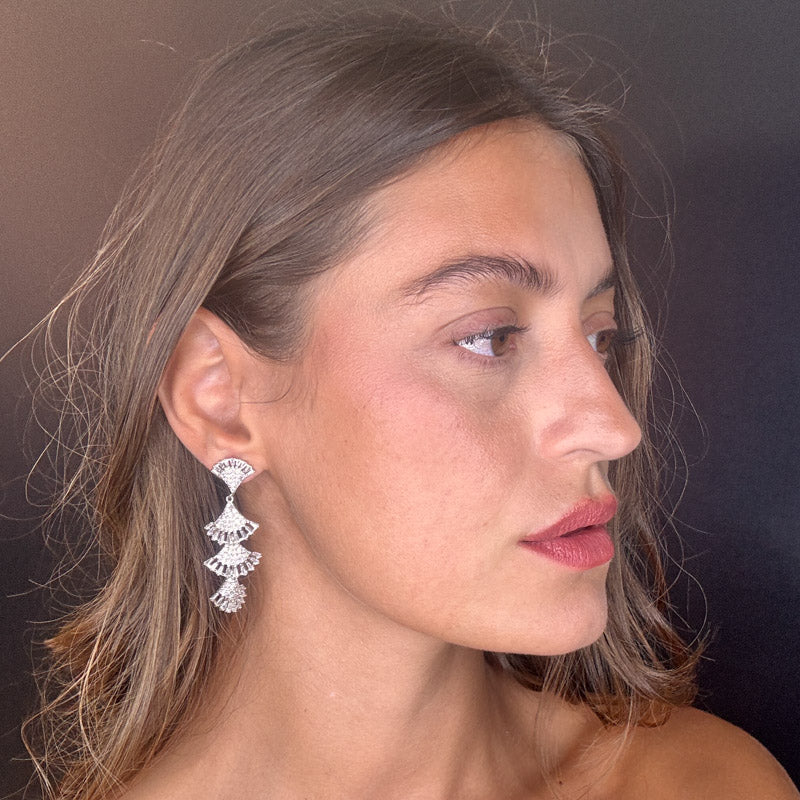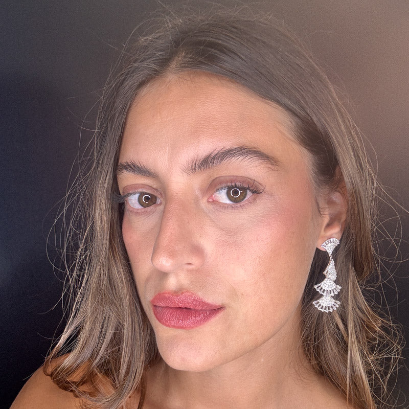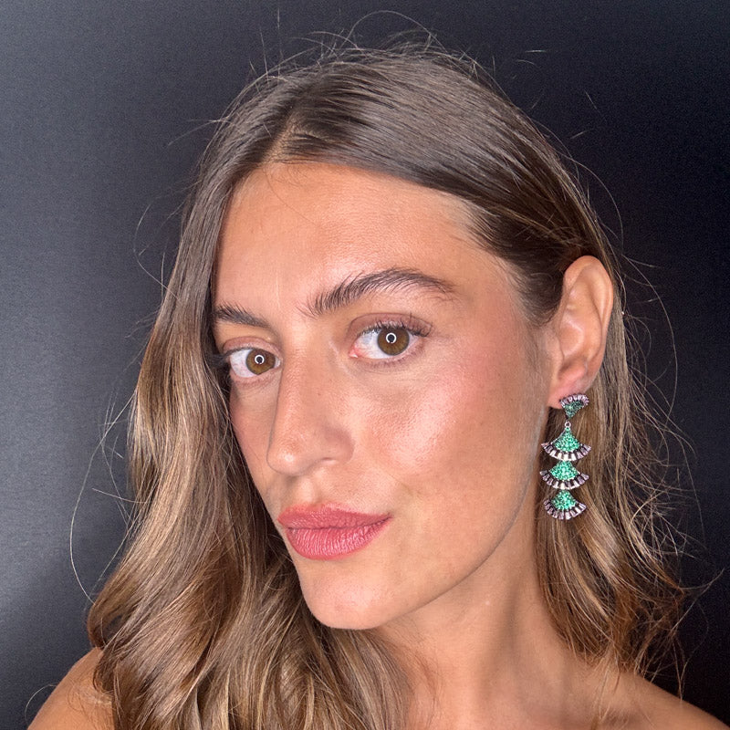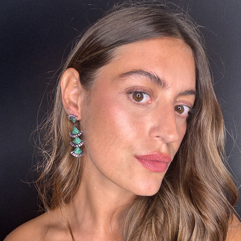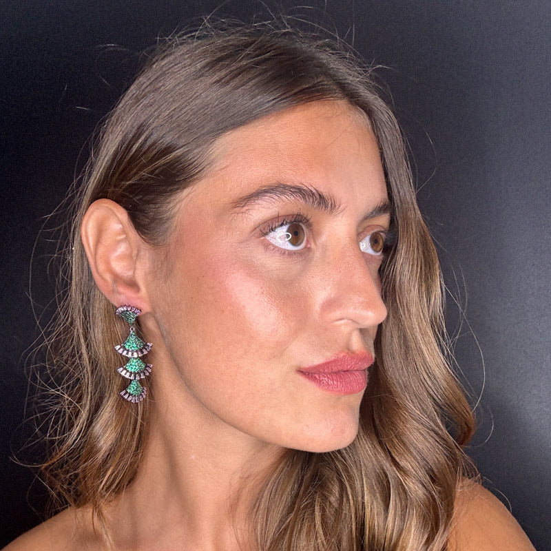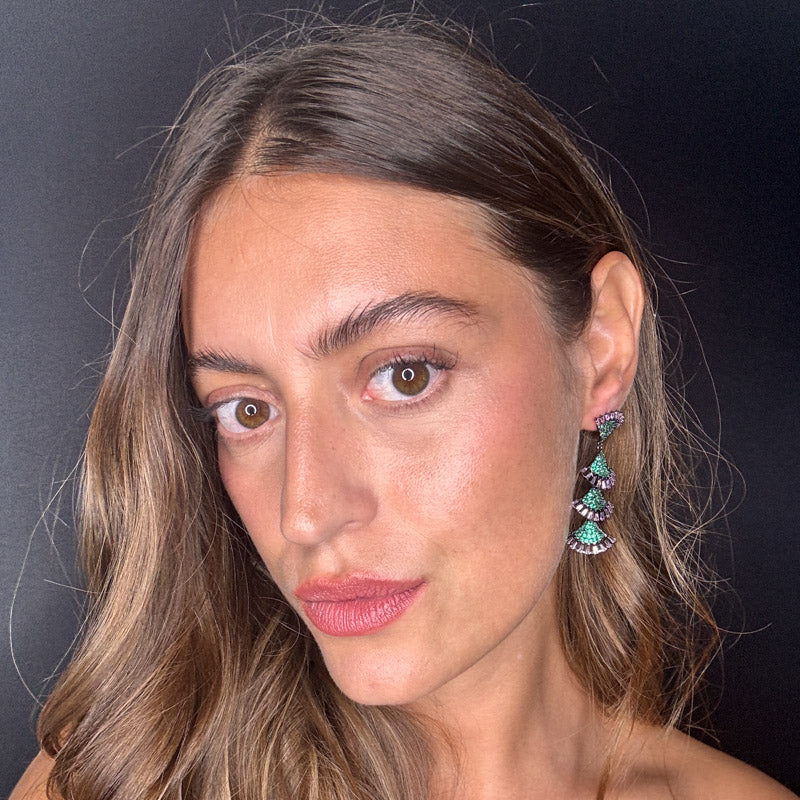 Orecchini pendenti a effetto frangia, decorati da un elegante e brillante pavè e pietre colorate. Il tutto su una raffinata struttura silver/dark plated.