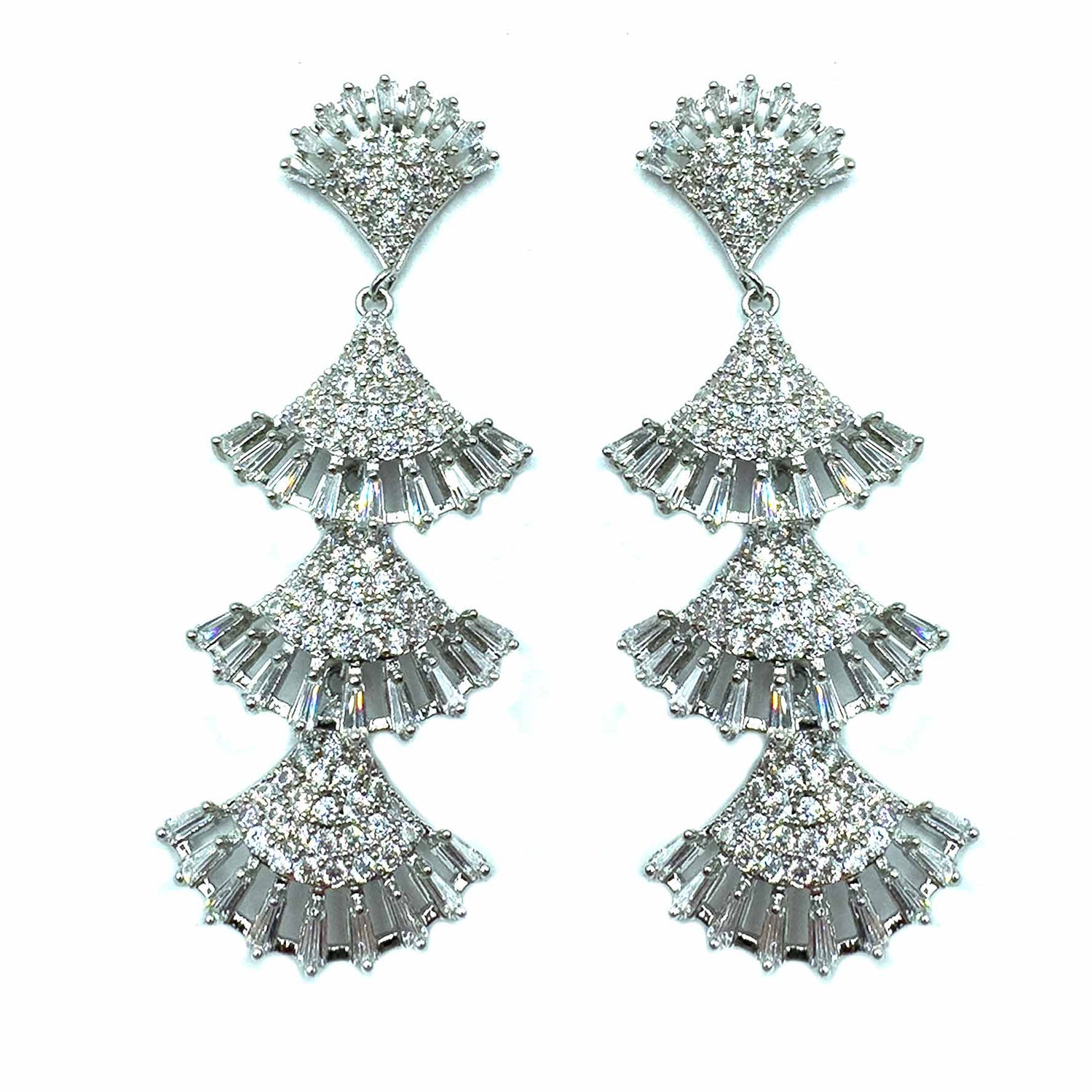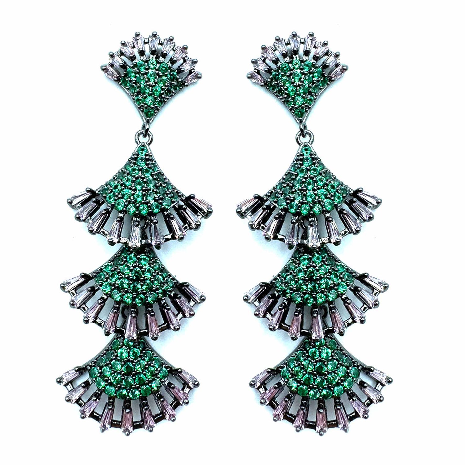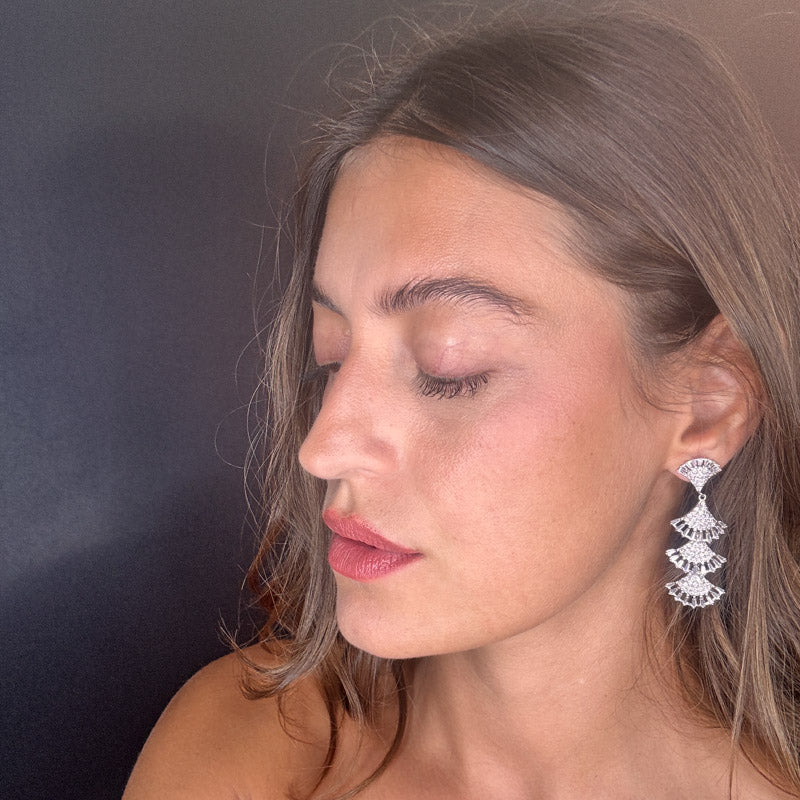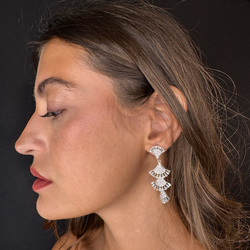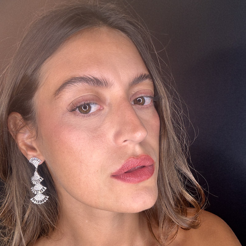 Orecchini pendenti a effetto frangia, decorati da un elegante e brillante pavè e pietre colorate. Il tutto su una raffinata struttura silver/dark plated.