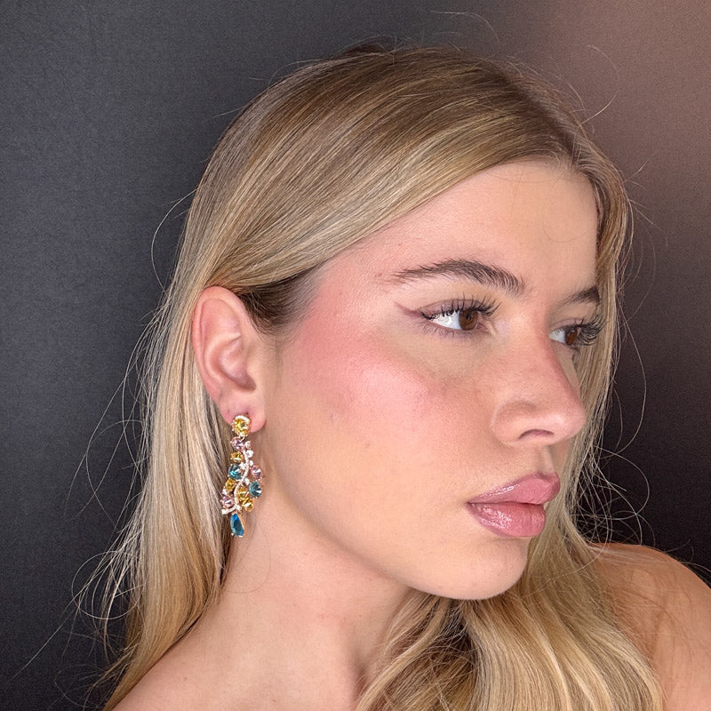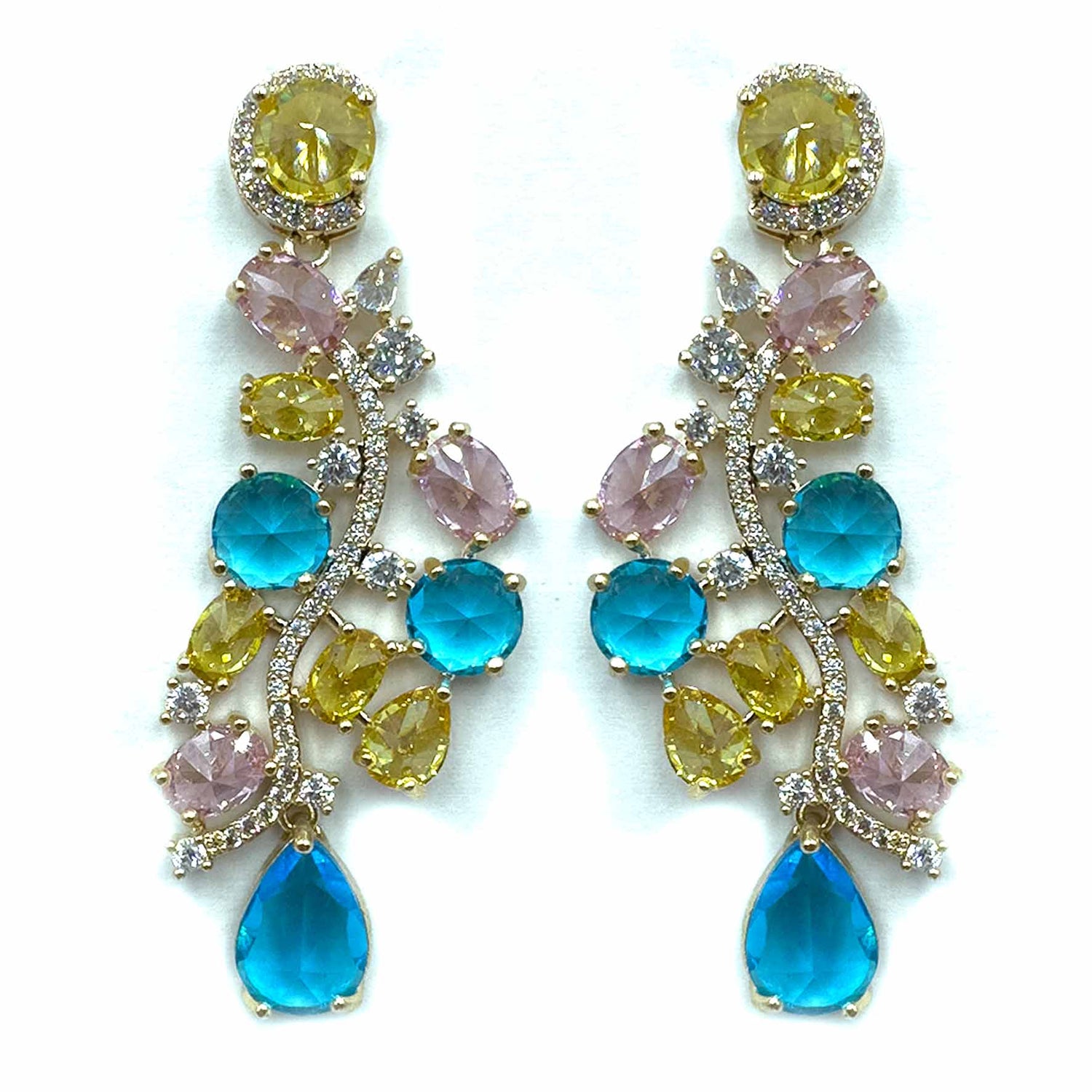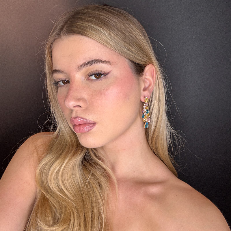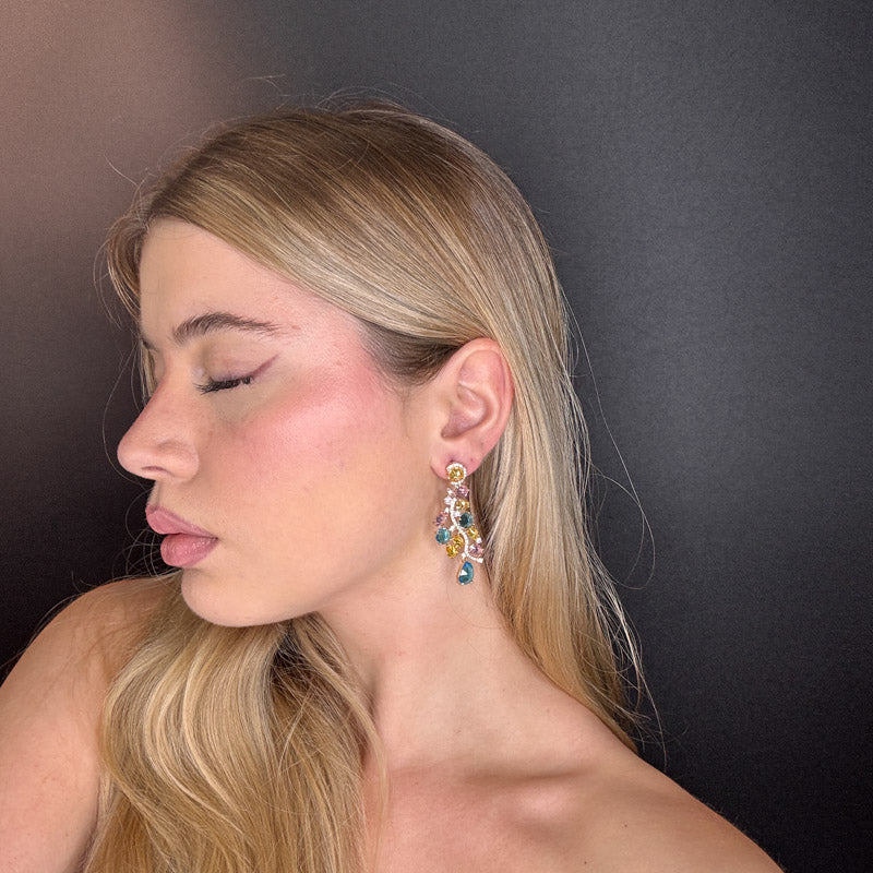 Orecchini pendenti a forma di composizione di pietre preziose colorate di diverse forme, dimensioni e colori, legate fra loro da una linea di pavè; gioielli placcati gold.