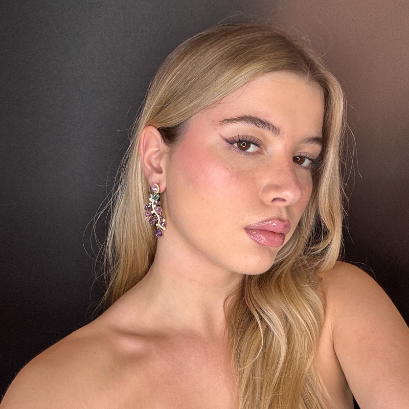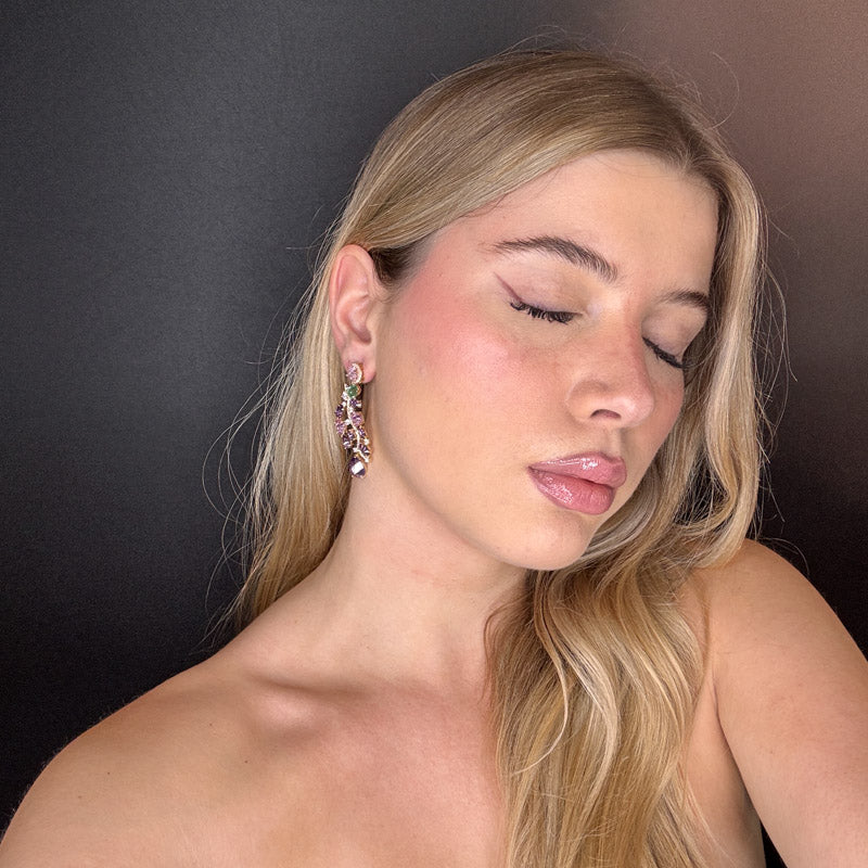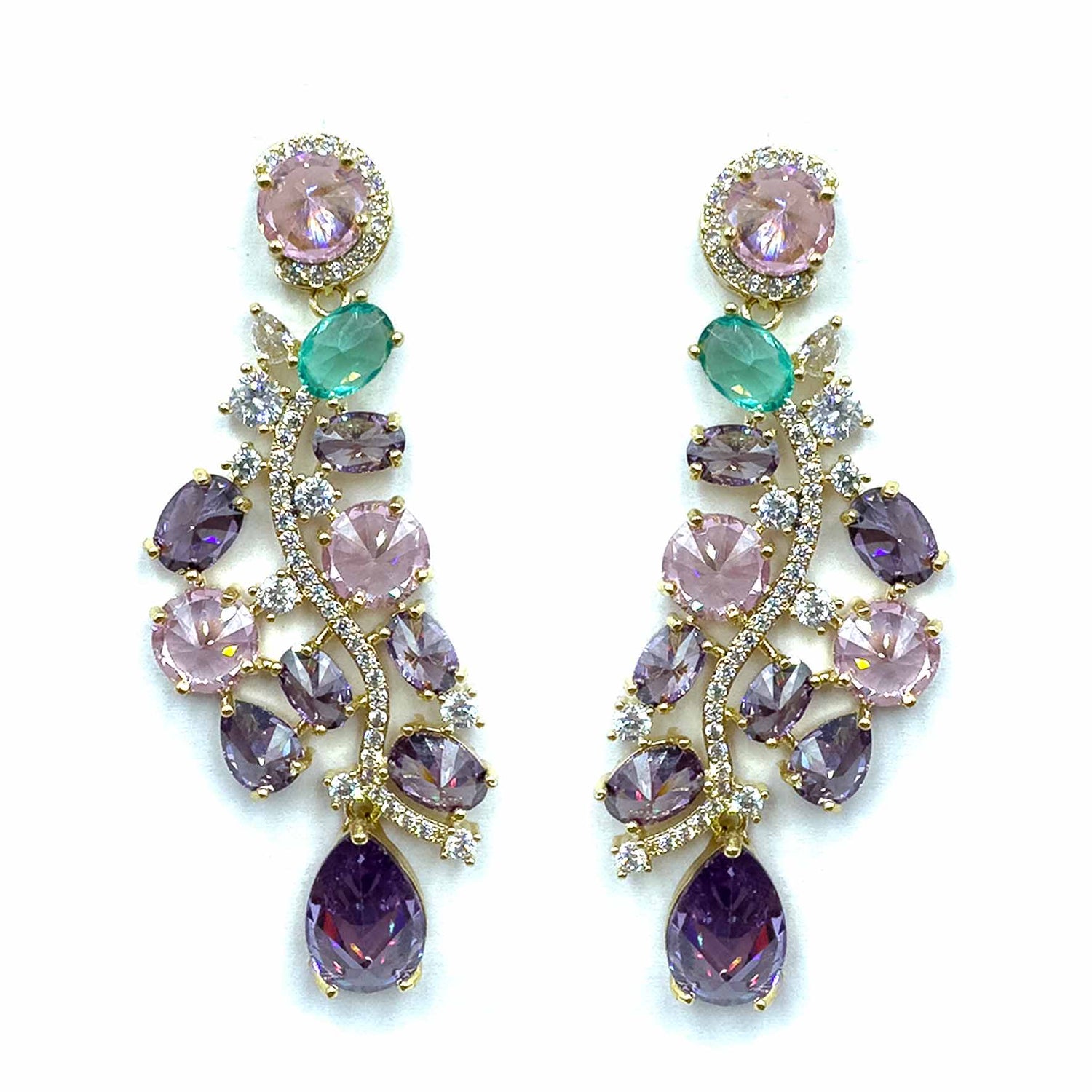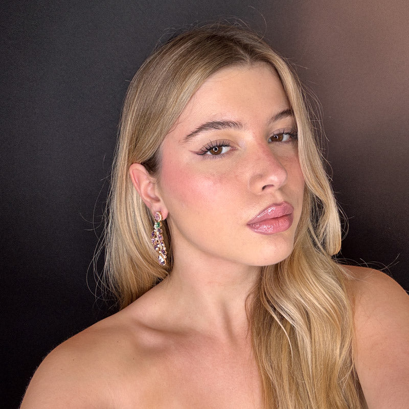 Orecchini pendenti a forma di composizione di pietre preziose colorate di diverse forme, dimensioni e colori, legate fra loro da una linea di pavè; gioielli placcati gold.