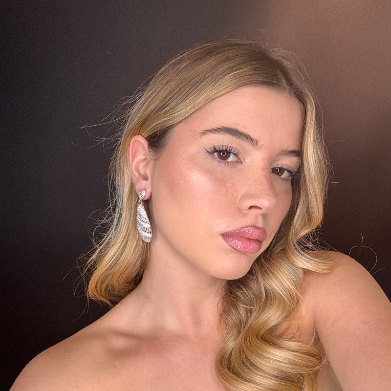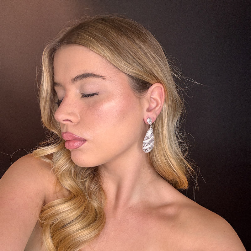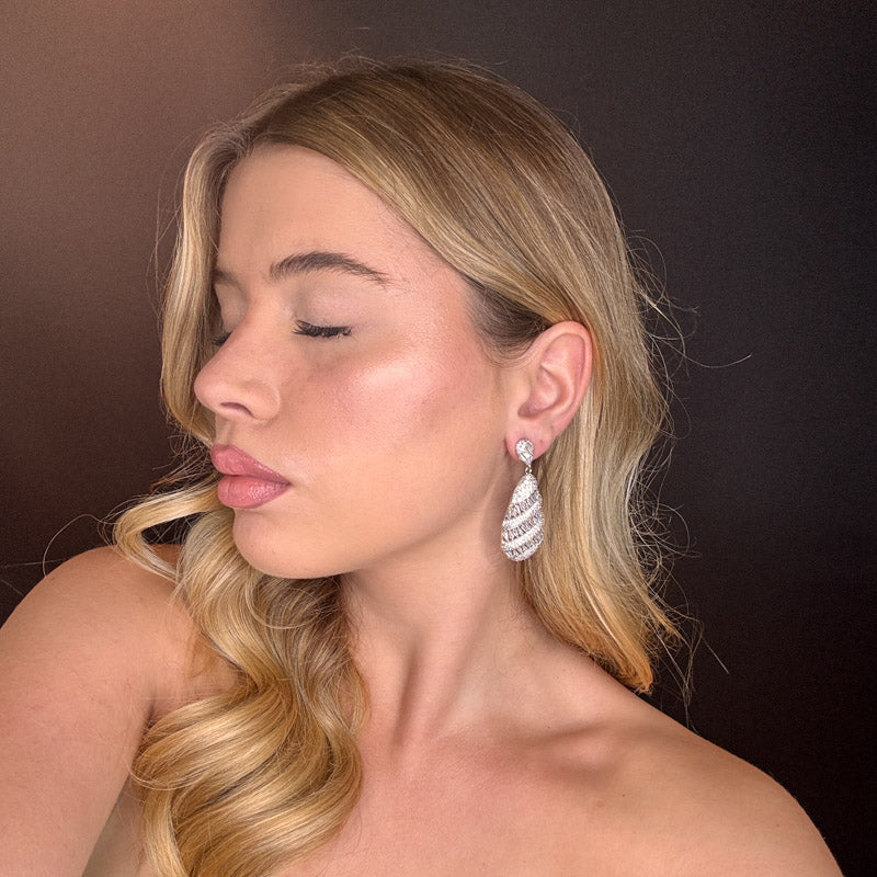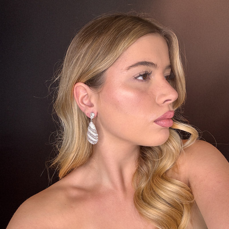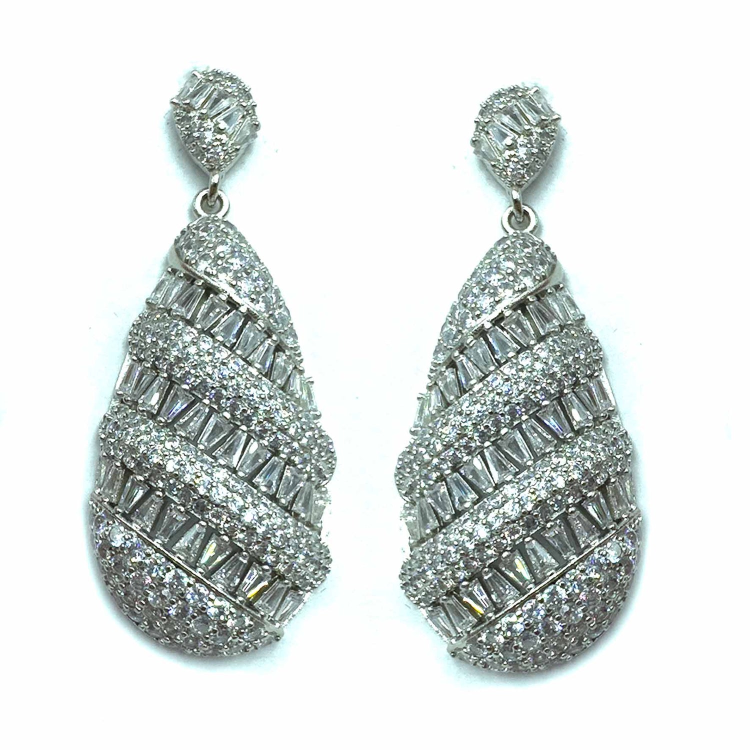Orecchini a forma di gocce decorata da una spirale di pavè ed una di cristalli, con base silver plated.