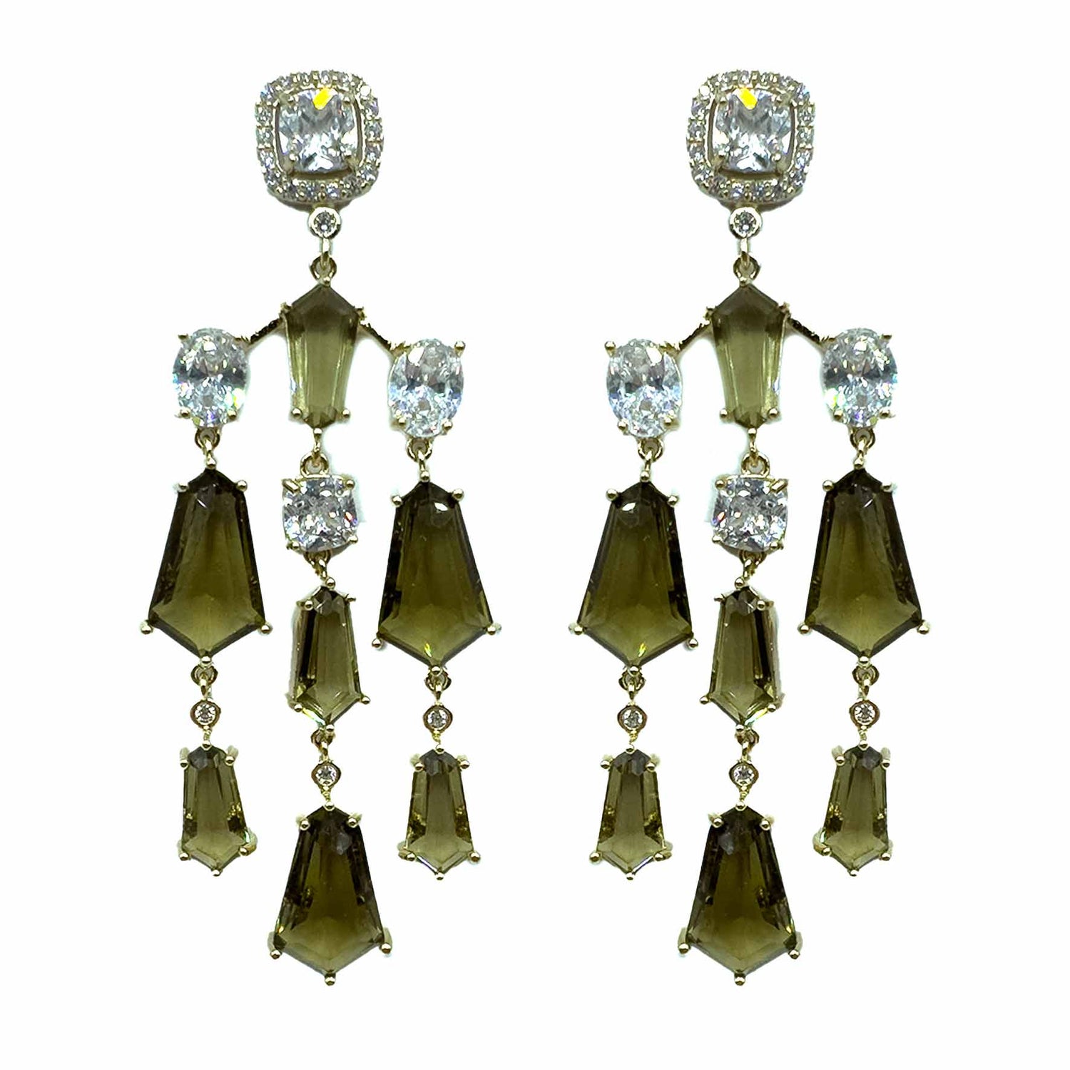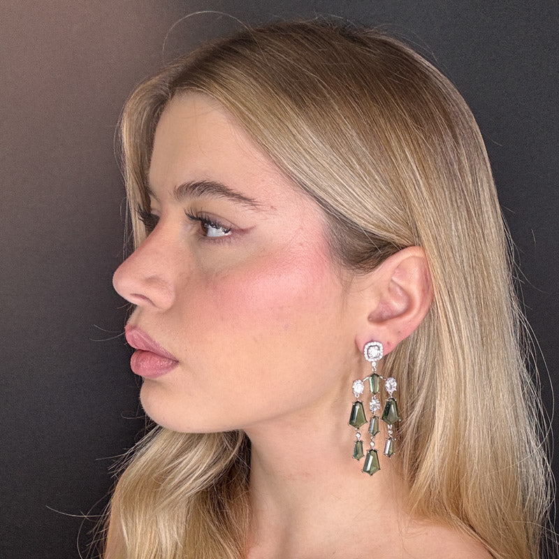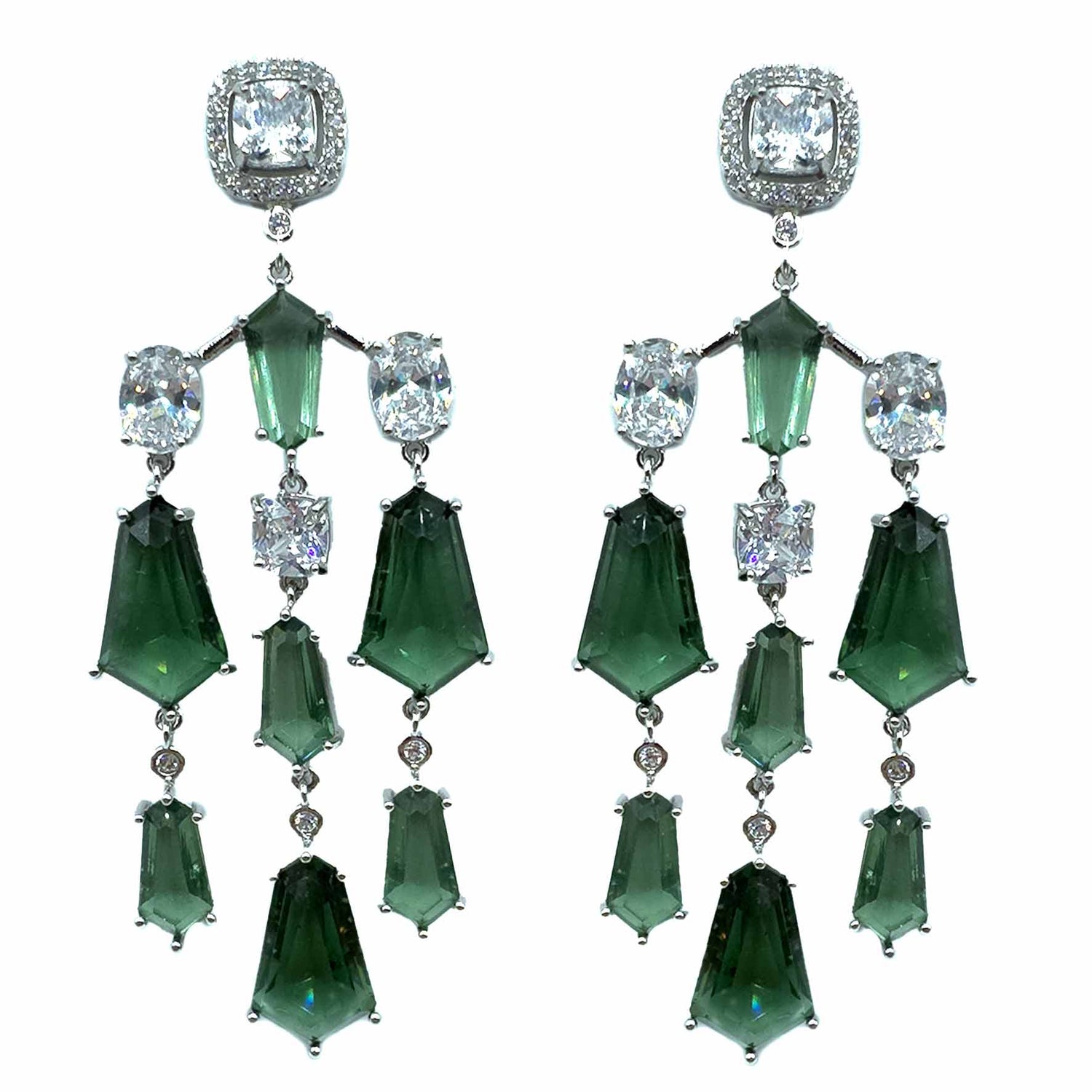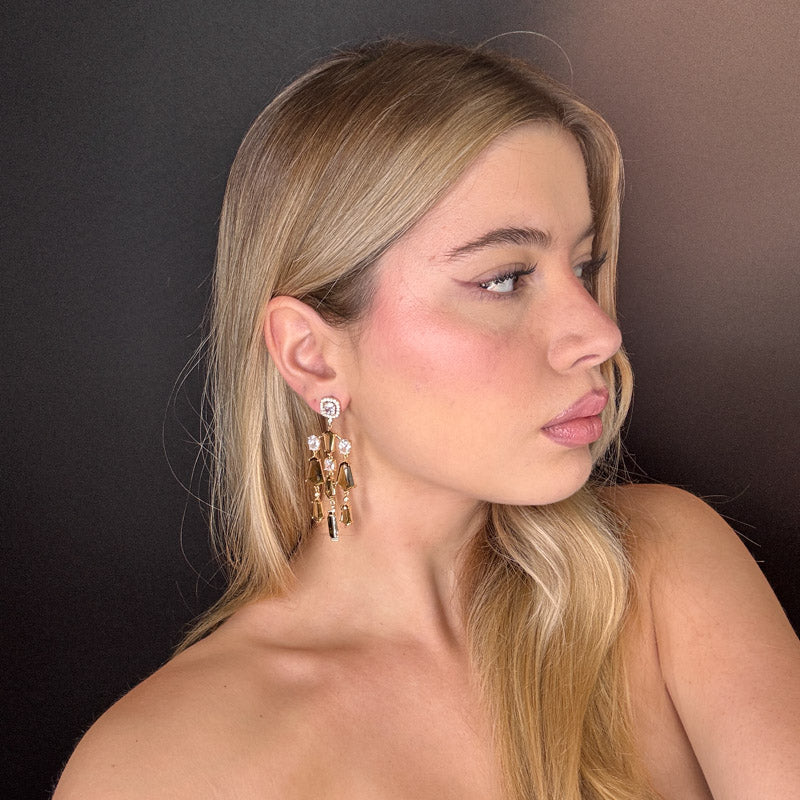 Orecchini pendenti a forma di lampadari, con pietre e cristalli luminosi, ed una piccola cornice di pavè, gold/silver plated