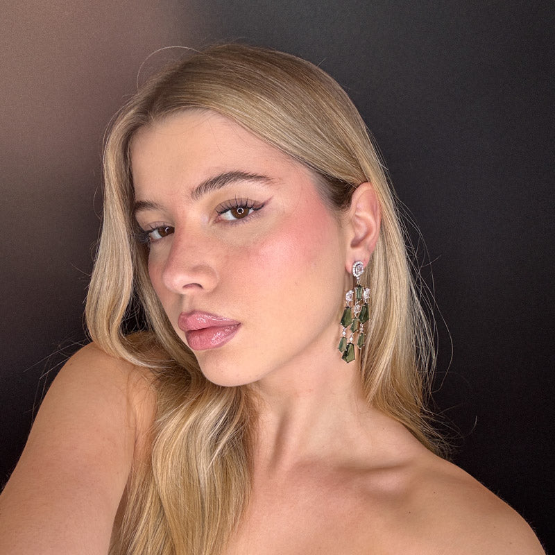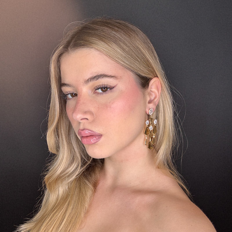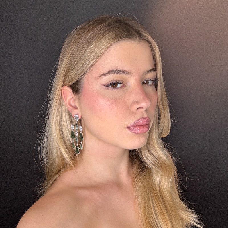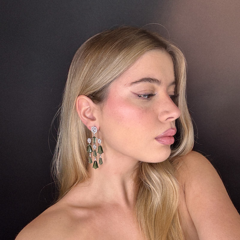 Orecchini pendenti a forma di lampadari, con pietre e cristalli luminosi, ed una piccola cornice di pavè, gold/silver plated