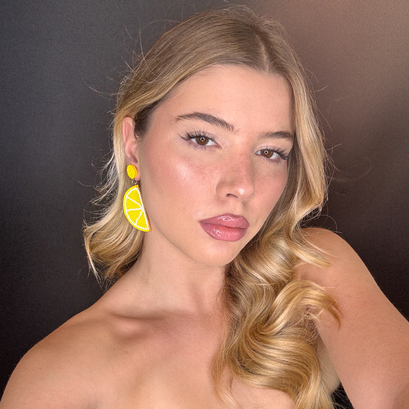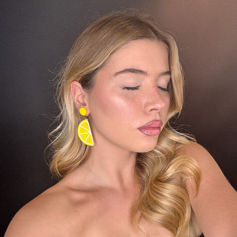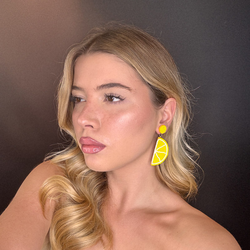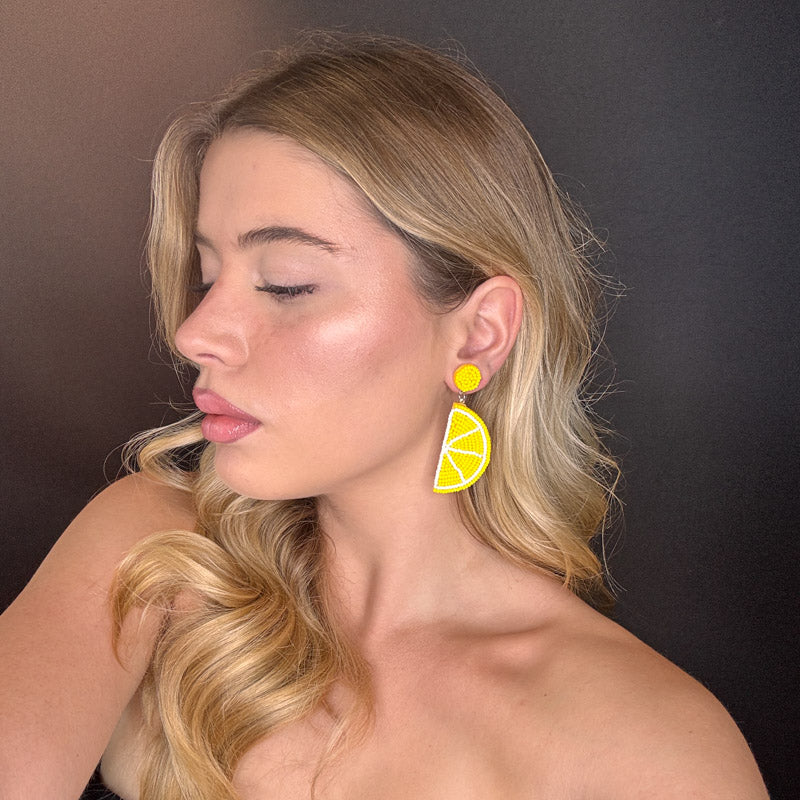 Orecchini a forma di spicchio di limone decorato con perline colorate su base di pannolenci, silver plated.