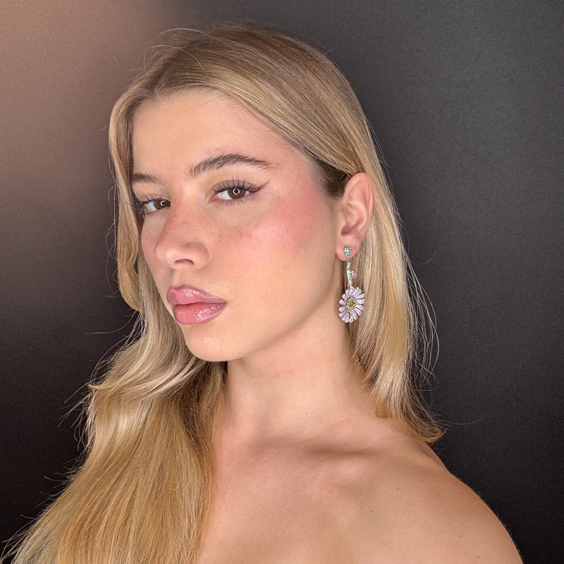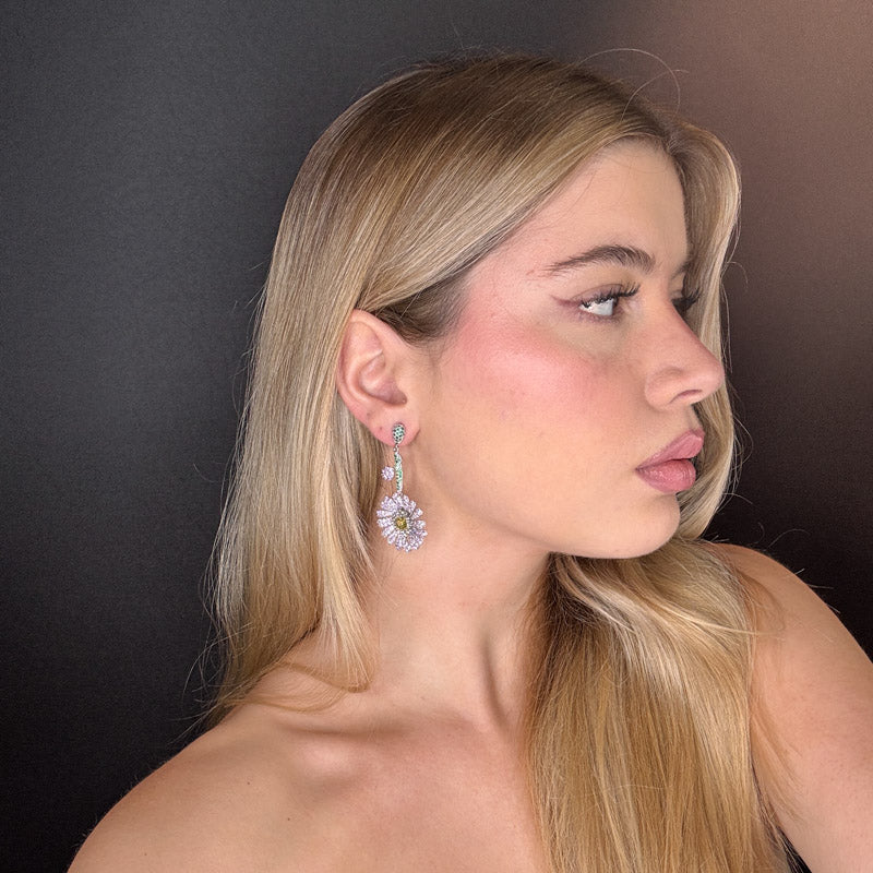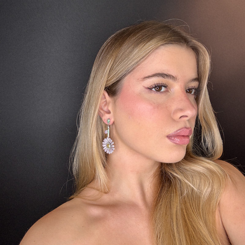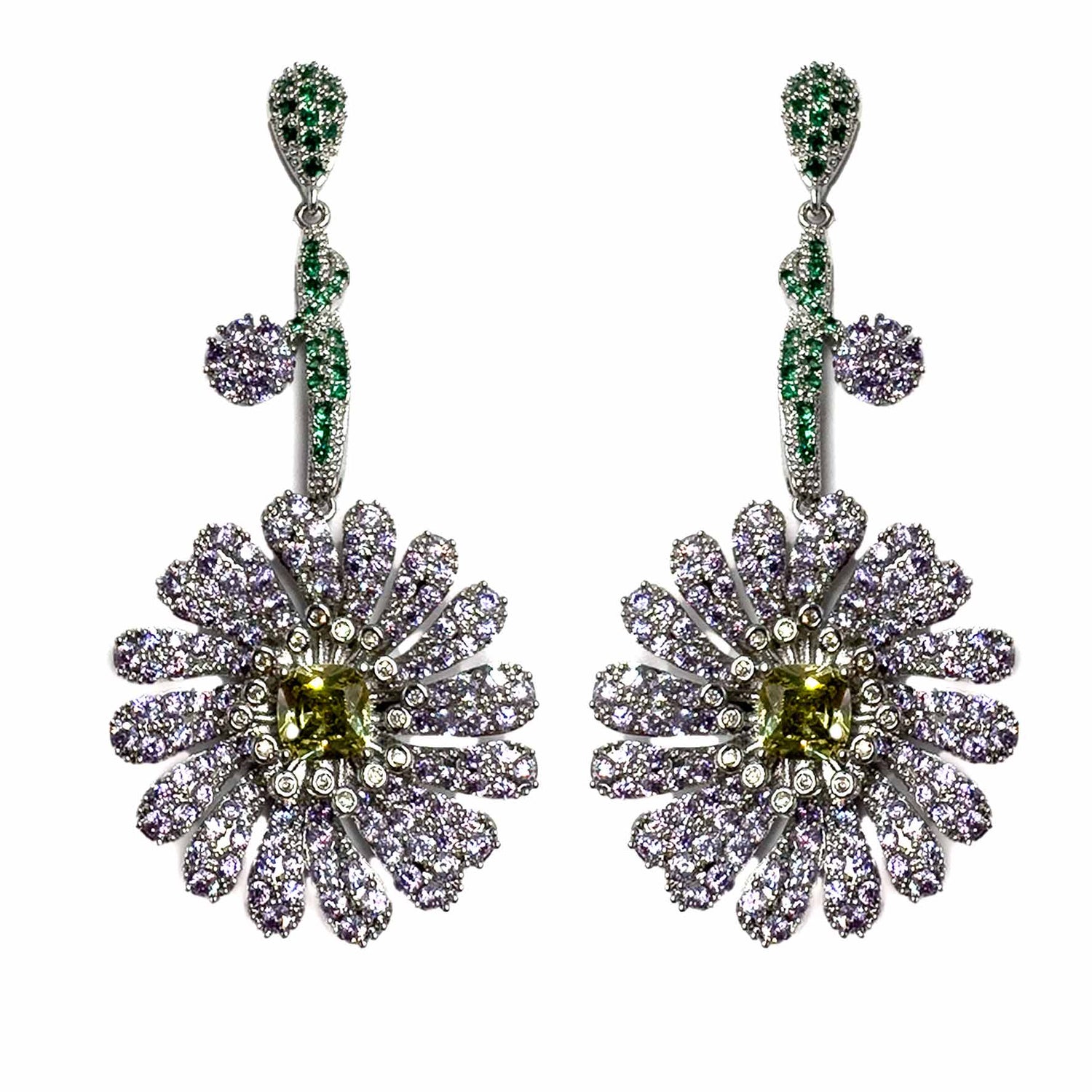 Orecchini pendenti a forma di margherita a testa in giù, ricoperti zirconi e cristalli, placcati silver