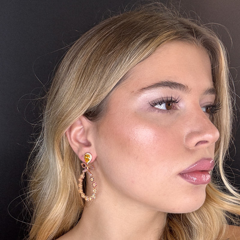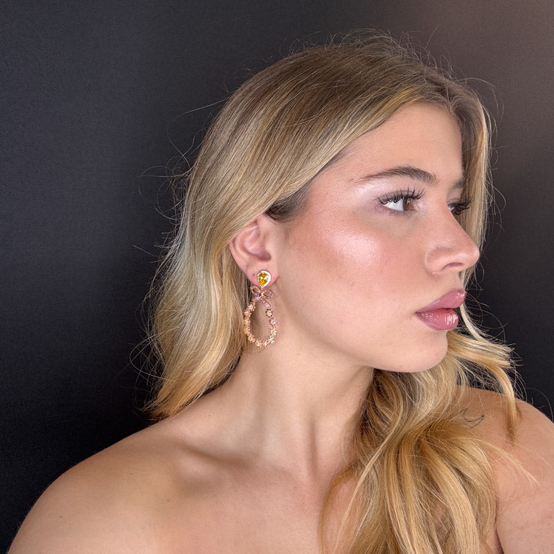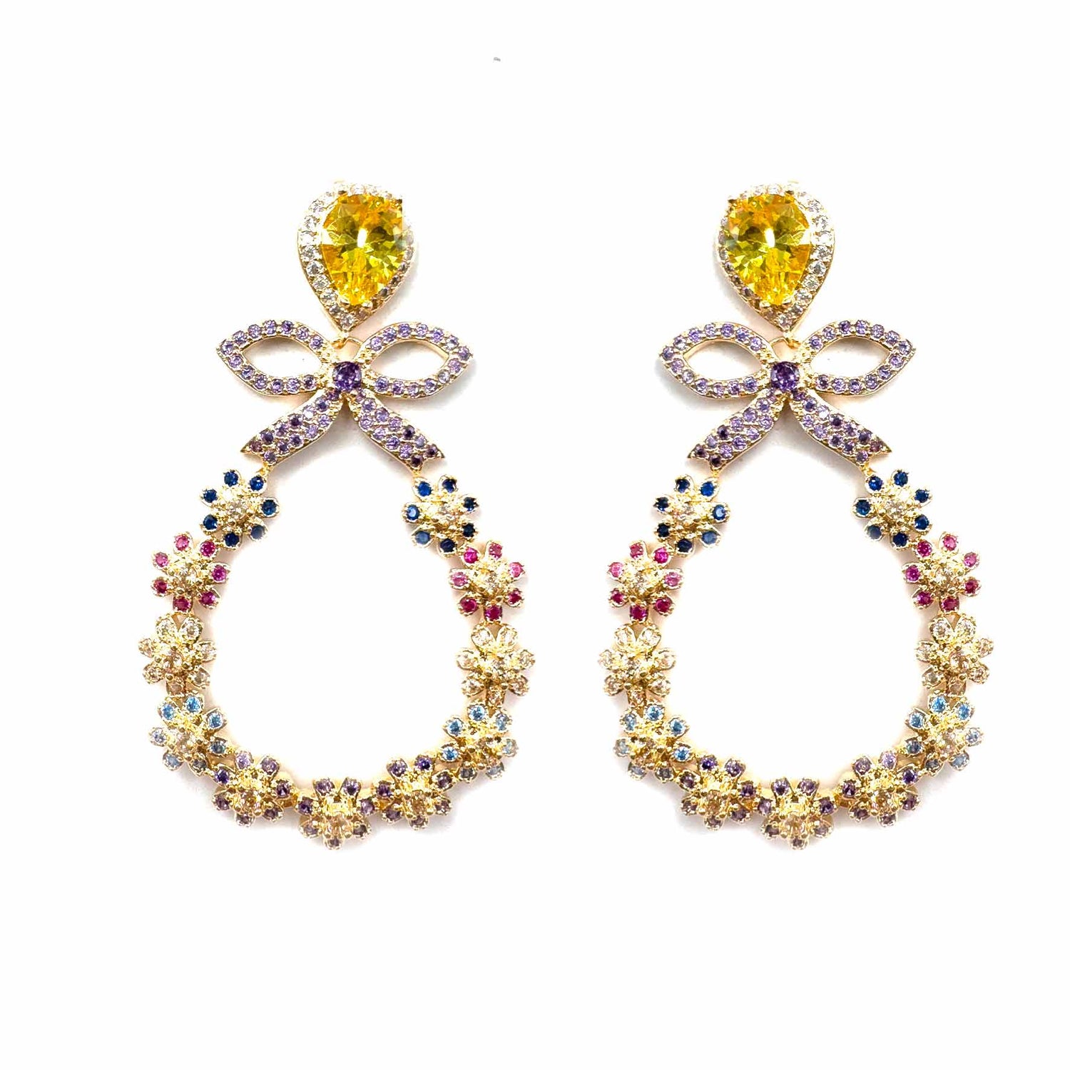 Orecchini pendenti a forma di cerchio di margherite con chiusura a fiocco, con tripudio di zirconi multicolor e pietre colorate incastonate cristallo e giallo caldo