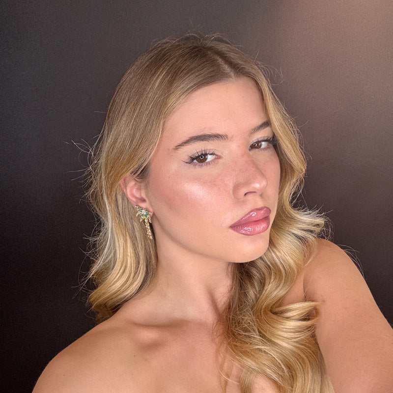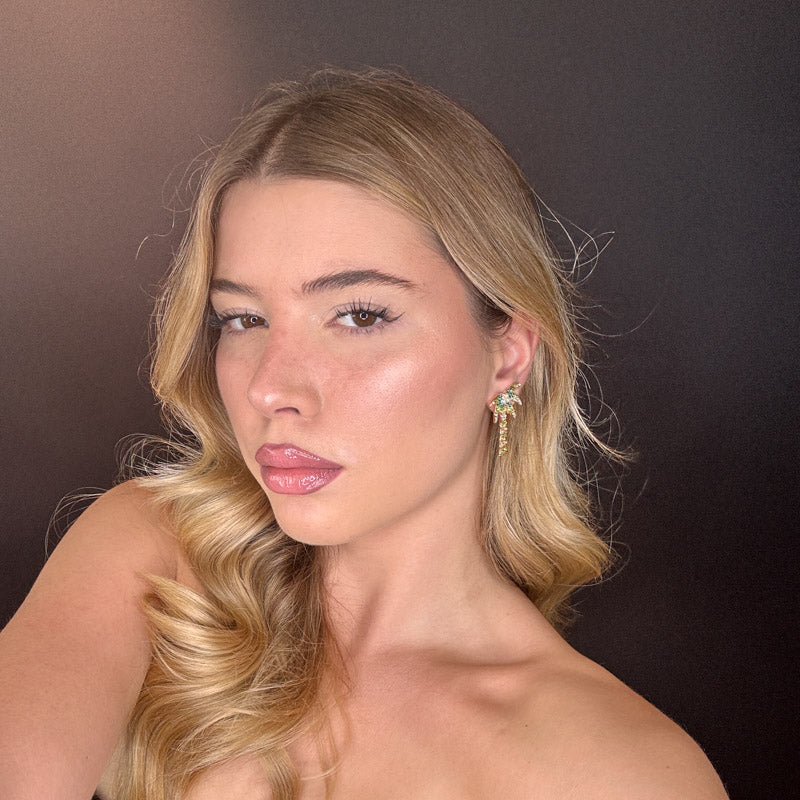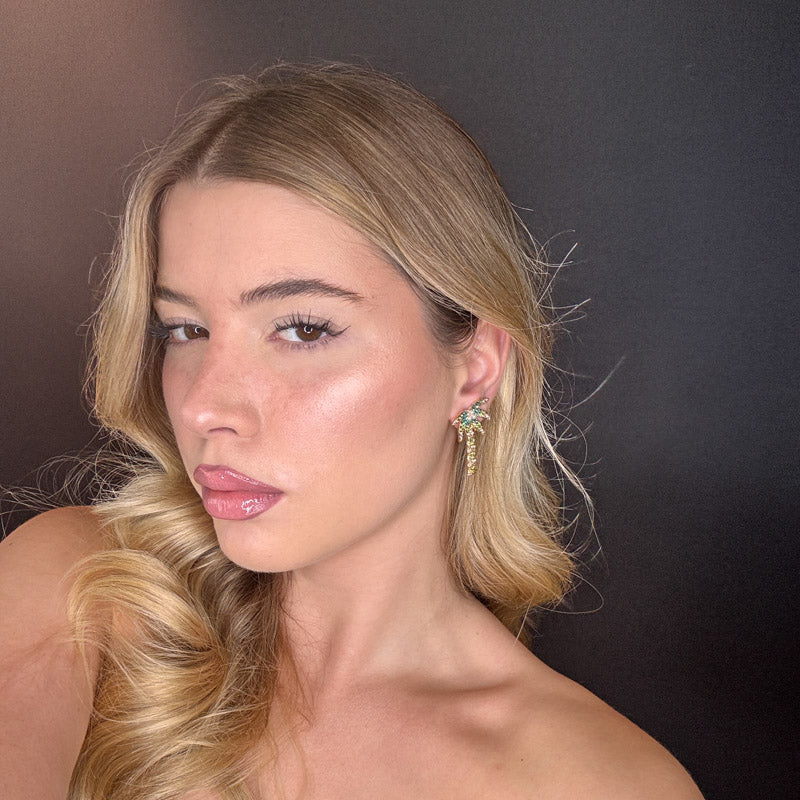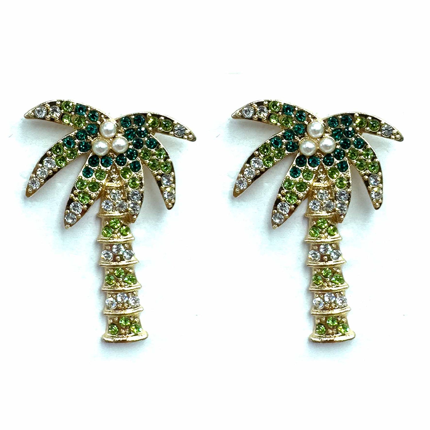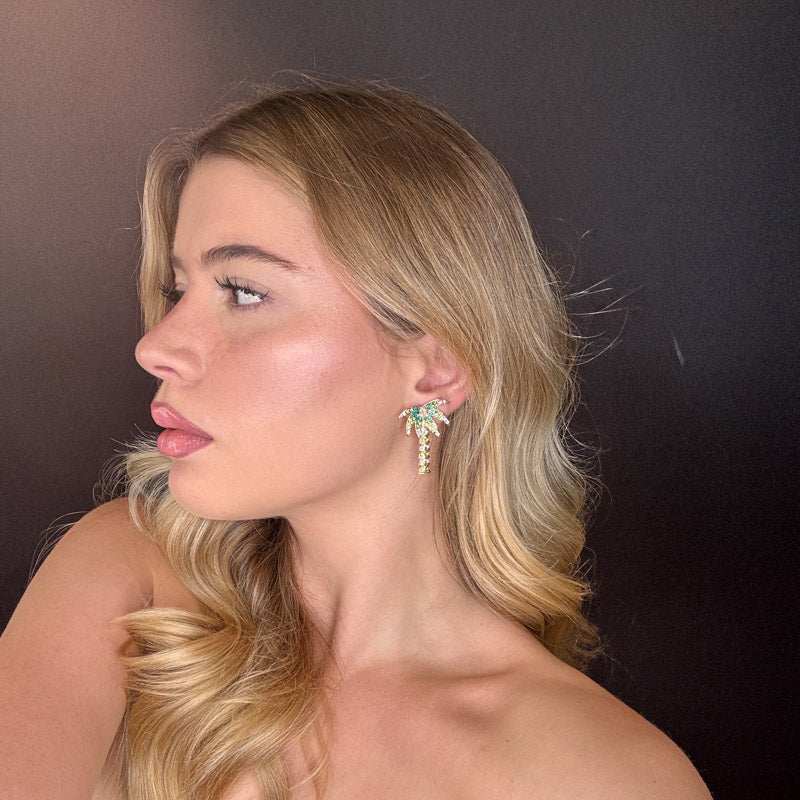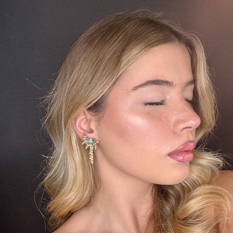 Orecchini pendenti a forma di palme decorate da zirconi colorati sui toni del verde, e tre perline bianche, con struttura gold plated