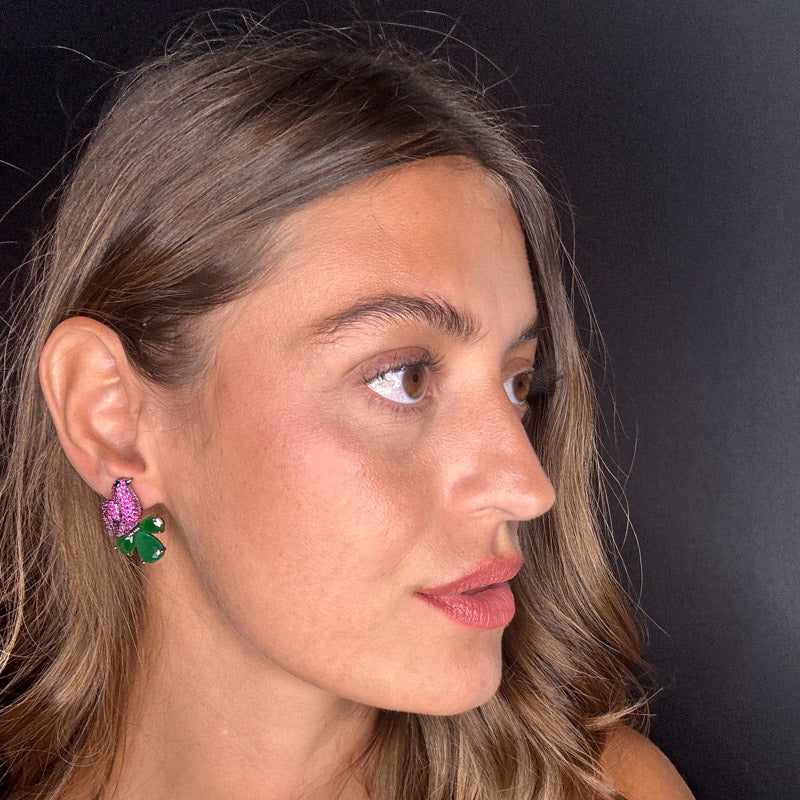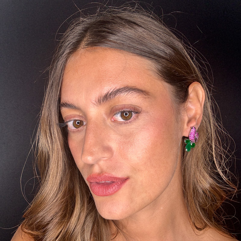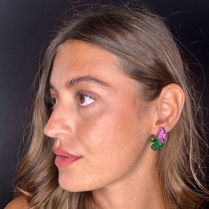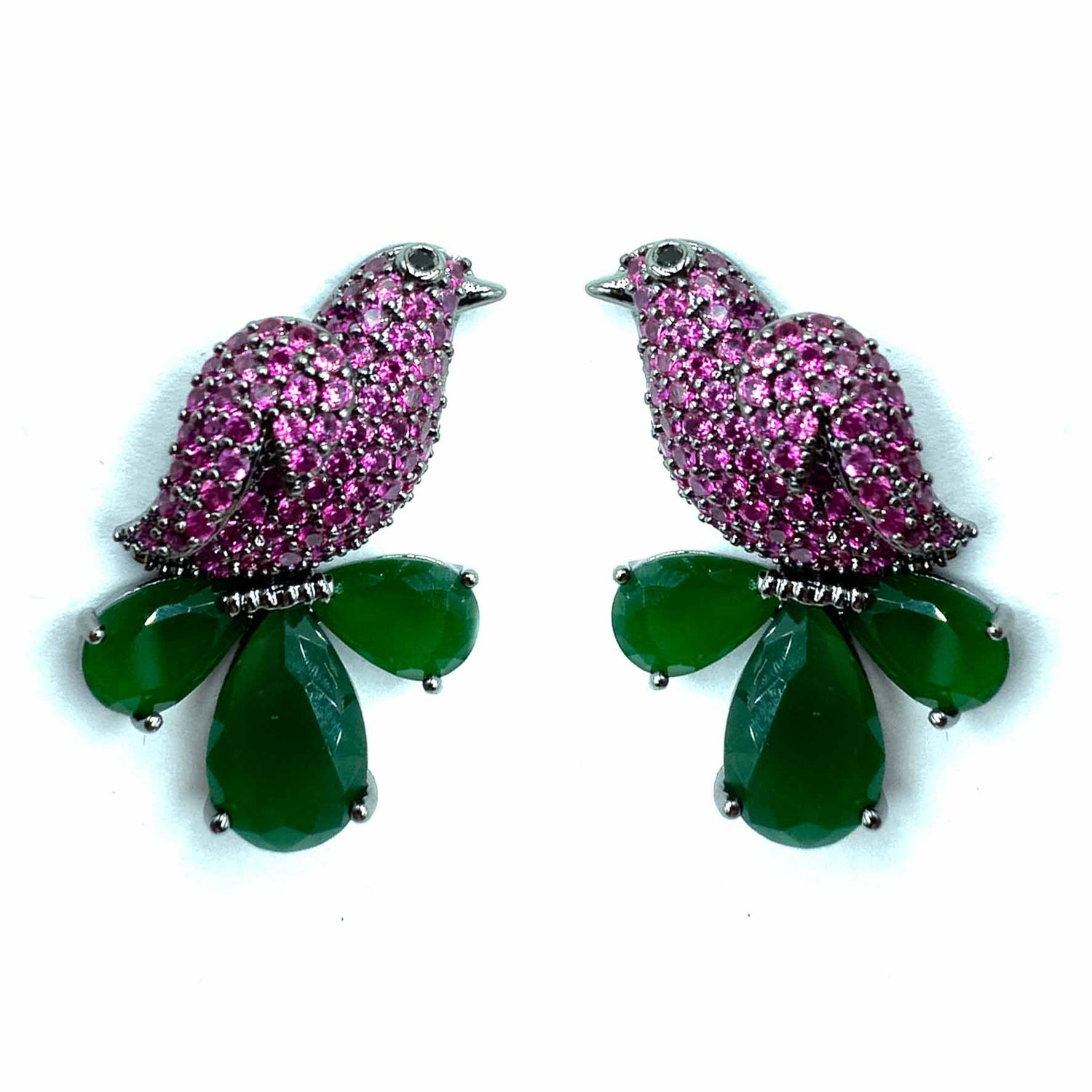 Orecchini pendenti a forma di uccellino passerotto, ricoperti da una distesa di zirconi fucsia, con tre delicate pietre verdi smeraldo, su una base elegante silver plated.