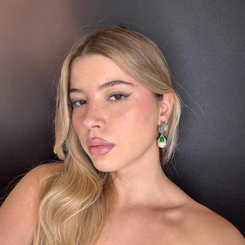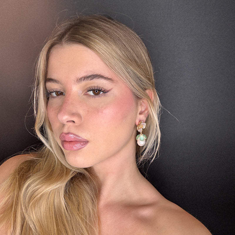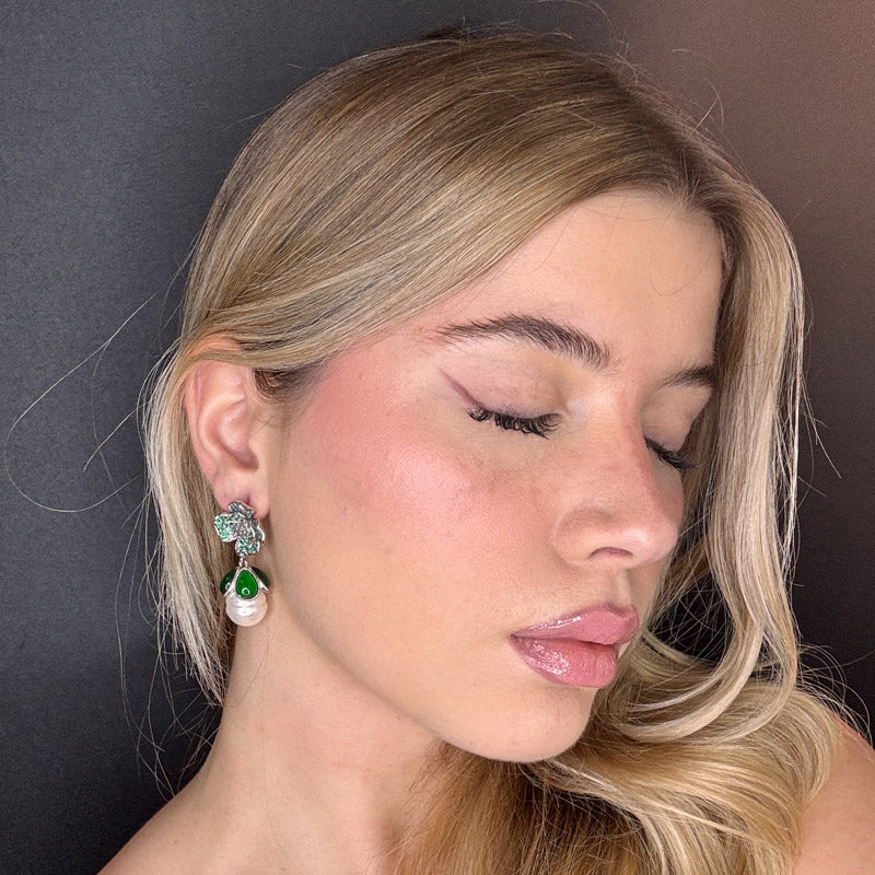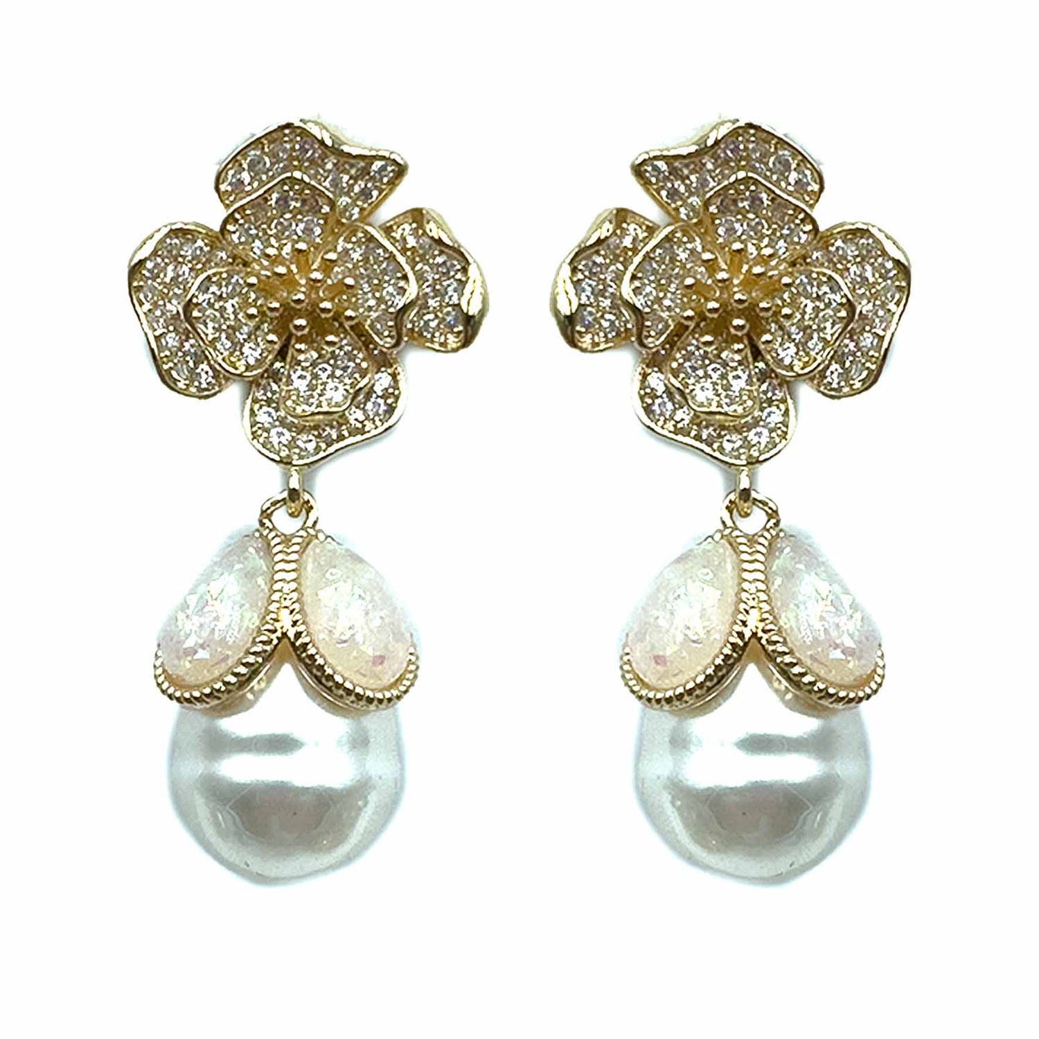 Orecchini pendenti a forma di peonia con perla pendente simile ad un alveare, decorati di pavè luminoso, placcati gold/silver