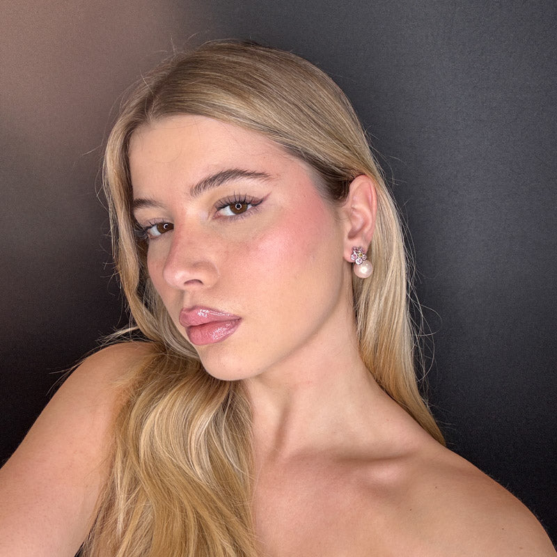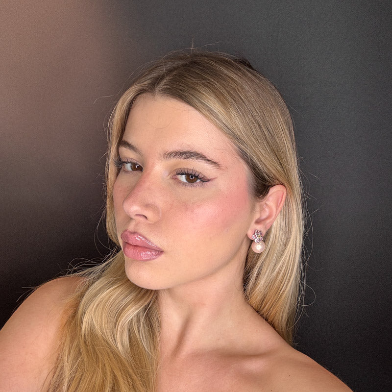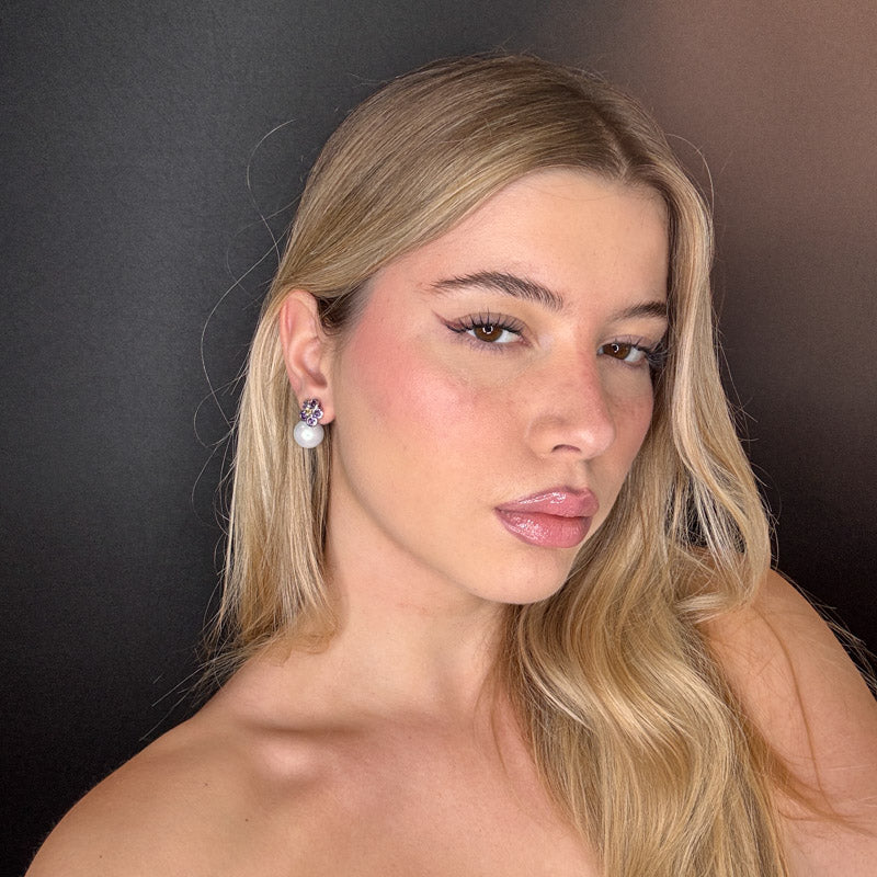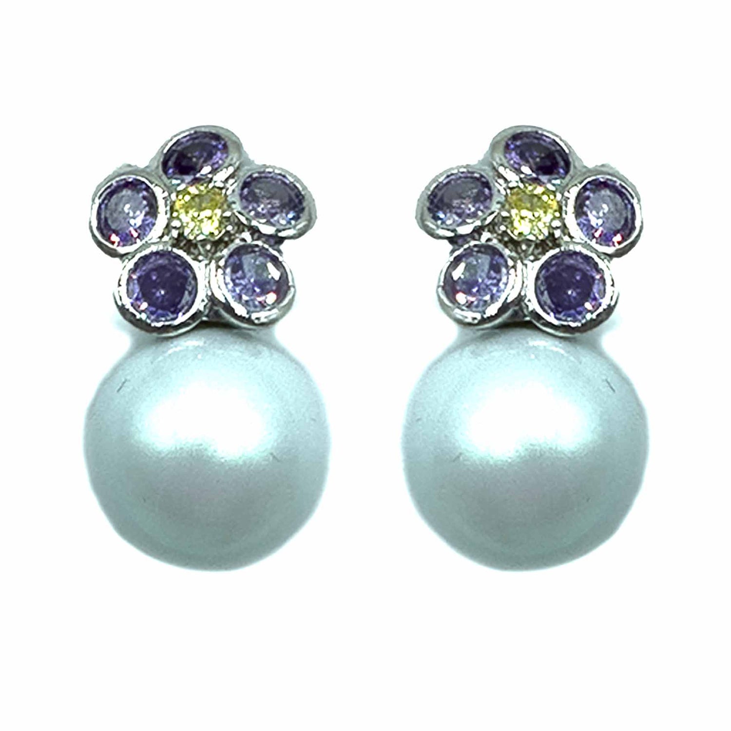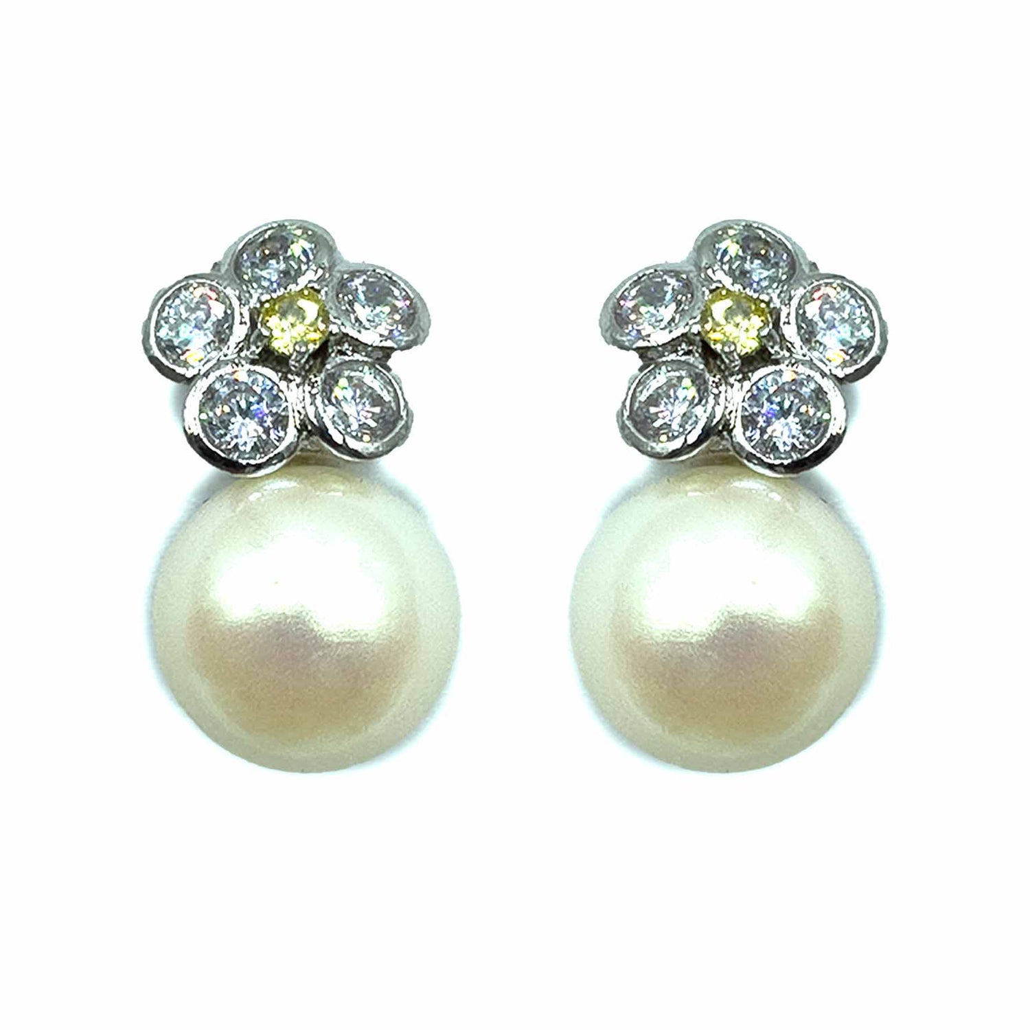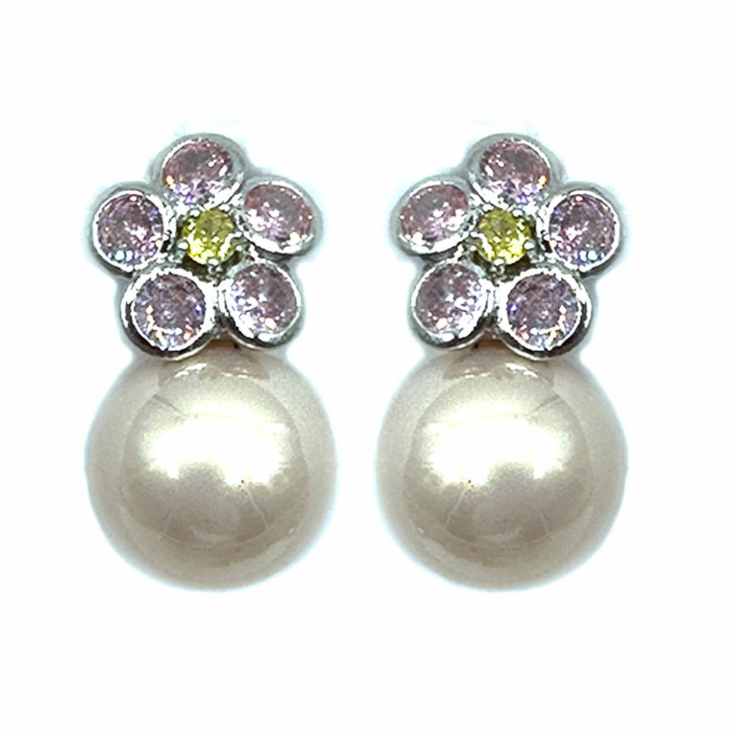 Orecchini pendenti a forma di perlina con fiorellini di zirconi, placcati silver