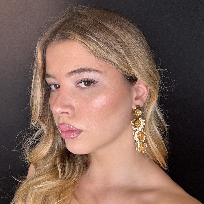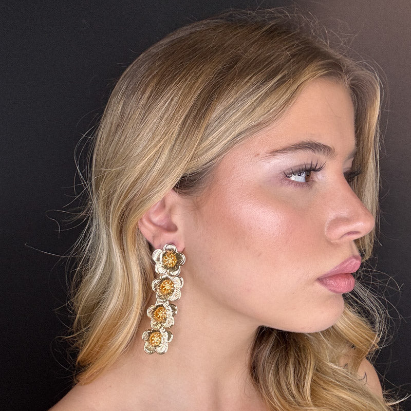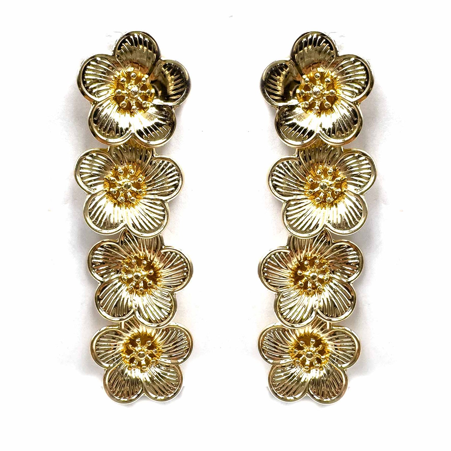 Orecchini pendenti con sequenza di fiori gold plated zigrinati sulla superficie