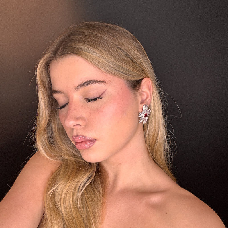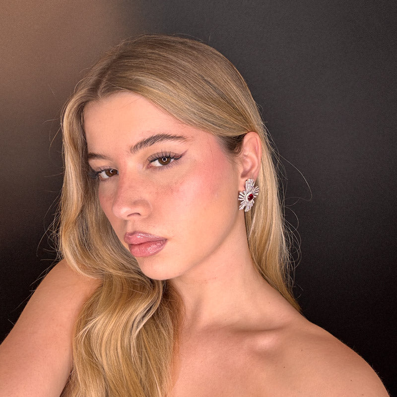 Orecchini pendenti a forma di raggi con pietra centrale, incastonati di zirconi cristallo e una pietra rosso rubino al centro, placcati silver