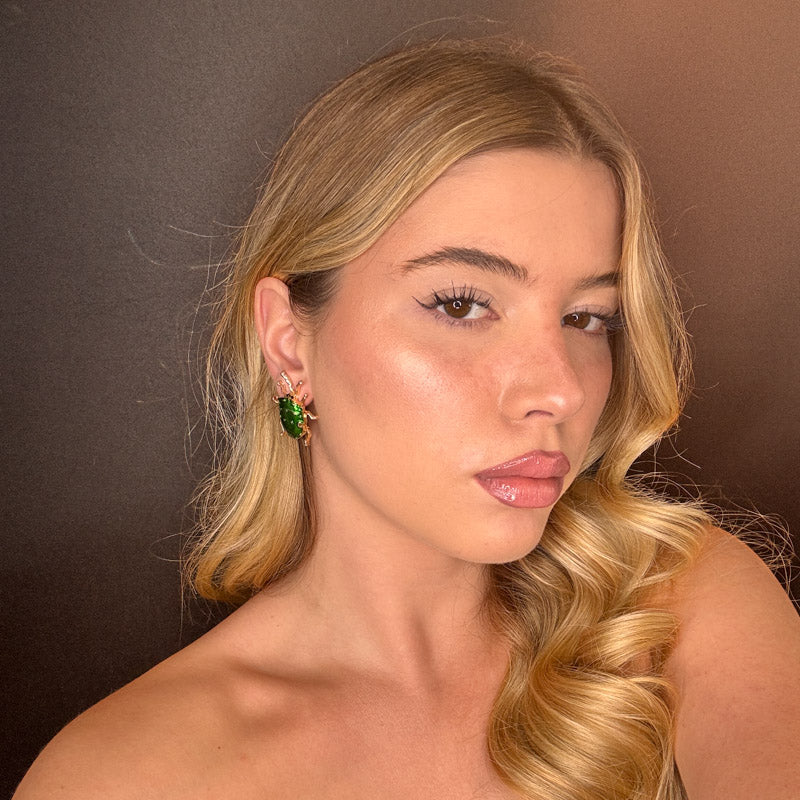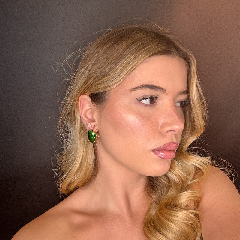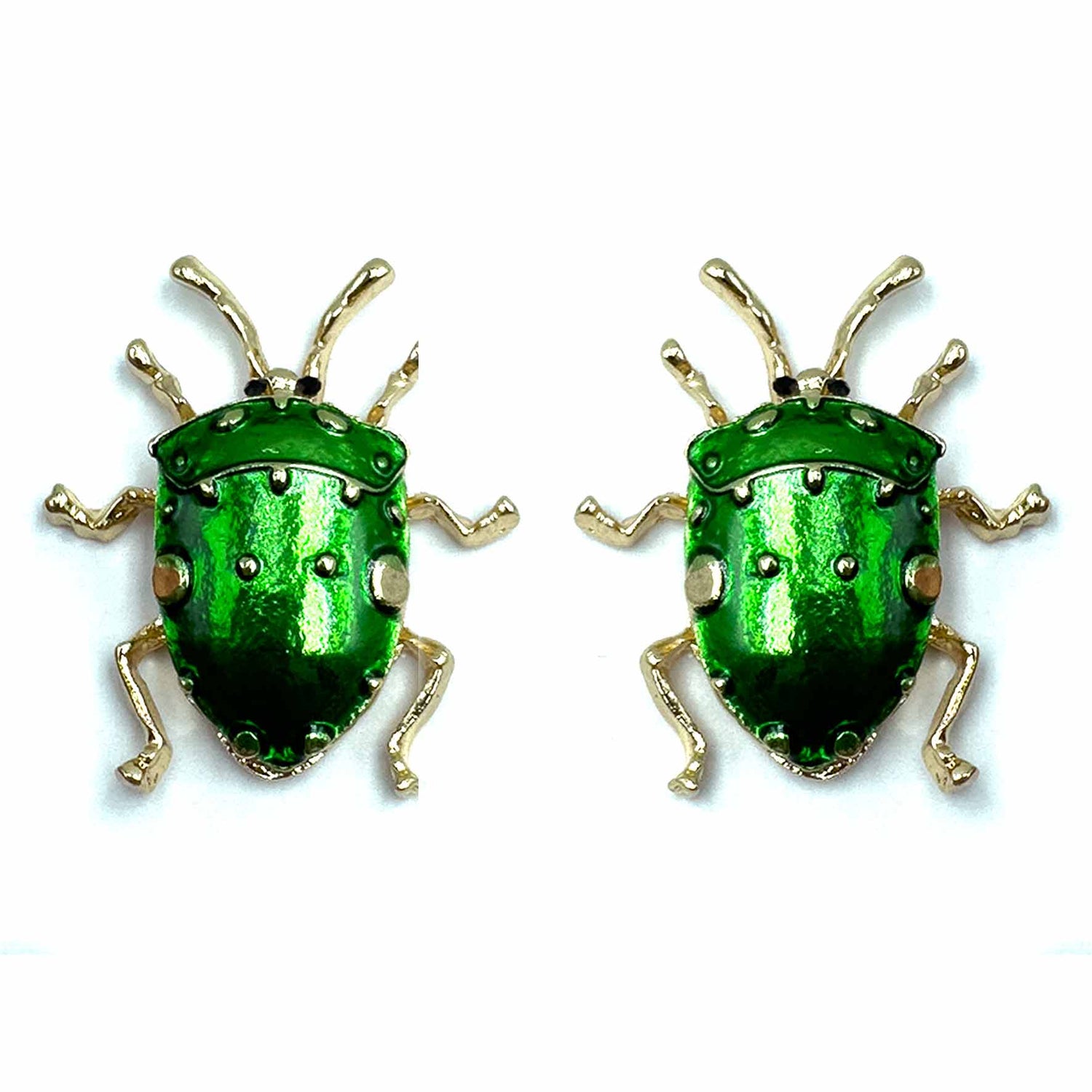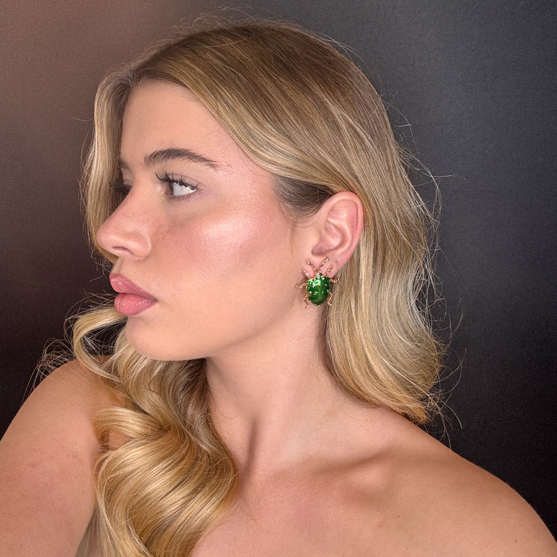 Orecchini a forma di scarabeo, superficie smaltata di verde, struttura gold plated.
