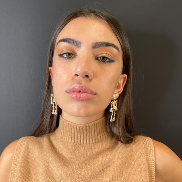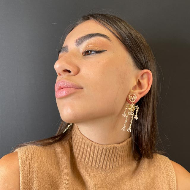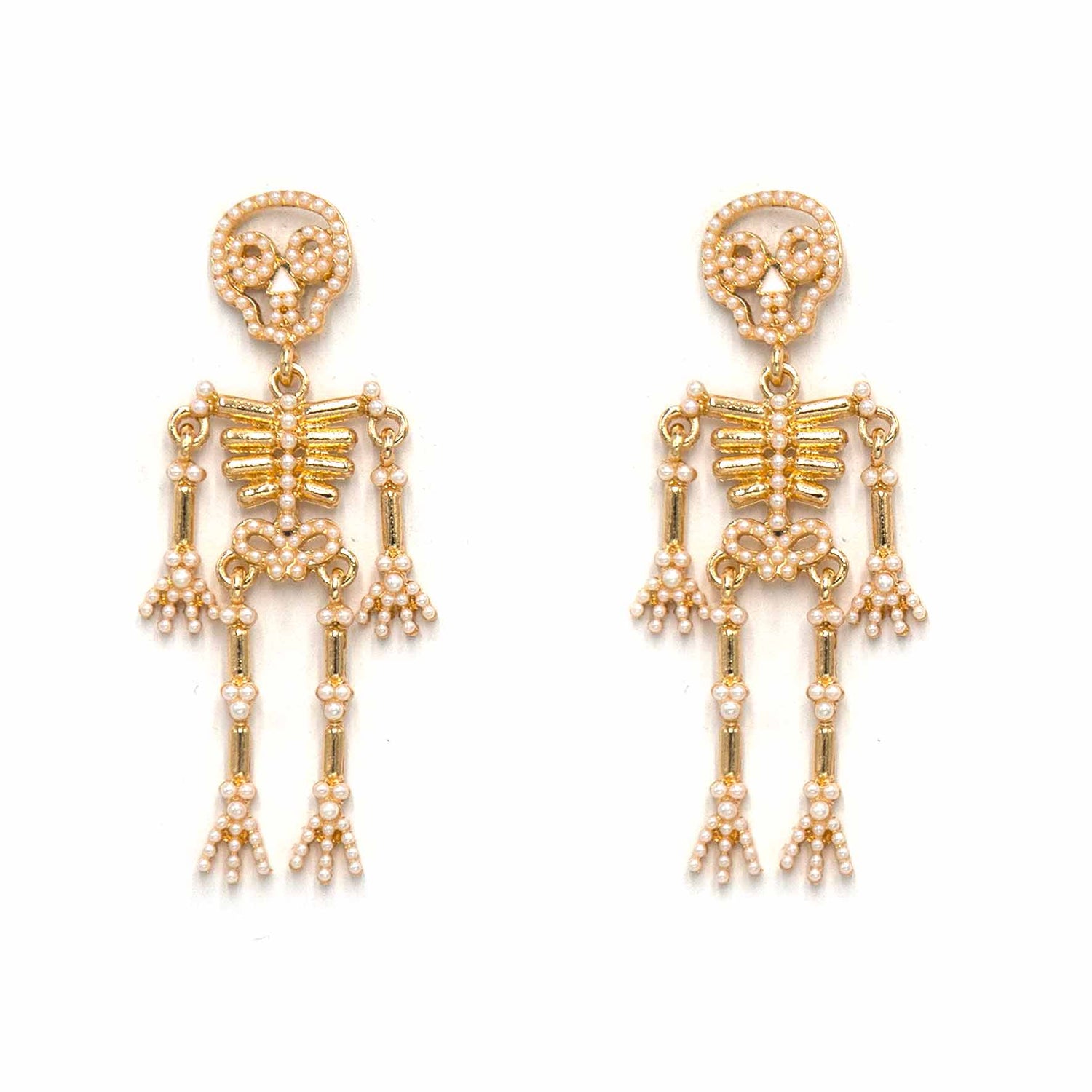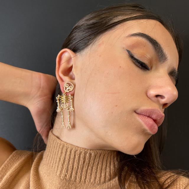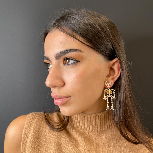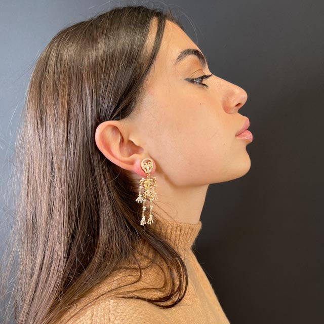 Orecchini a forma di scheletri con perline incastonate su tutta la struttura a base gold.
