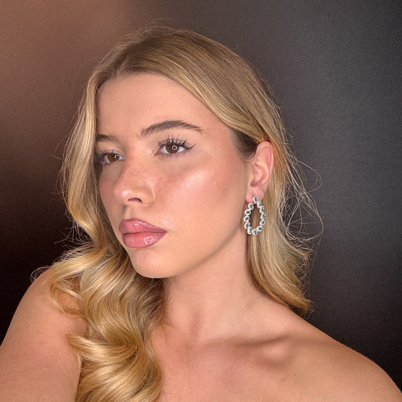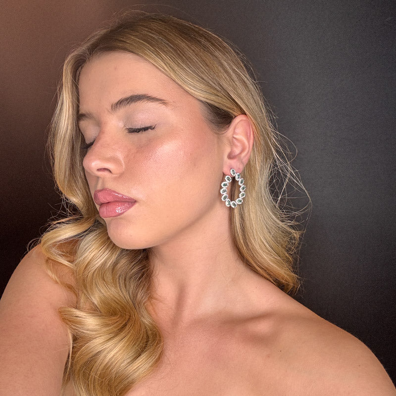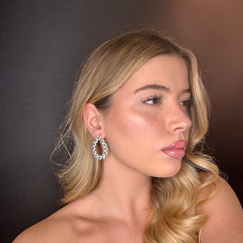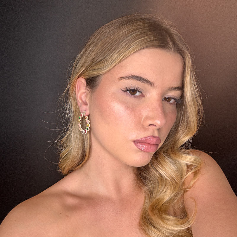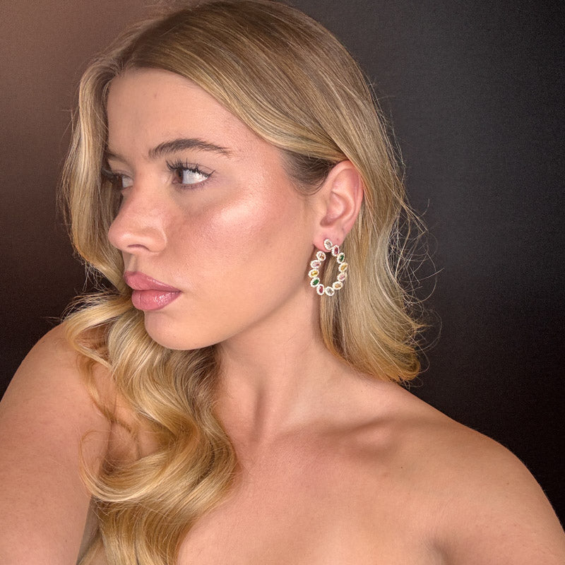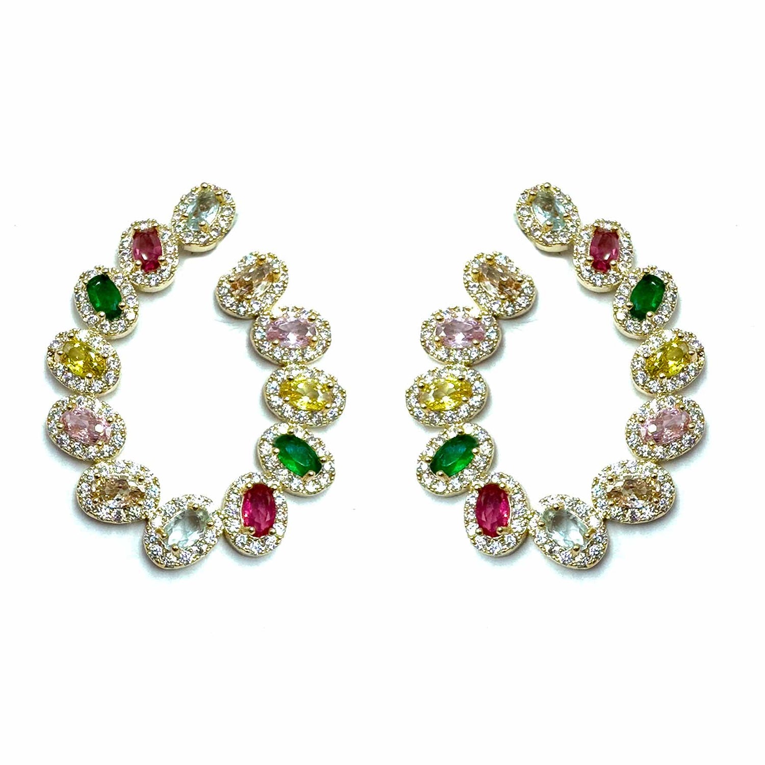 Orecchini pendenti a forma di semicerchio pietre colorate incorniciate da pavè cristallo, placcati gold/silver