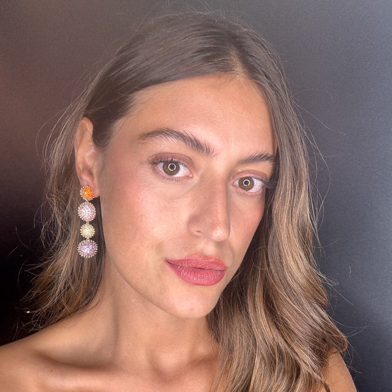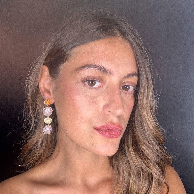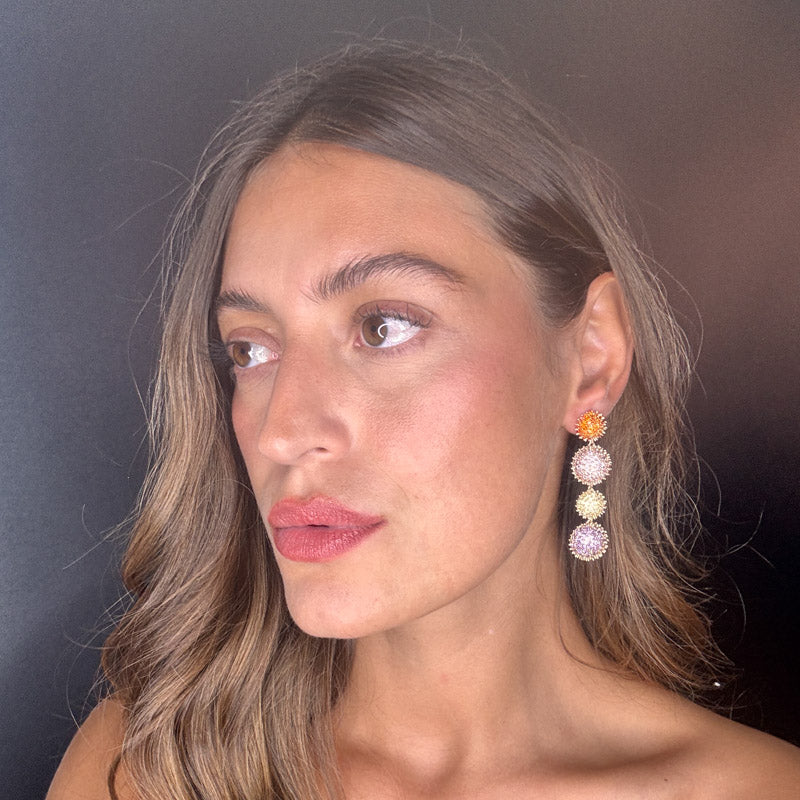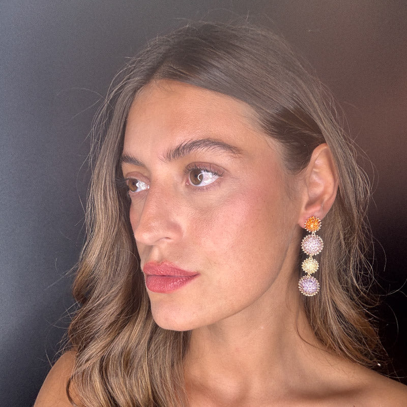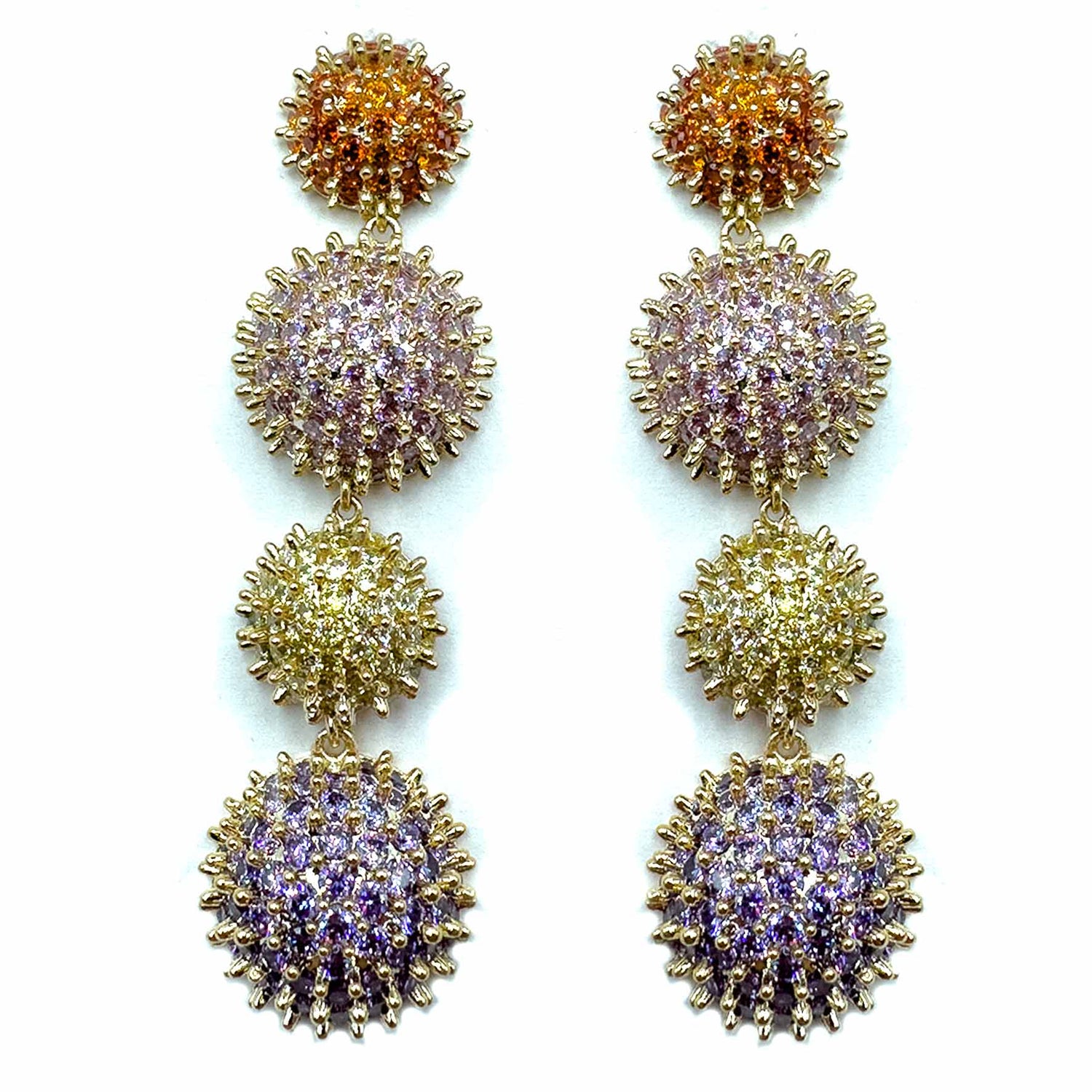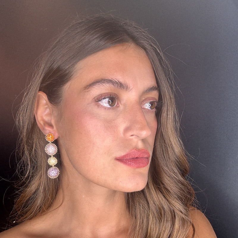 Orecchini pendenti composti da una serie di sfere smaltate in vari colori, arricchiti da un dettaglio a raggio placcato in oro, proprio come la struttura che sostiene l'intero gioiello.