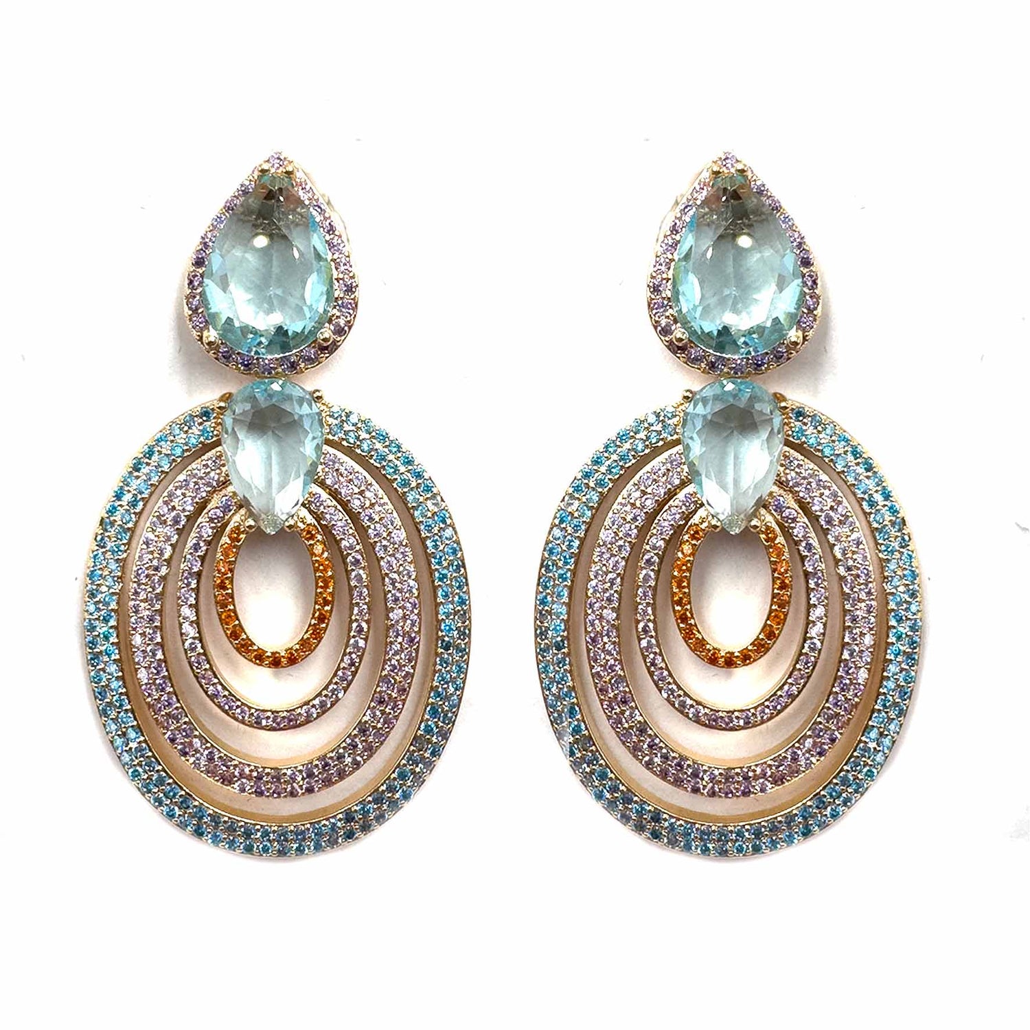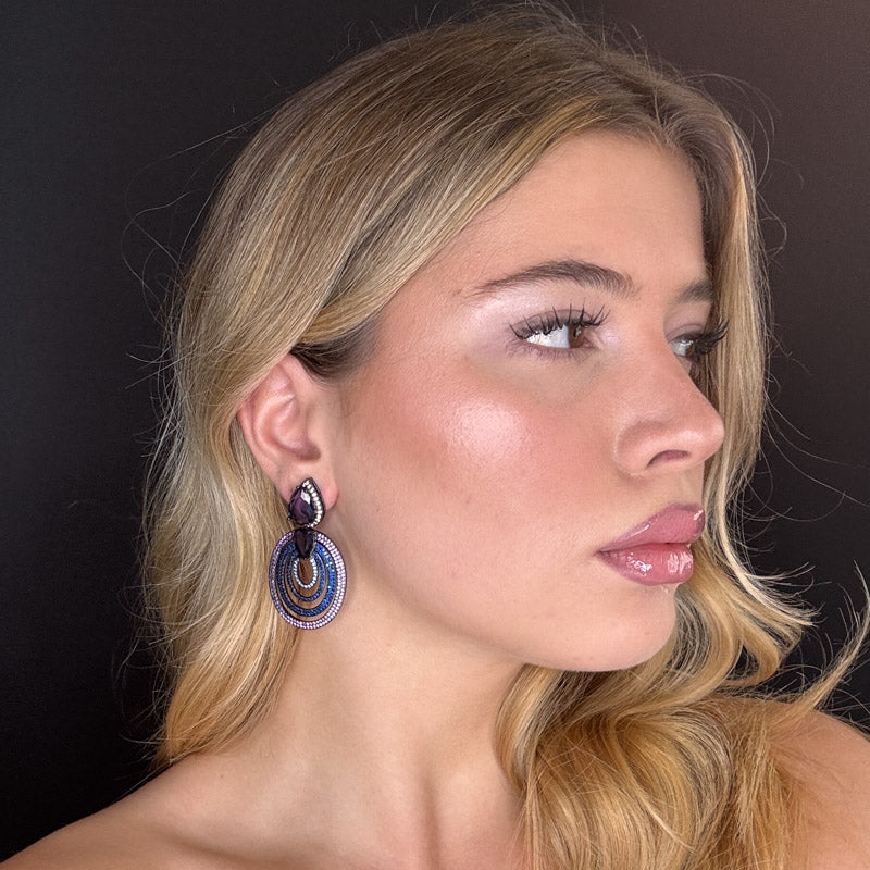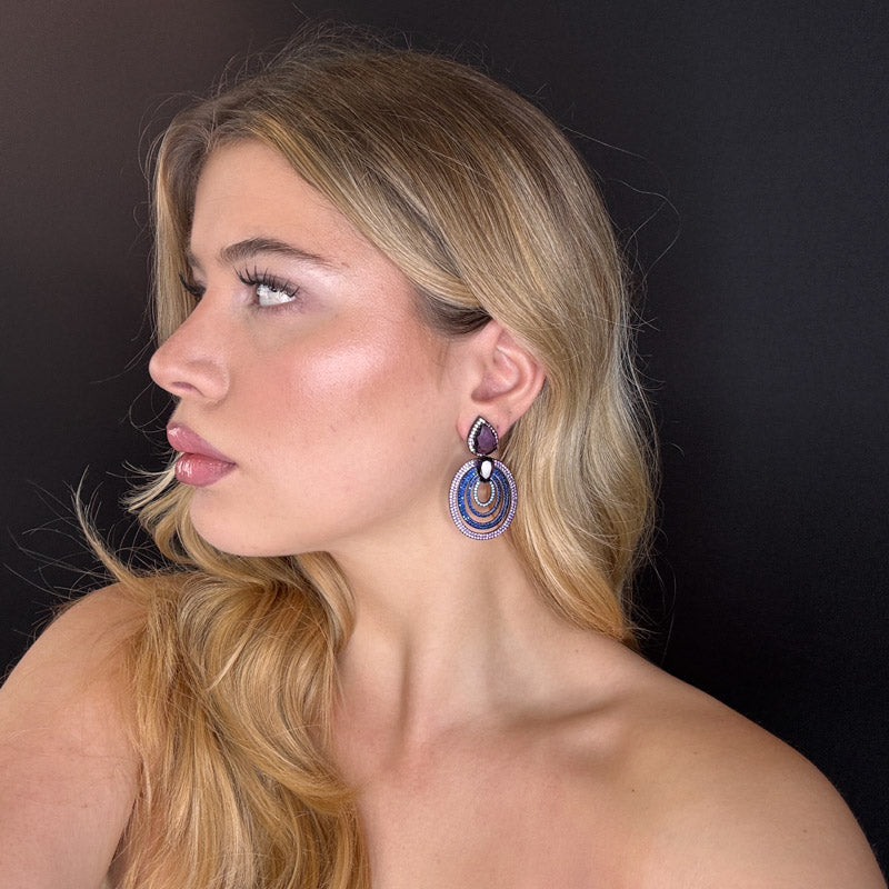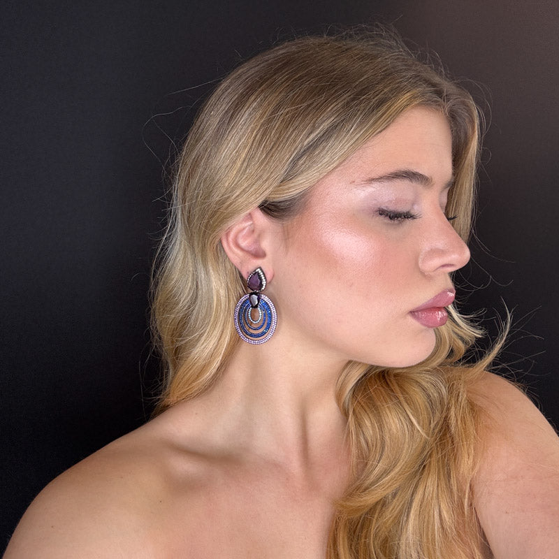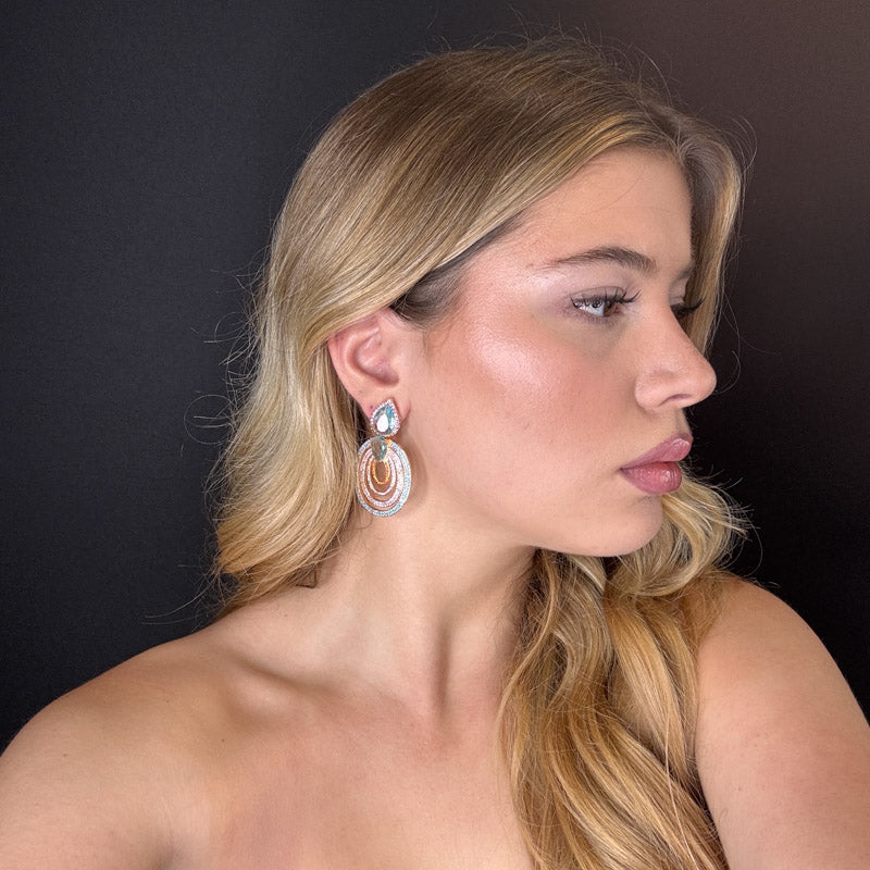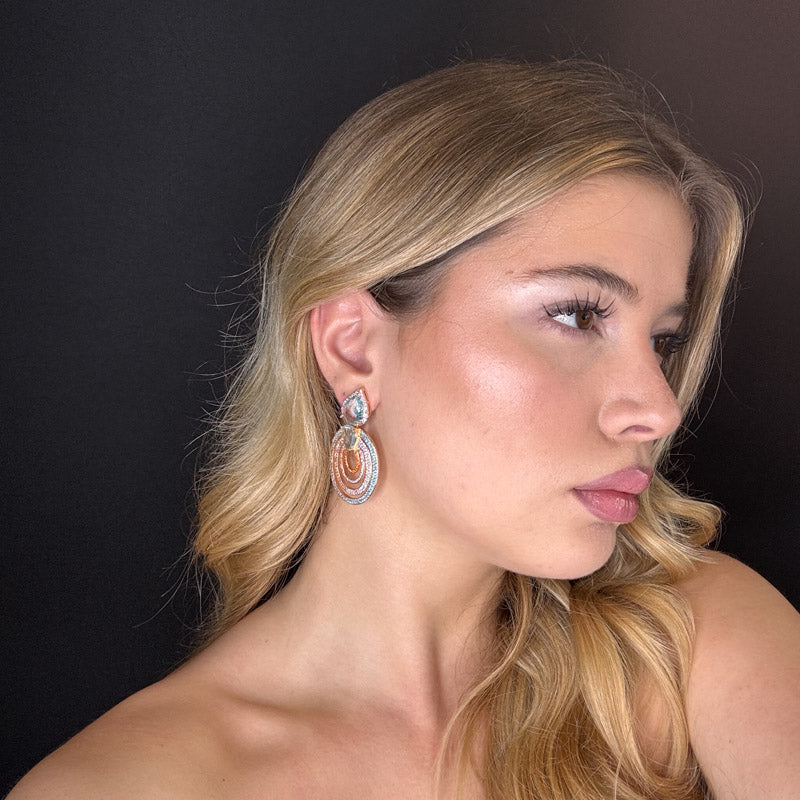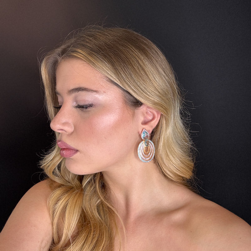 Orecchini pendenti con doppia goccia a pietra e tondo di pavè concentrico