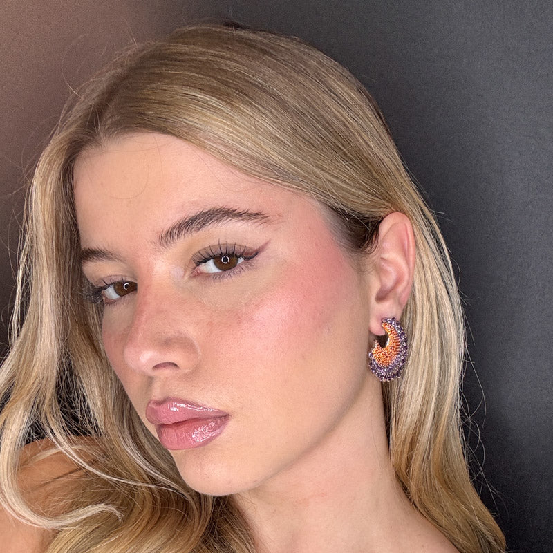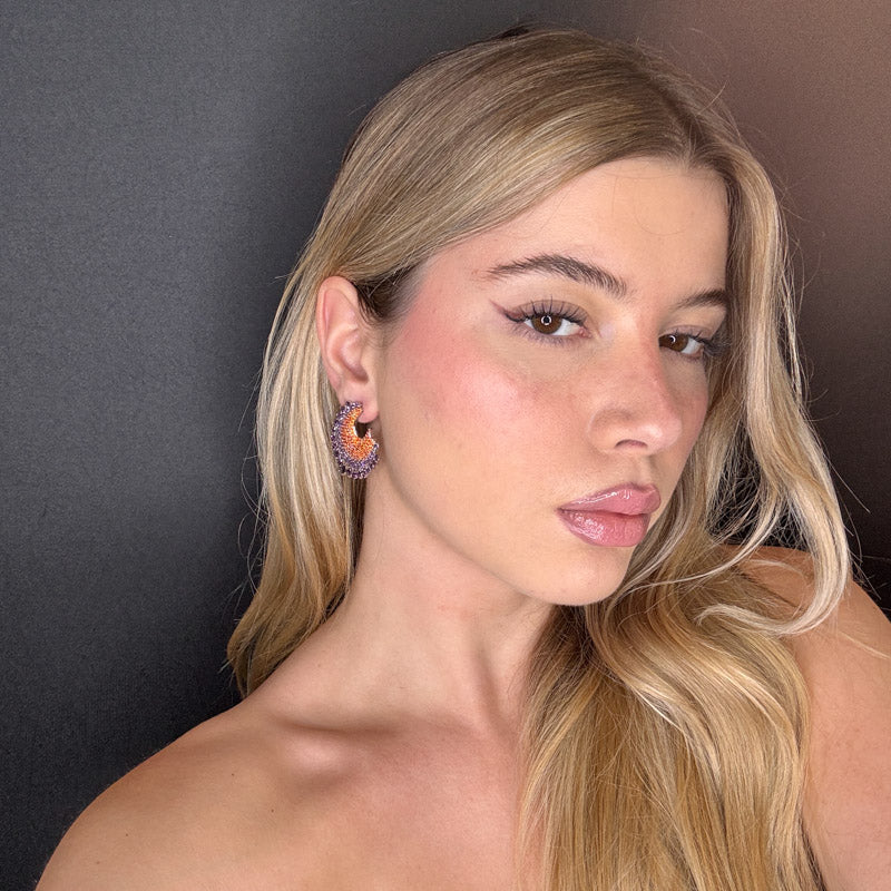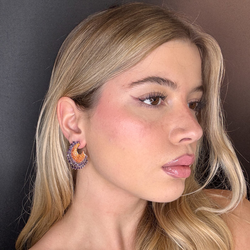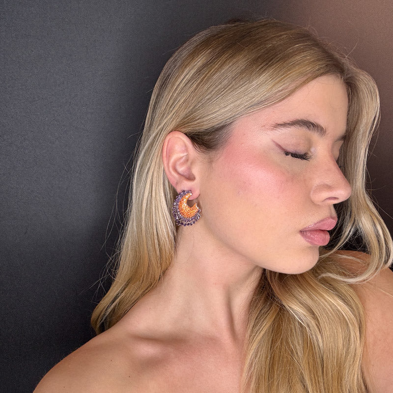 Orecchini pendenti a forma di semicerchio, con cristalli viola e pavè arancio, placcati silver.