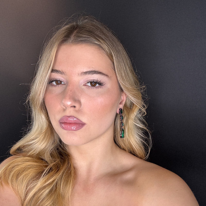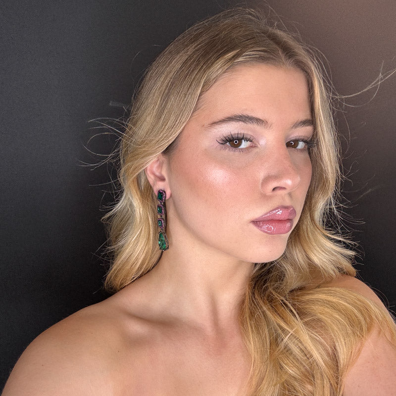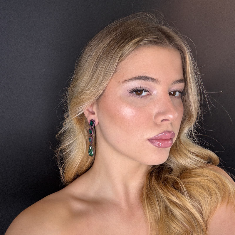 Orecchini pendenti con tripudio di zirconi fucsia che corniciano i cristalli color smeraldo, con goccia finale color smeraldo