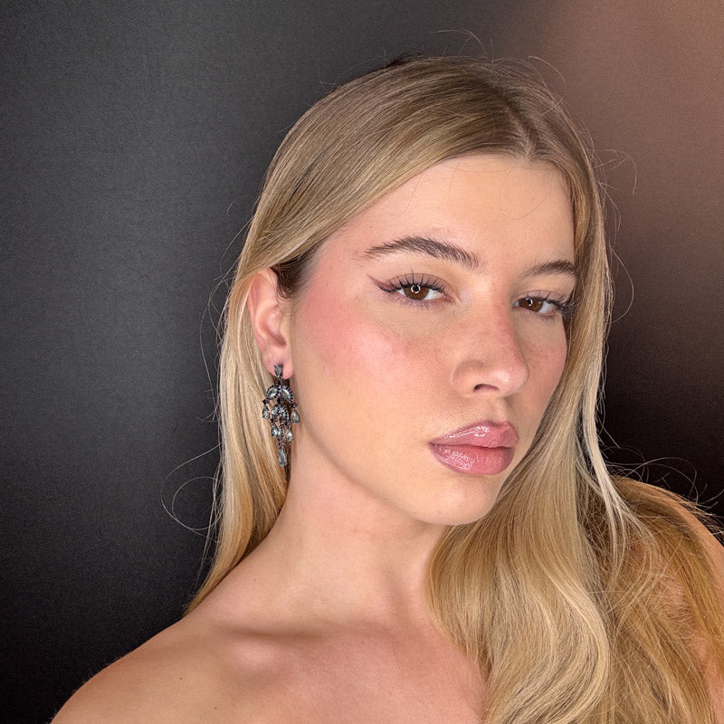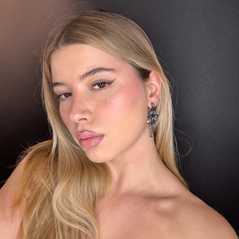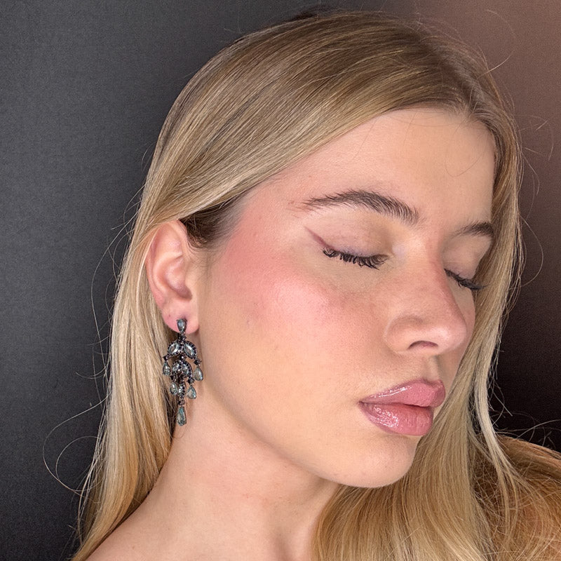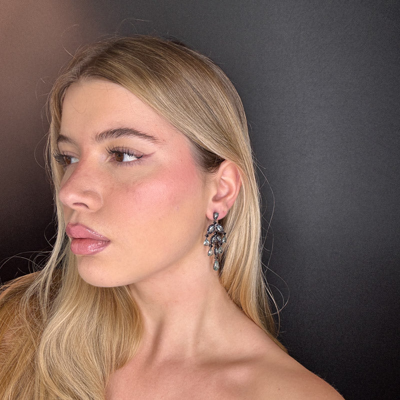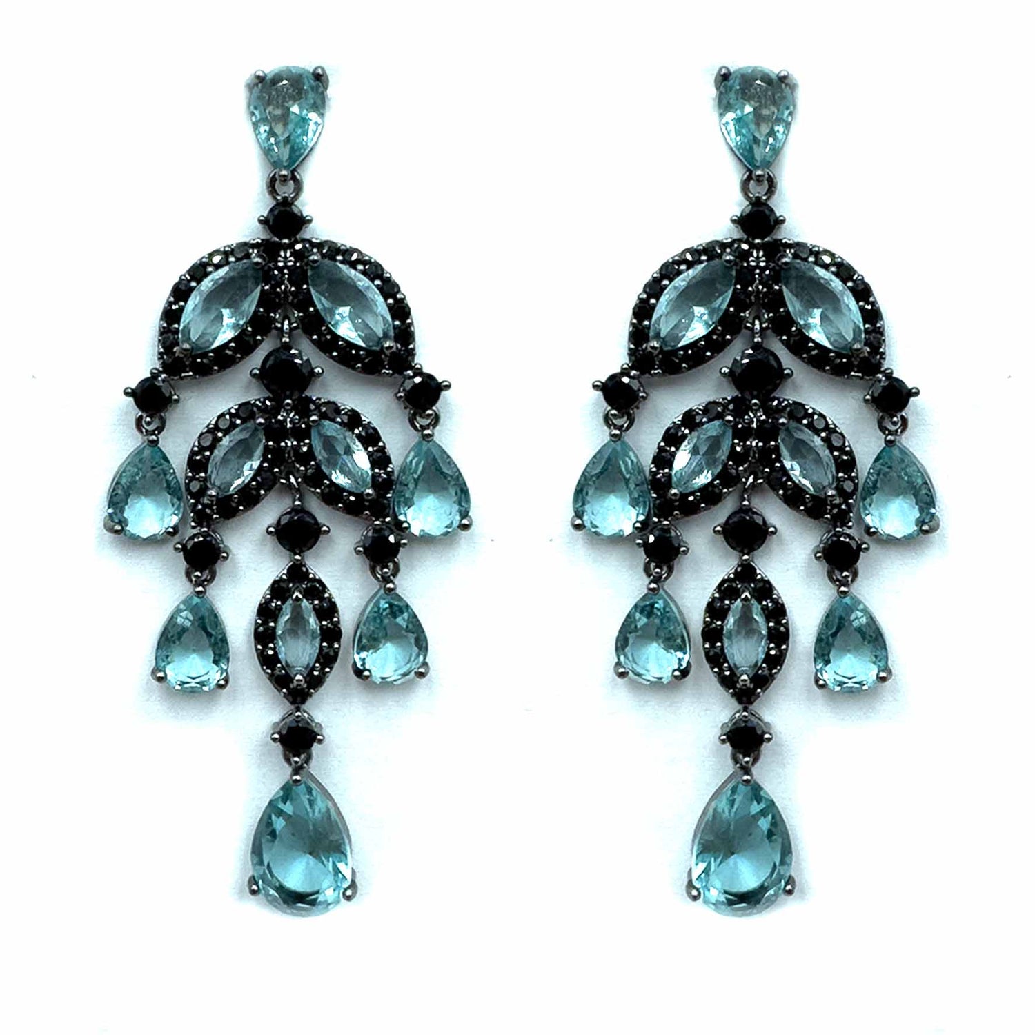 Orecchini pendenti a forma di cascata di gocce, con cristalli azzurri e pietrine nere, placcati dark