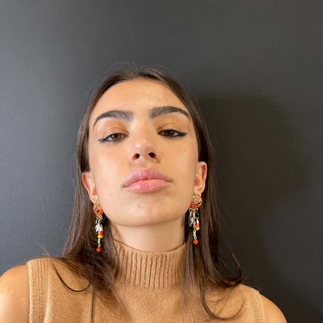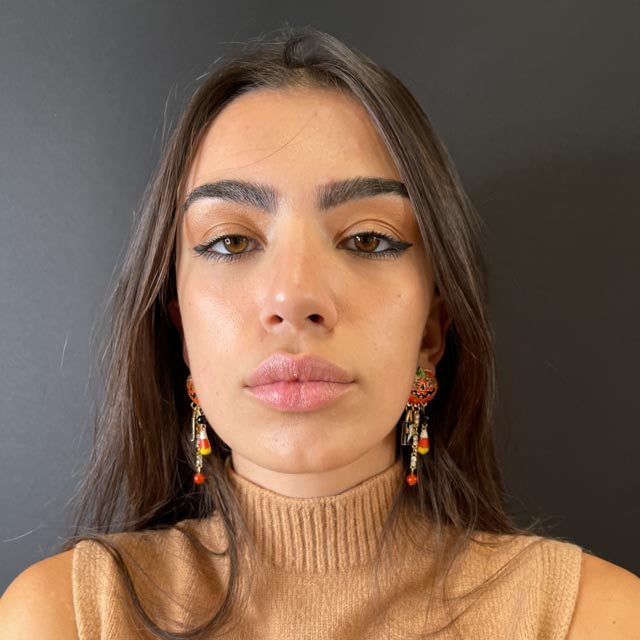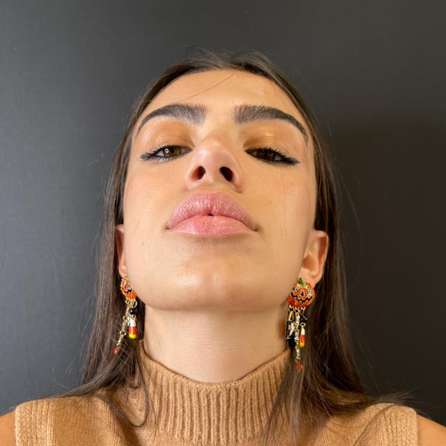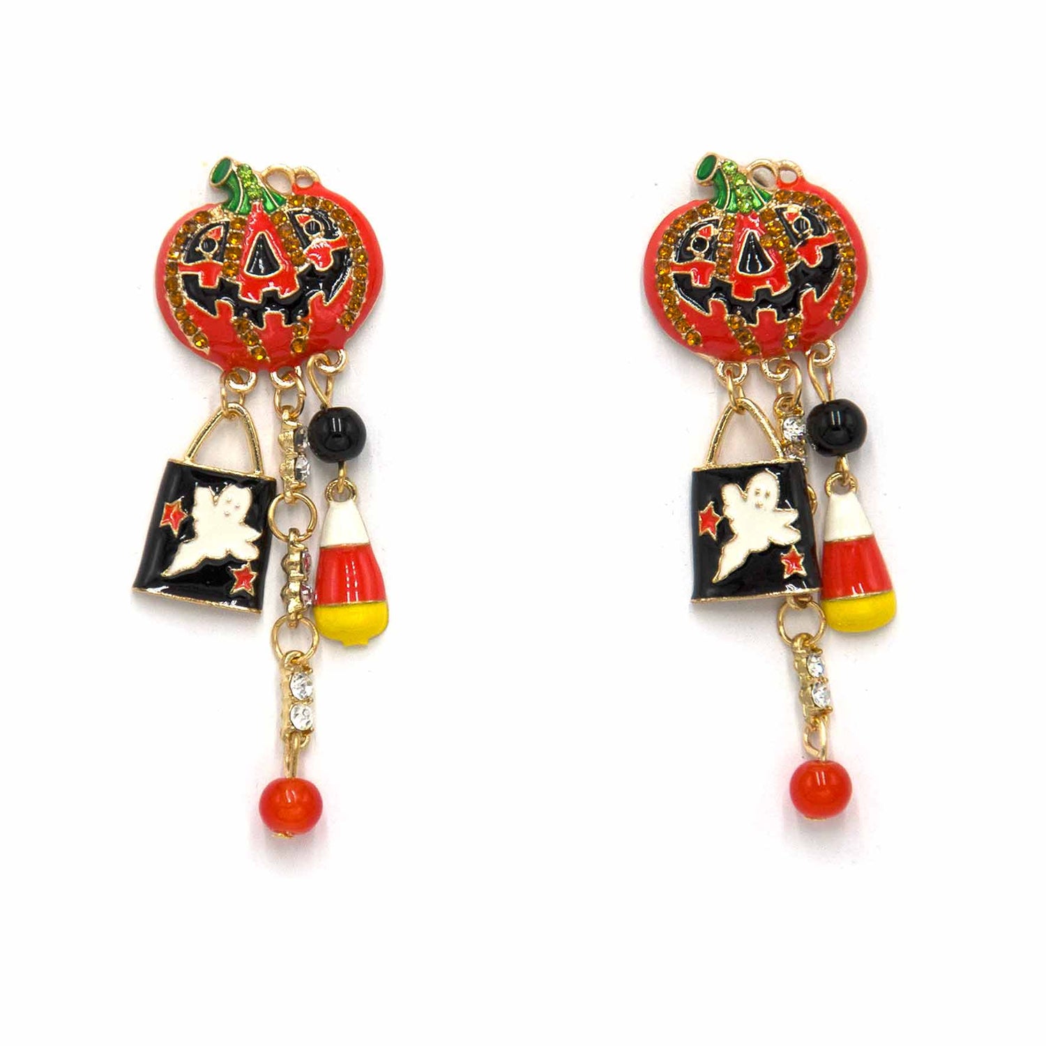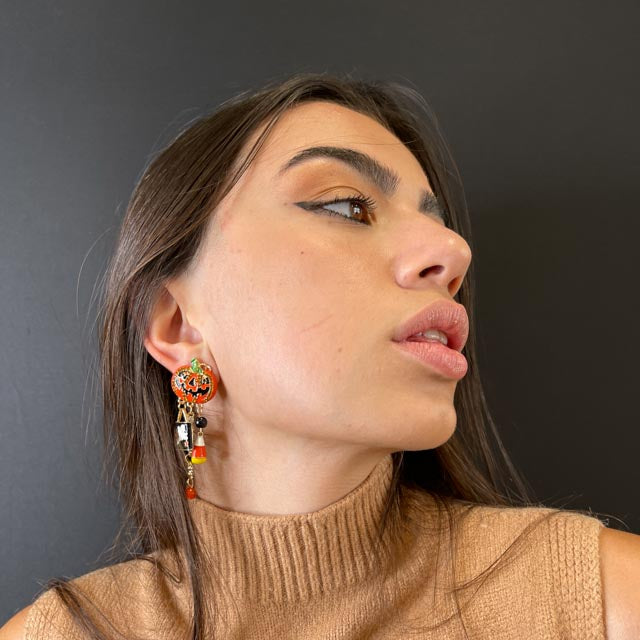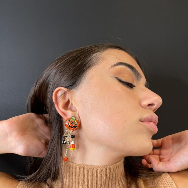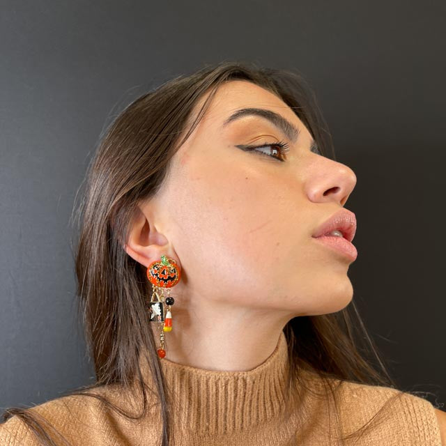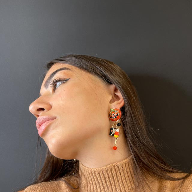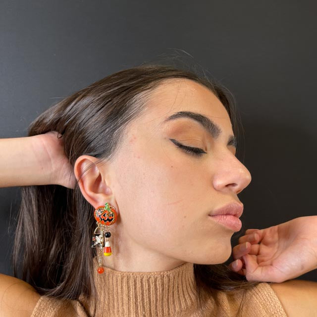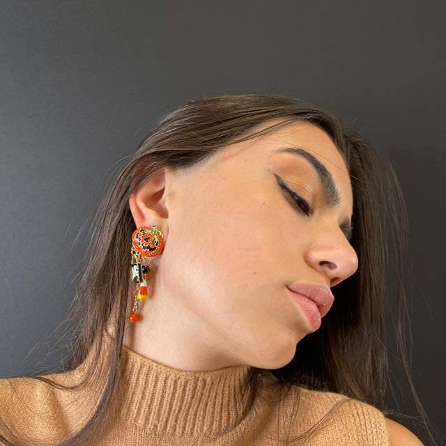Orecchini a forma di zucche con zirconi e pietre colorate incastonate su tutta la superficie. Impreziosite da pendenti a tema Halloween.